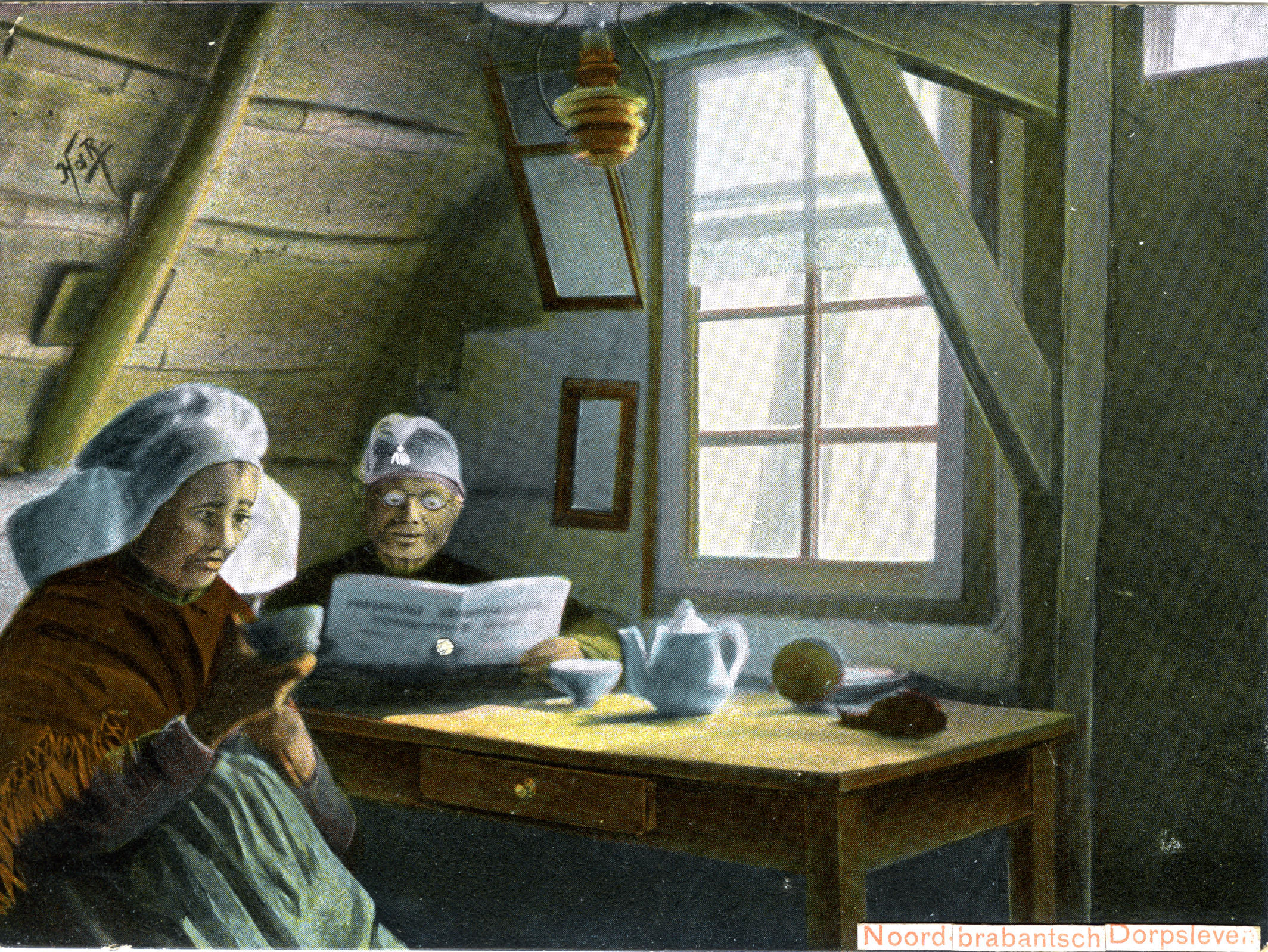 Vrouw en man in een interieur. De vrouw is gekleed in Noord-Brabantse streekdracht. De man draagt een slaapmuts. De kaart is rondom bijgeknipt.