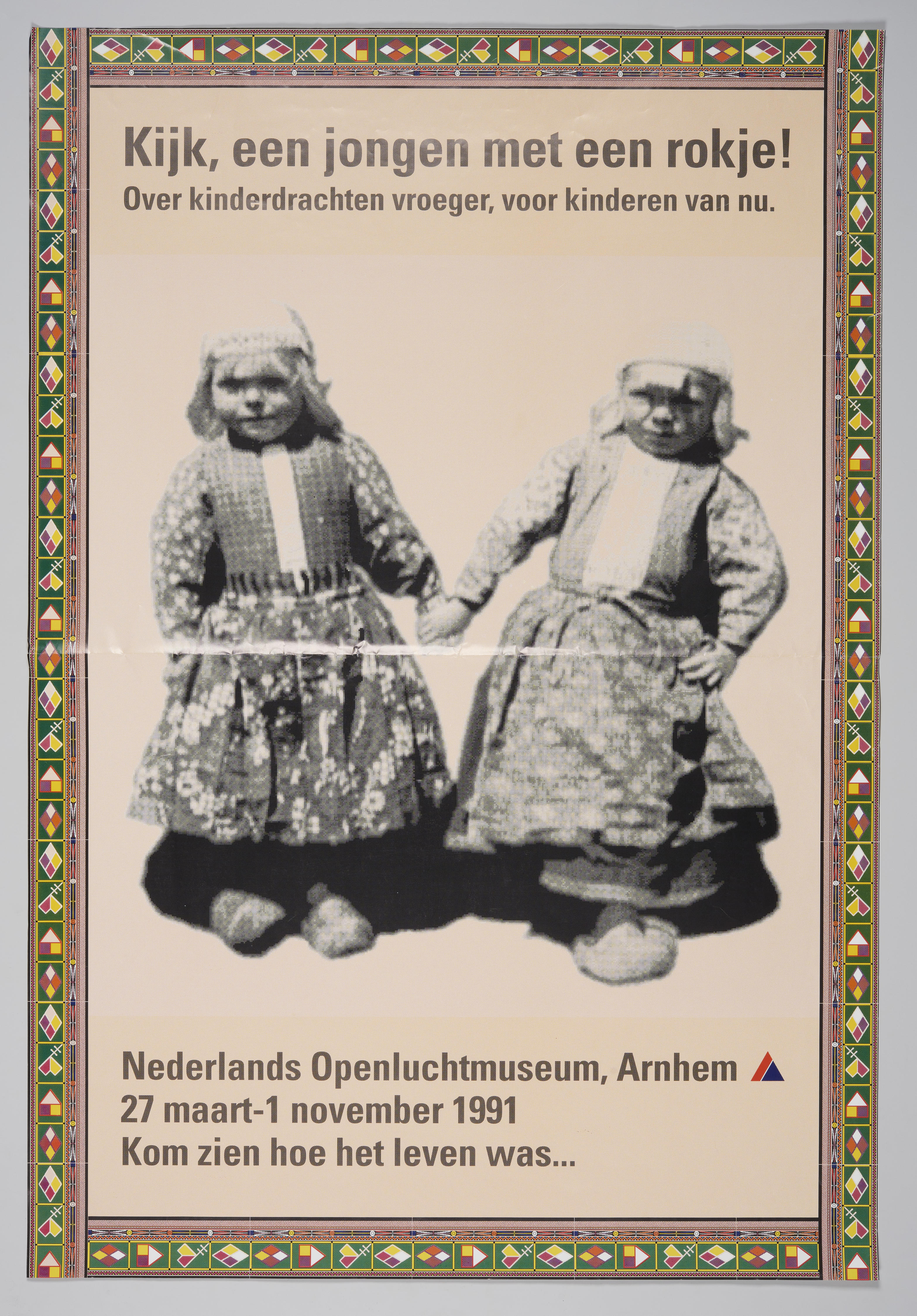 Affiche van de tentoonstelling 'Kijk, een jongen met een rokje!', die van 27 maart tot en met 1 november 1991 in het Nederlands Openluchtmuseum te zien was. Op het affiche staat een foto van twee jongetjes in Marker dracht.
