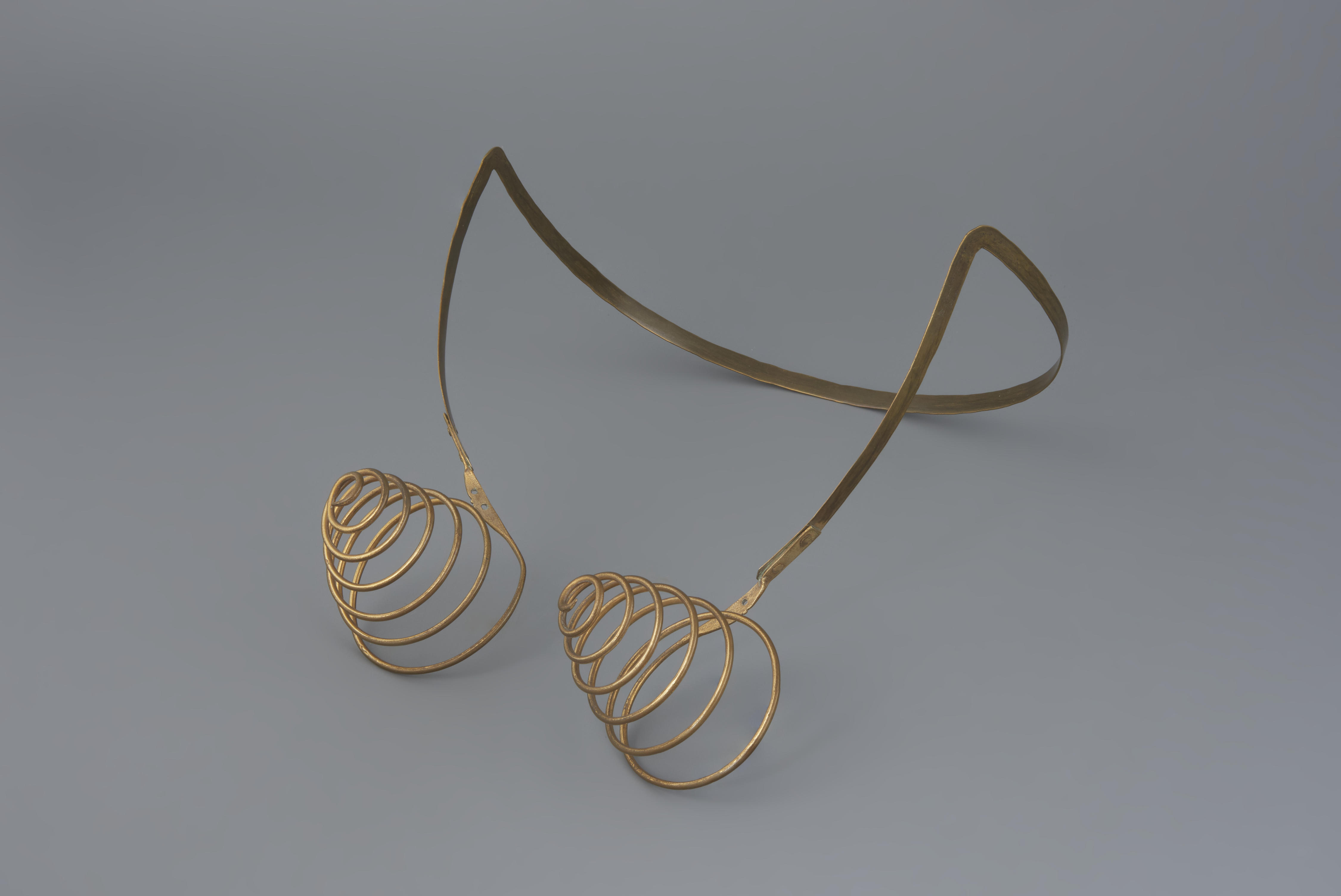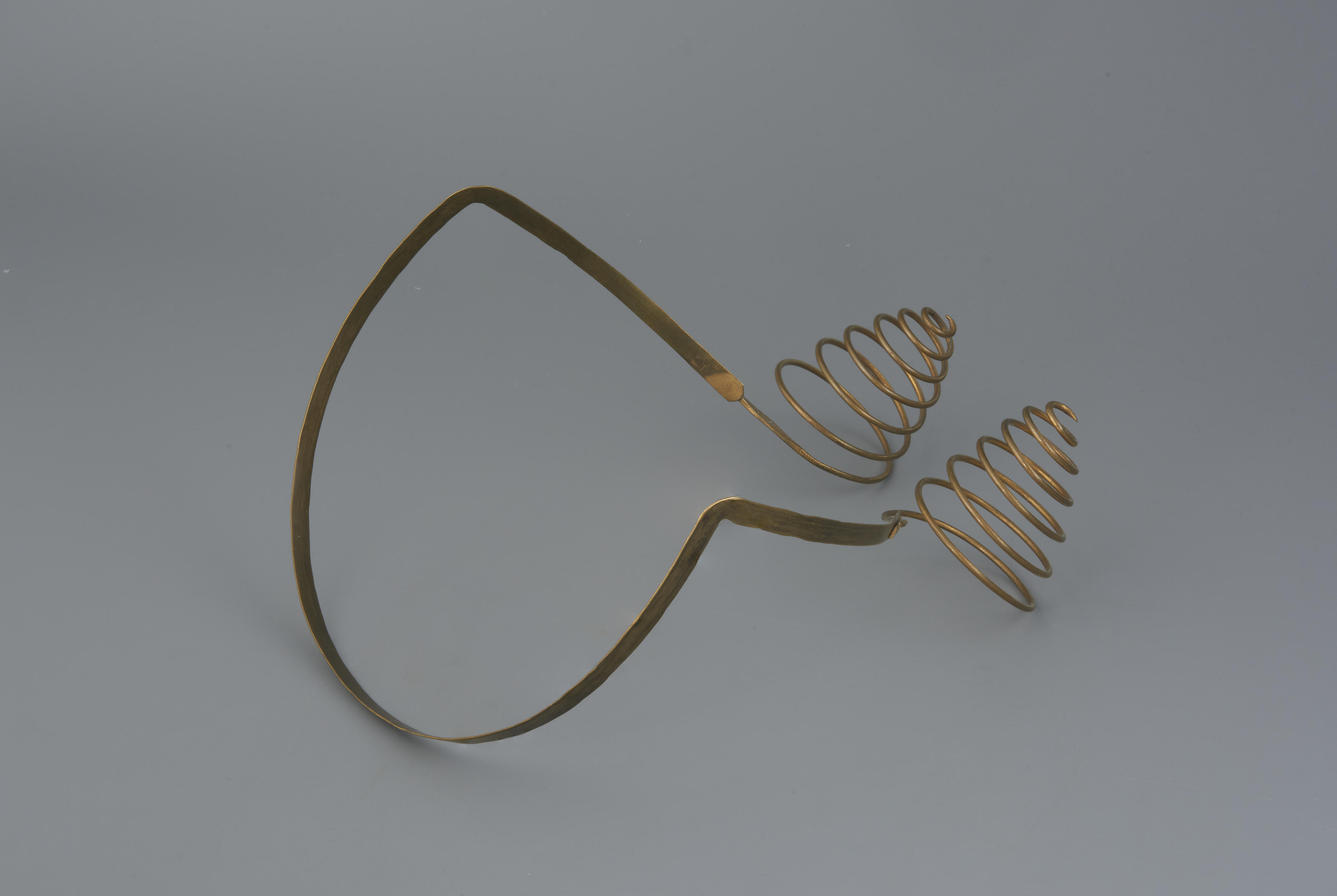 Verguld messing oorijzer, gedragen door Kommertje van der Laan-Faasse (1879-1969). Mevrouw van der Laan droeg de streekdracht van Sommelsdijk, ook nadat ze naar Vlaardingen was verhuisd. De vervaardiger van het oorijzer is onbekend.