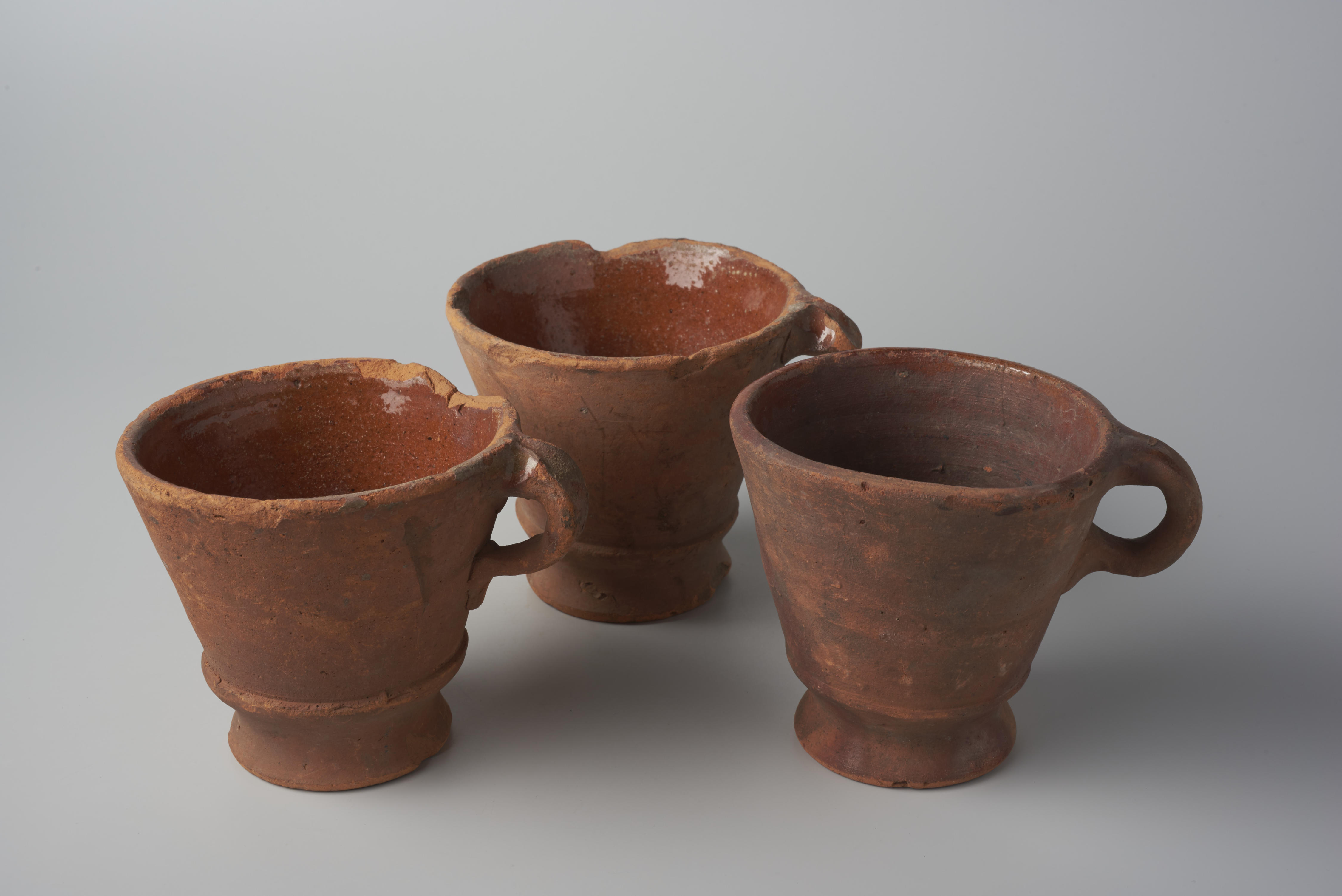 Drie aardbeikoppen. In deze koppen werden vroeger op de markt aardbeien geschept en per kop verkocht.