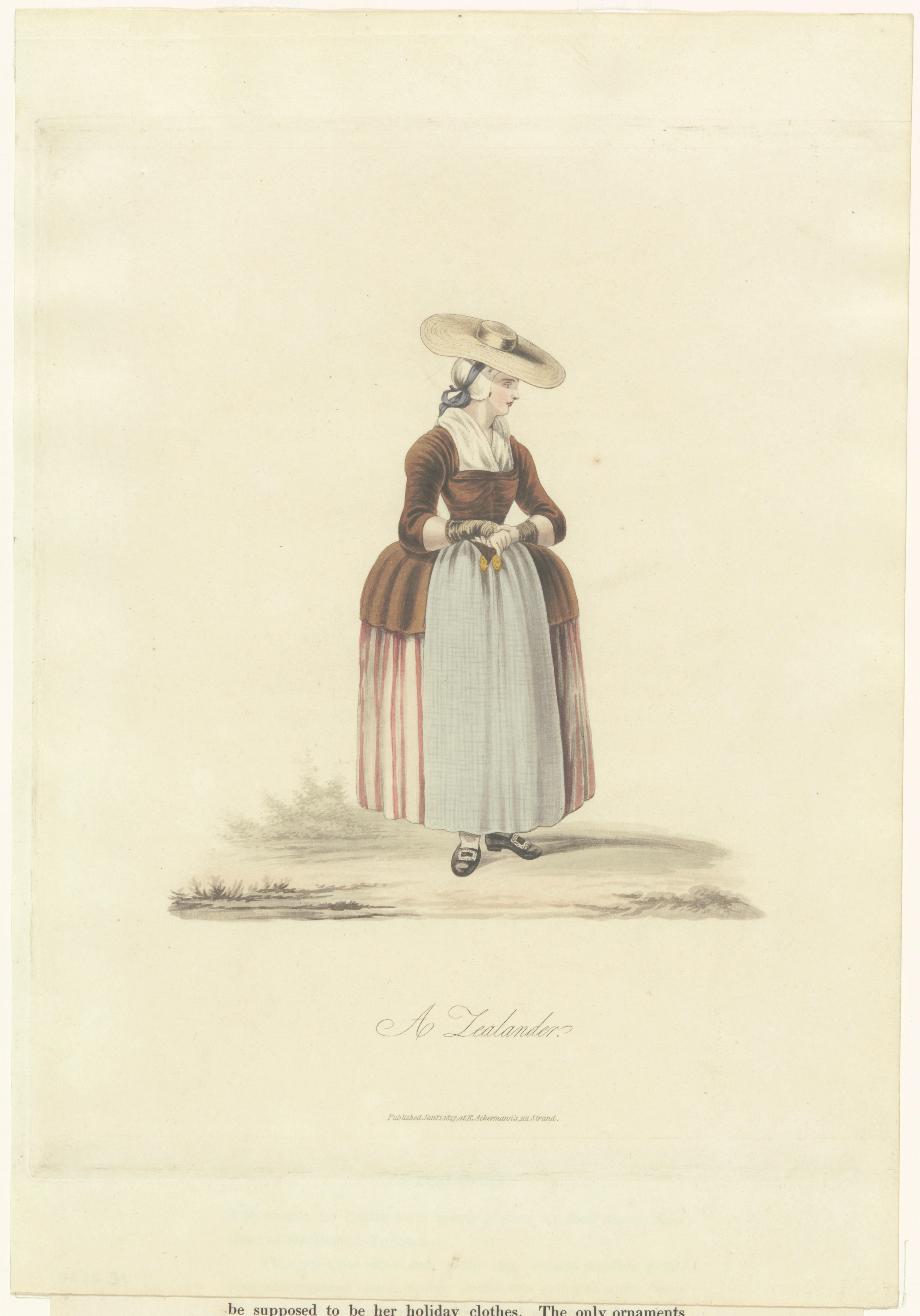 Handgekleurde gravure van een vrouw in Zeeuwse dracht. De gravure is gepubliceerd als plaat 20 in ‘The costume of the Netherlands, displayed in thirty coloured engravings after drawings from nature’ van miss Semple. Dit werk is 1817 uitgegeven door R. Ackermann in Londen.