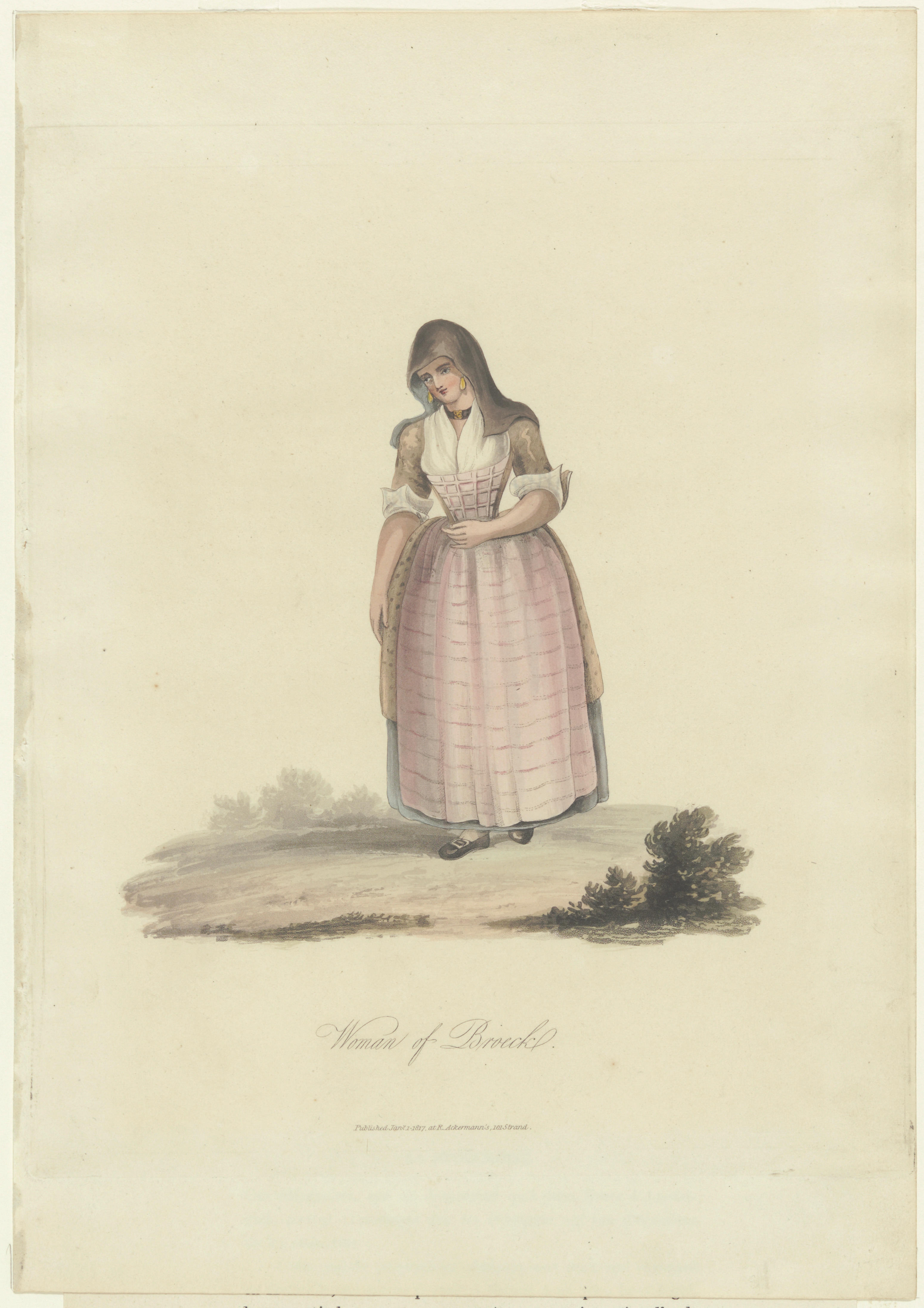 Handgekleurde gravure van een vrouw in de dracht van Broeck. De gravure is gepubliceerd als plaat 14 in ‘The costume of the Netherlands, displayed in thirty coloured engravings after drawings from nature’ van miss Semple. Dit werk is 1817 uitgegeven door R. Ackermann in Londen.