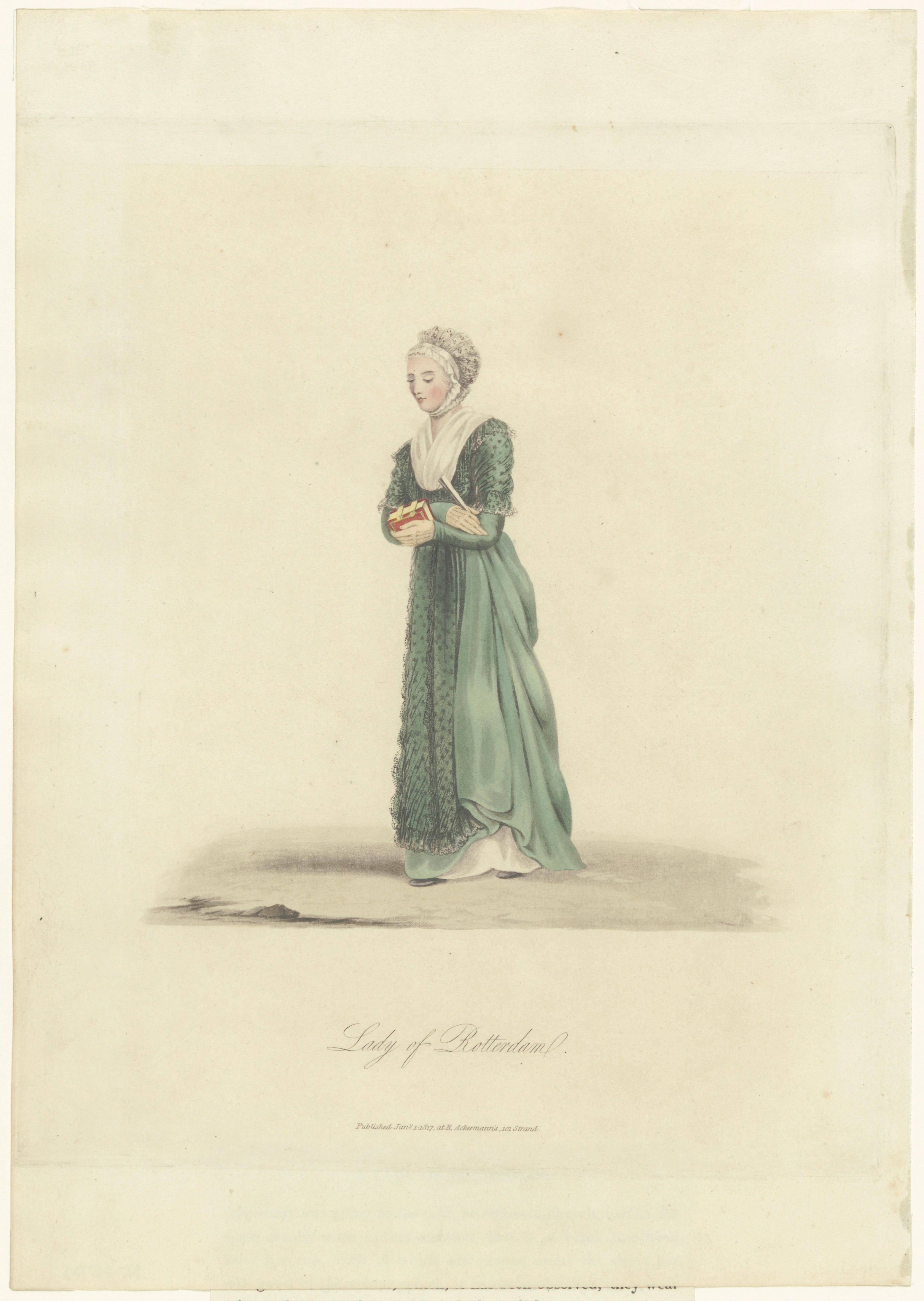 Handgekleurde gravure van een kerkgaande vrouw in Rotterdam. De gravure is gepubliceerd als plaat 3 in ‘The costume of the Netherlands, displayed in thirty coloured engravings after drawings from nature’ van miss Semple. Dit werk is 1817 uitgegeven door R. Ackermann in Londen.