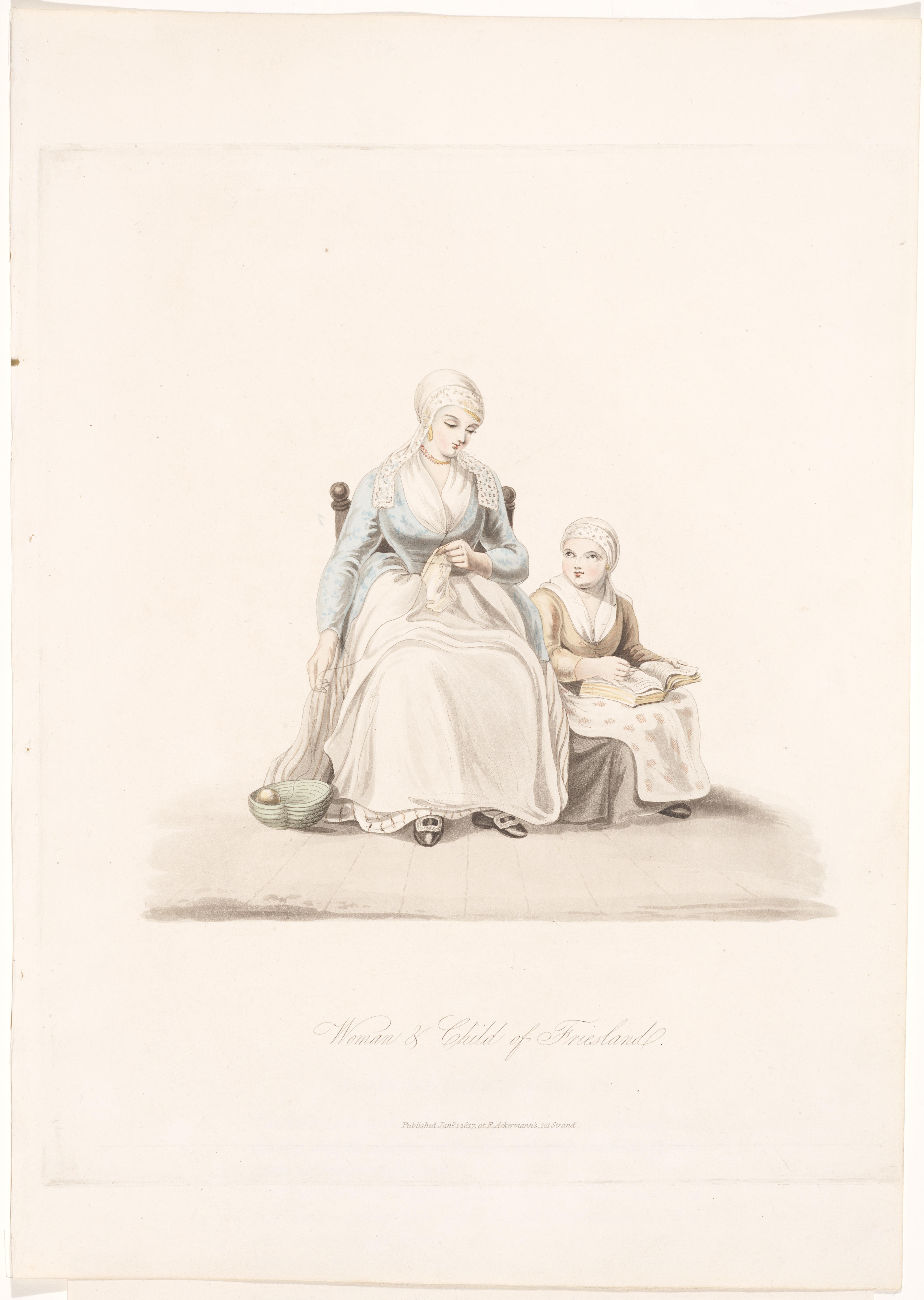 Handgekleurde gravure van een breiende vrouw uit Friesland met haar kind. De gravure is gepubliceerd als plaat 18 in ‘The costume of the Netherlands, displayed in thirty coloured engravings after drawings from nature’ van miss Semple. Dit werk is 1817 uitgegeven door R. Ackermann in Londen.