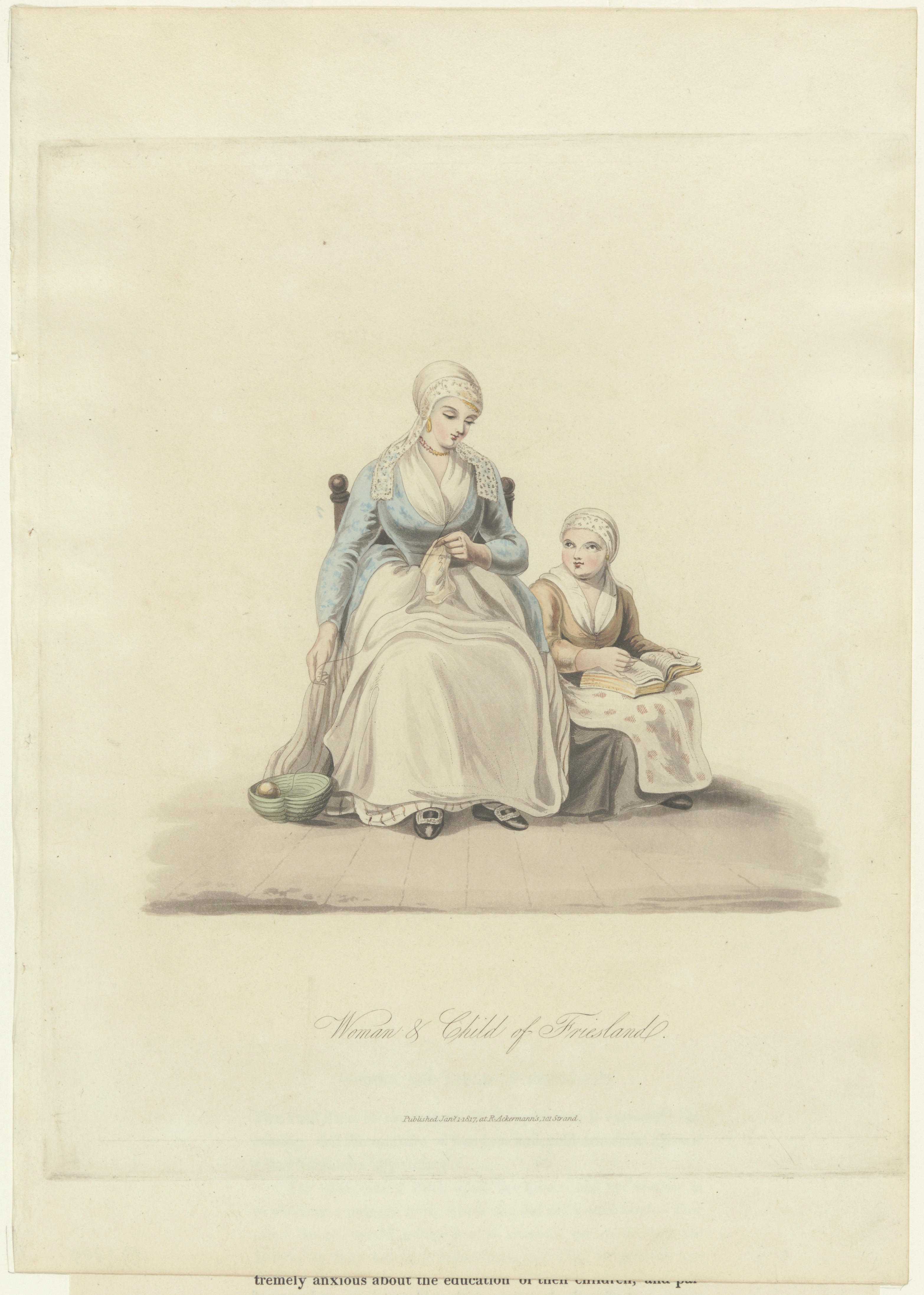 Handgekleurde gravure van de vrouw van de veerman van Willemstad, bezig met de bereiding van thee. De gravure is gepubliceerd als plaat 15 in ‘The costume of the Netherlands, displayed in thirty coloured engravings after drawings from nature’ van miss Semple. Dit werk is 1817 uitgegeven door R. Ackermann in Londen.