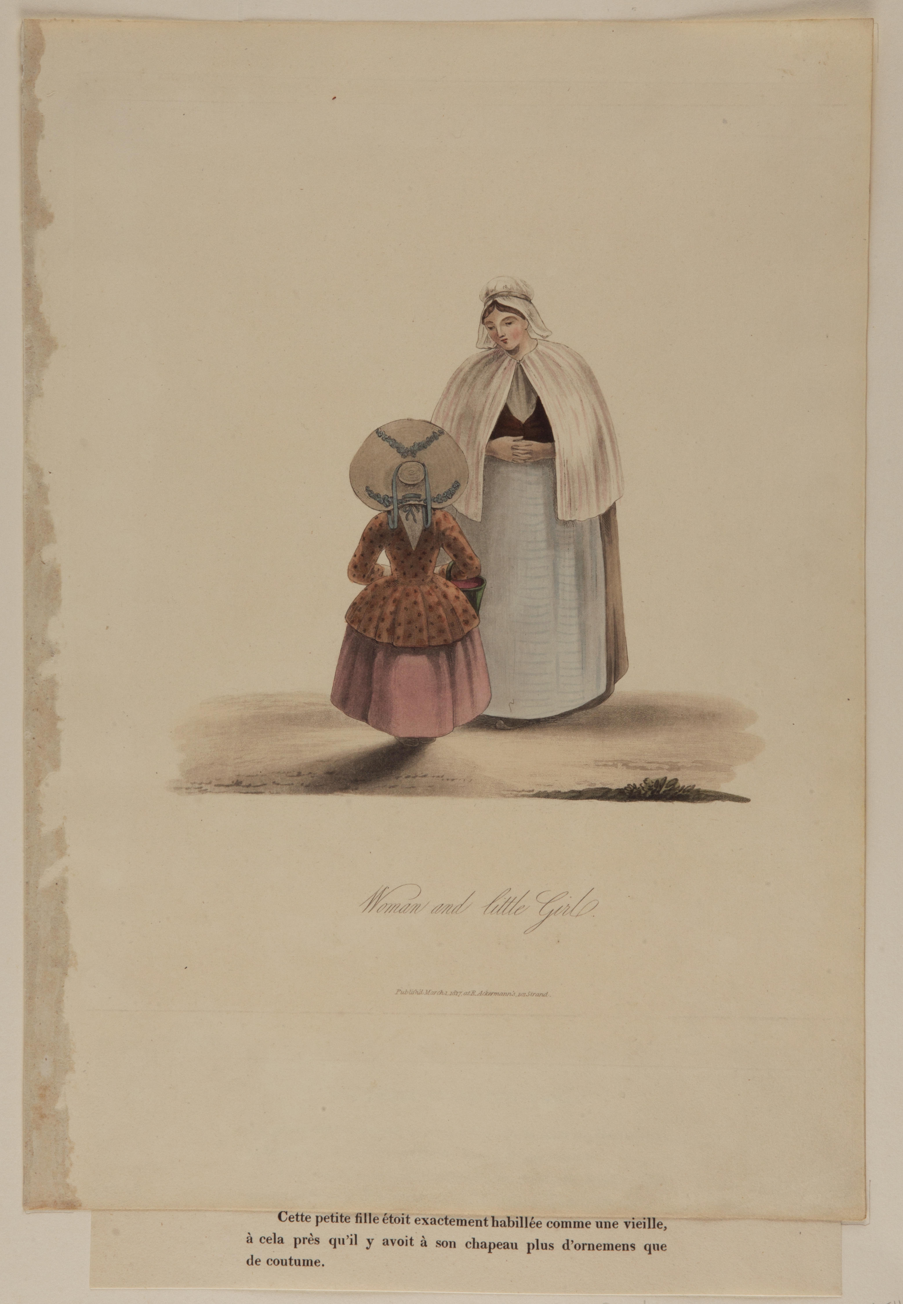 Handgekleurde gravure van een vrouw en een klein meisje in Rotterdam. De gravure is gepubliceerd als plaat 4 in ‘The costume of the Netherlands, displayed in thirty coloured engravings after drawings from nature’ van miss Semple. Dit werk is 1817 uitgegeven door R. Ackermann in Londen.