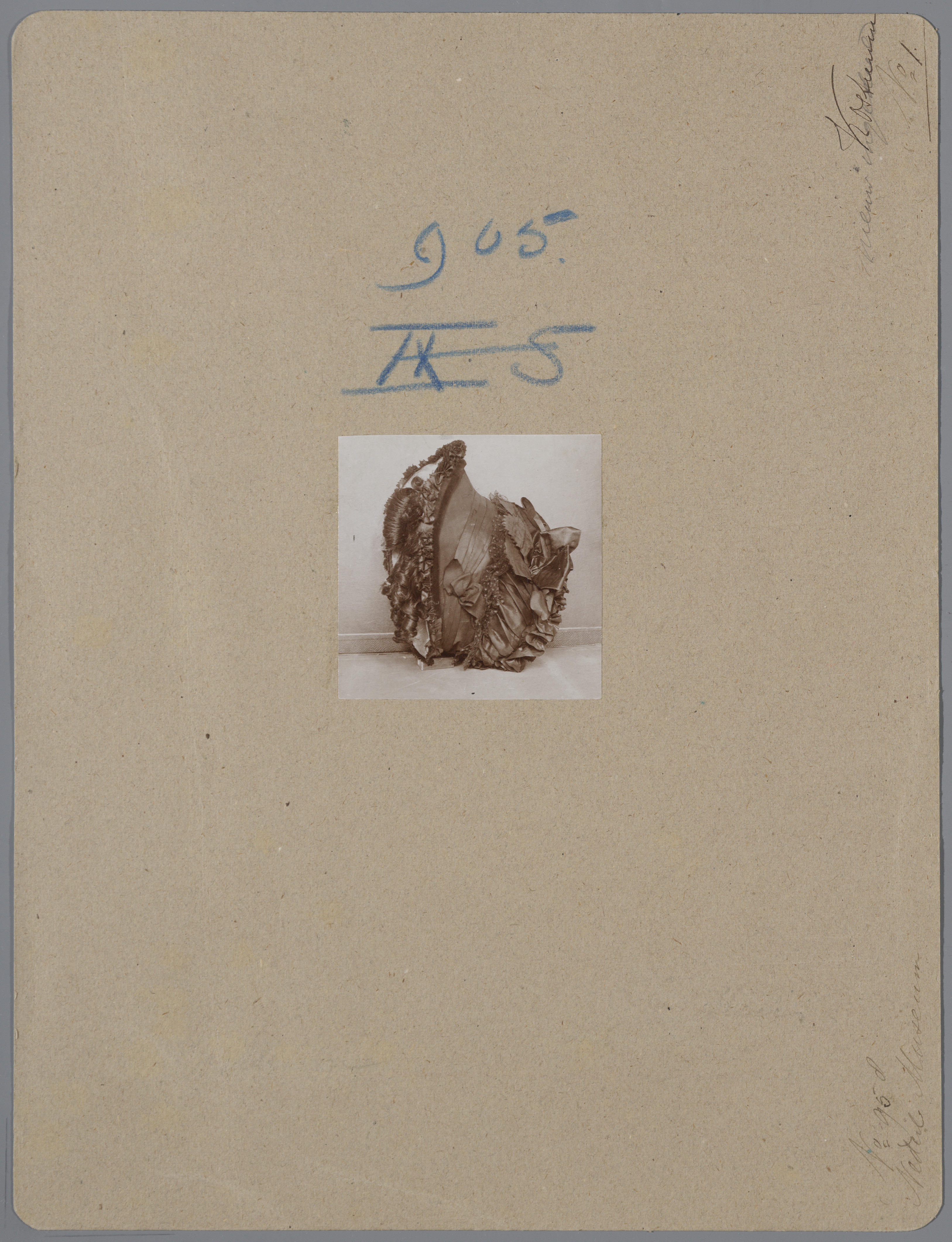 Karton met daarop een foto van een hoedje dat op de tentoonstelling Nationale Kleederdrachten van Harer Majesteits onderdanen in 1898 in Amsterdam werd getoond.