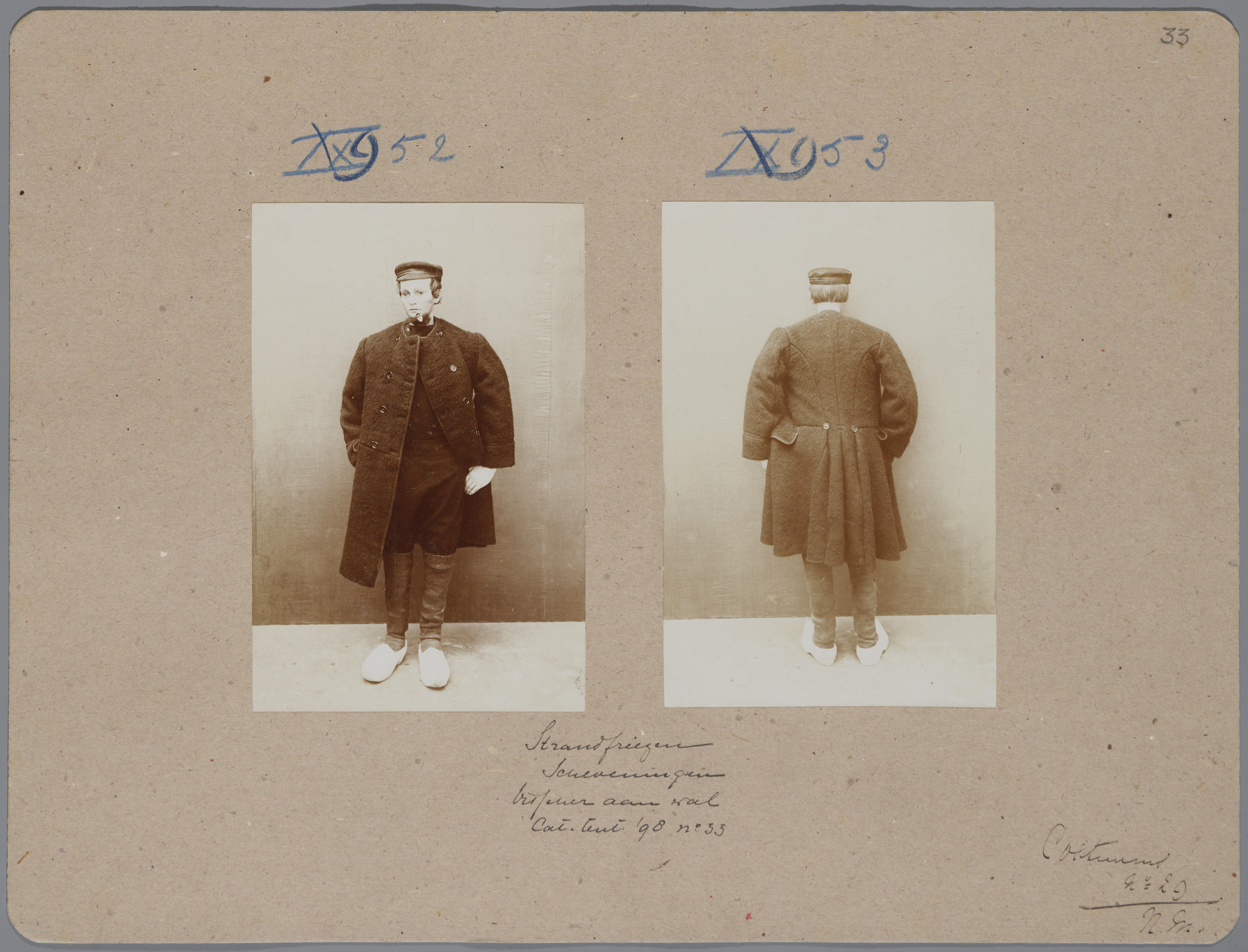 Karton met daarop twee foto's van een pop in het kostuum van een Scheveningse visser, die op de tentoonstelling Nationale Kleederdrachten van Harer Majesteits onderdanen in 1898 in Amsterdam werd getoond en aantekeningen die verwijzen naar de catalogus.
