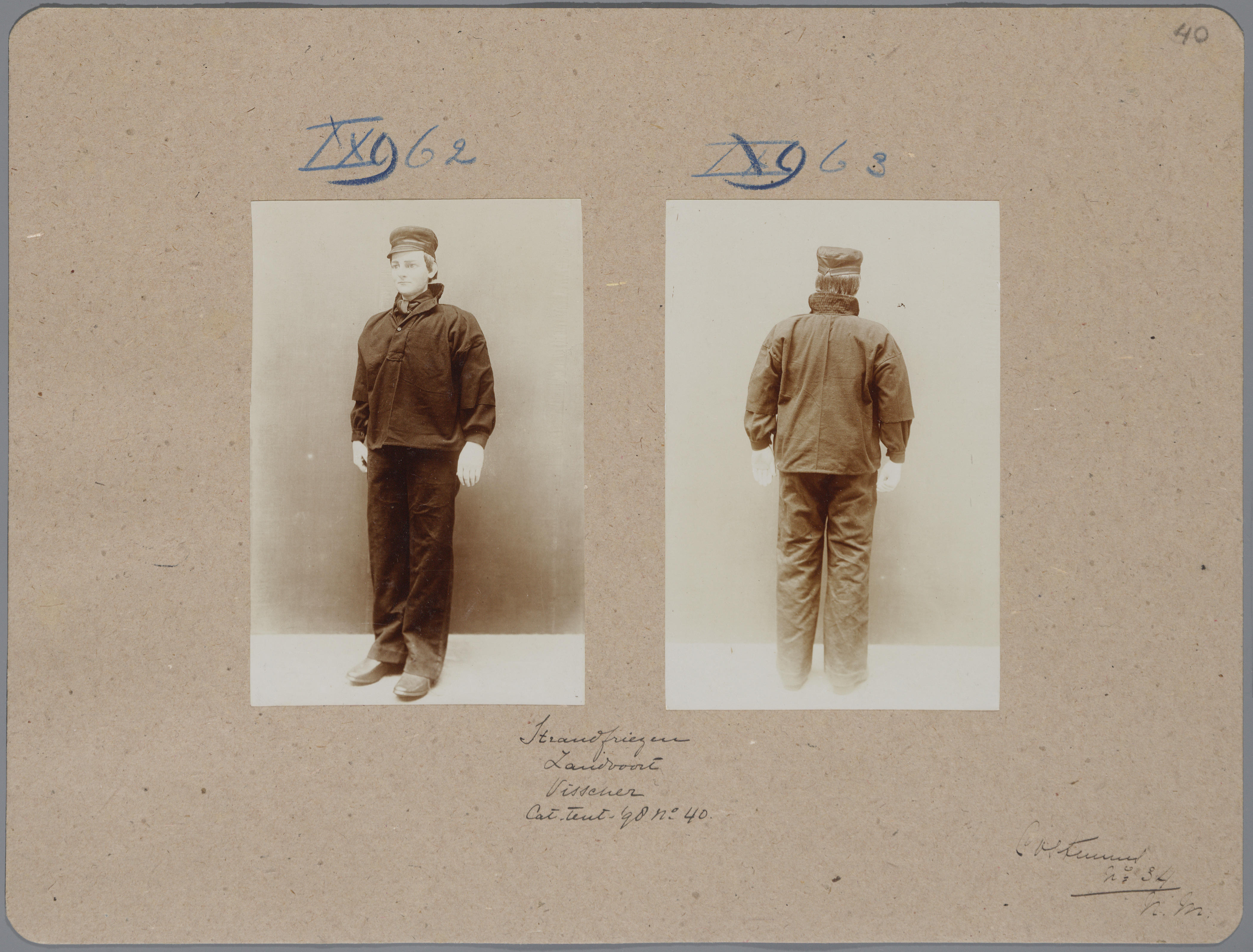 Karton met daarop twee foto's van een pop in het kostuum van een Zandvoortse visser, die op de tentoonstelling Nationale Kleederdrachten van Harer Majesteits onderdanen in 1898 in Amsterdam werd getoond en aantekeningen die verwijzen naar de catalogus.