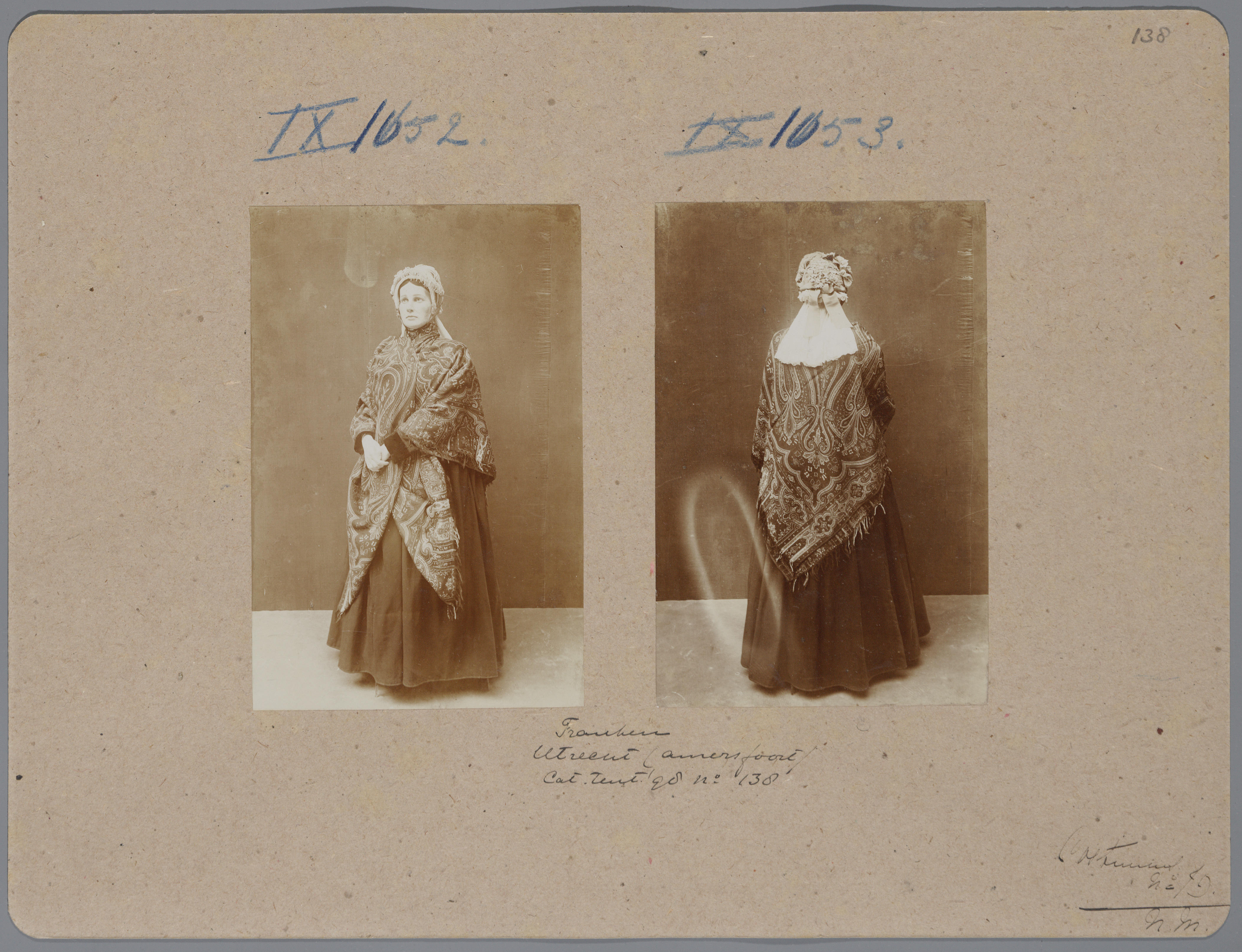 Karton met daarop twee foto's van een pop in het kostuum van een burgervrouw uit Amersfoort, die op de tentoonstelling Nationale Kleederdrachten van Harer Majesteits onderdanen in 1898 in Amsterdam werd getoond en aantekeningen die verwijzen naar de catalogus.