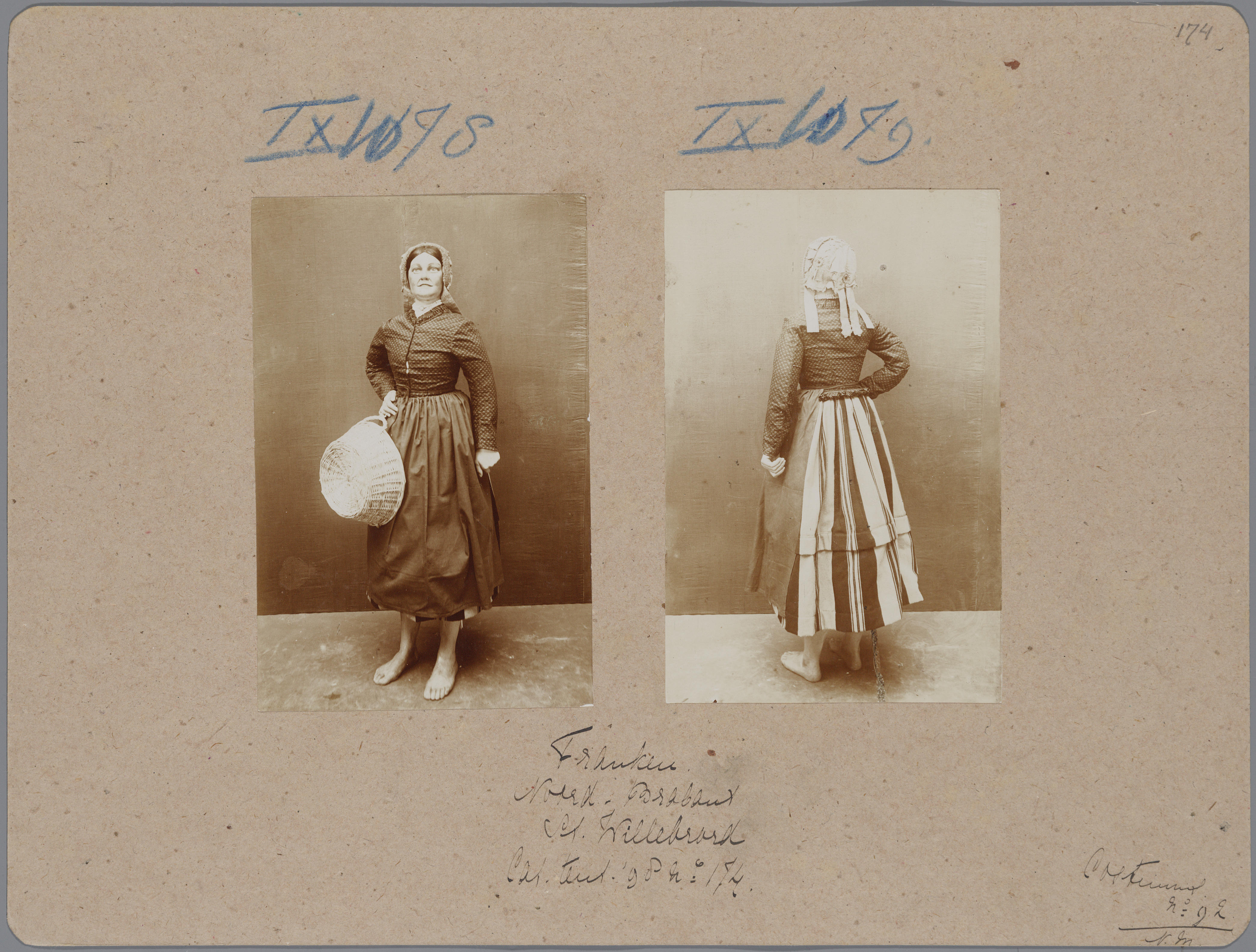 Karton met daarop twee foto's van een pop in het kostuum van een vrouw uit St. Willebrord, die op de tentoonstelling Nationale Kleederdrachten van Harer Majesteits onderdanen in 1898 in Amsterdam werd getoond en aantekeningen die verwijzen naar de catalogus. De bijbehorende catalogustekst luidt: ‘Gelegen op voormaals betwist gebied, zoodat er alle toezicht ontbrak en ...