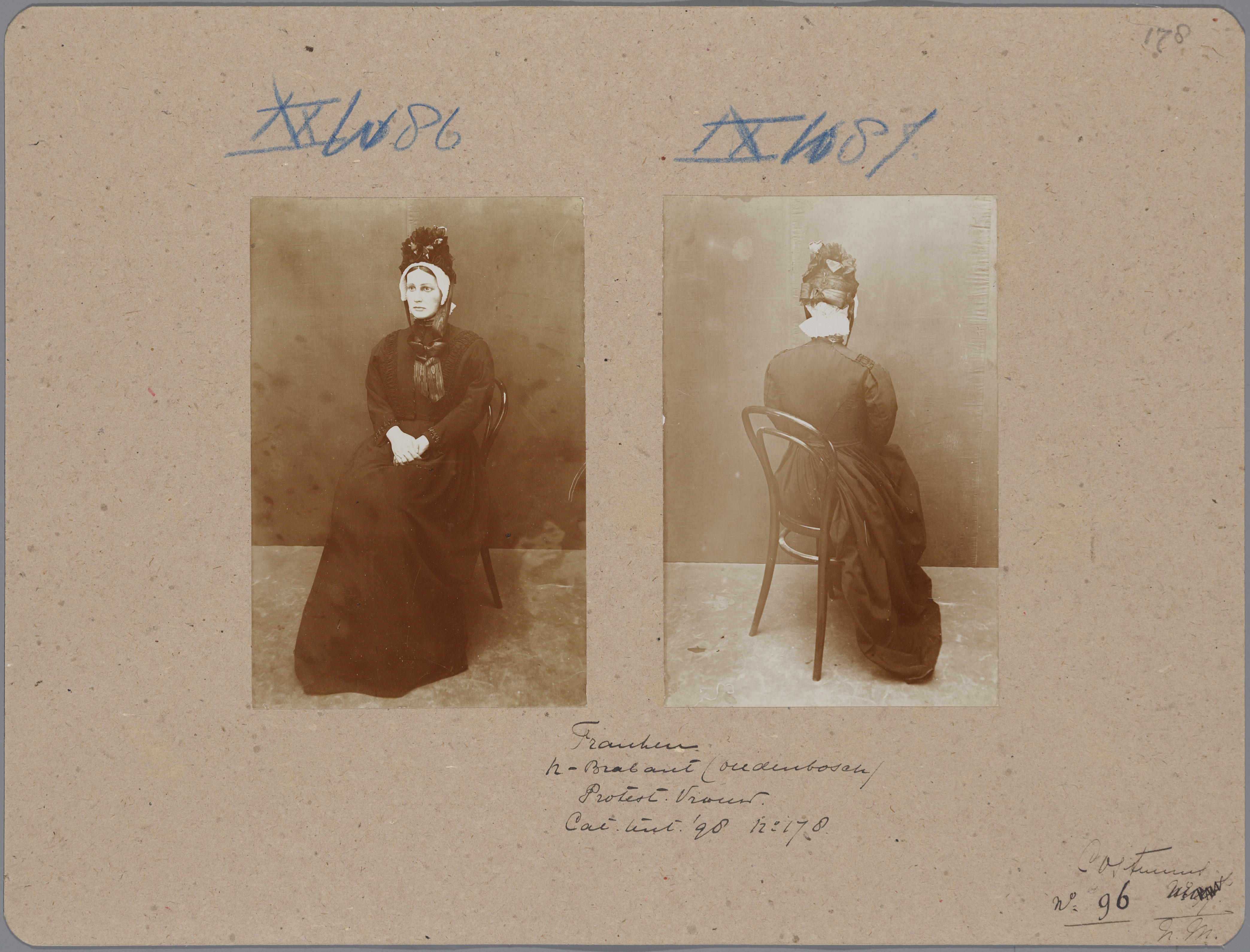 Karton met daarop twee foto's van een pop in het kostuum van een protestantse vrouw uit Oudenbosch in daagse dracht, die op de tentoonstelling Nationale Kleederdrachten van Harer Majesteits onderdanen in 1898 in Amsterdam werd getoond en aantekeningen die verwijzen naar de catalogus.
