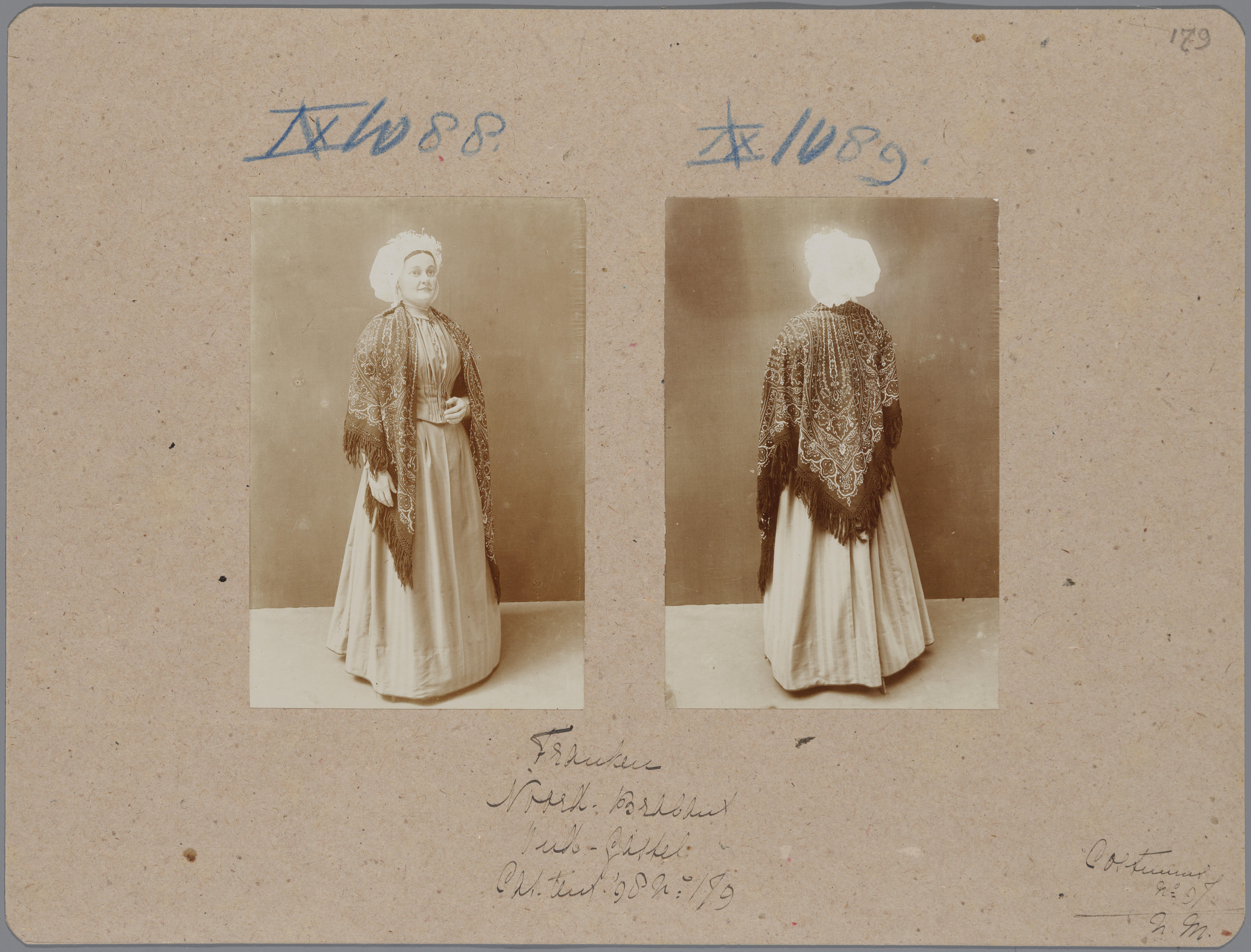 Karton met daarop twee foto's van een pop in het kostuum van een oude burgervrouw uit Oud-Gastel, die op de tentoonstelling Nationale Kleederdrachten van Harer Majesteits onderdanen in 1898 in Amsterdam werd getoond en aantekeningen die verwijzen naar de catalogus. De bijbehorende catalogustekst luidt: ‘Door jonge menschen wordt deze dracht niet meer gedragen.’