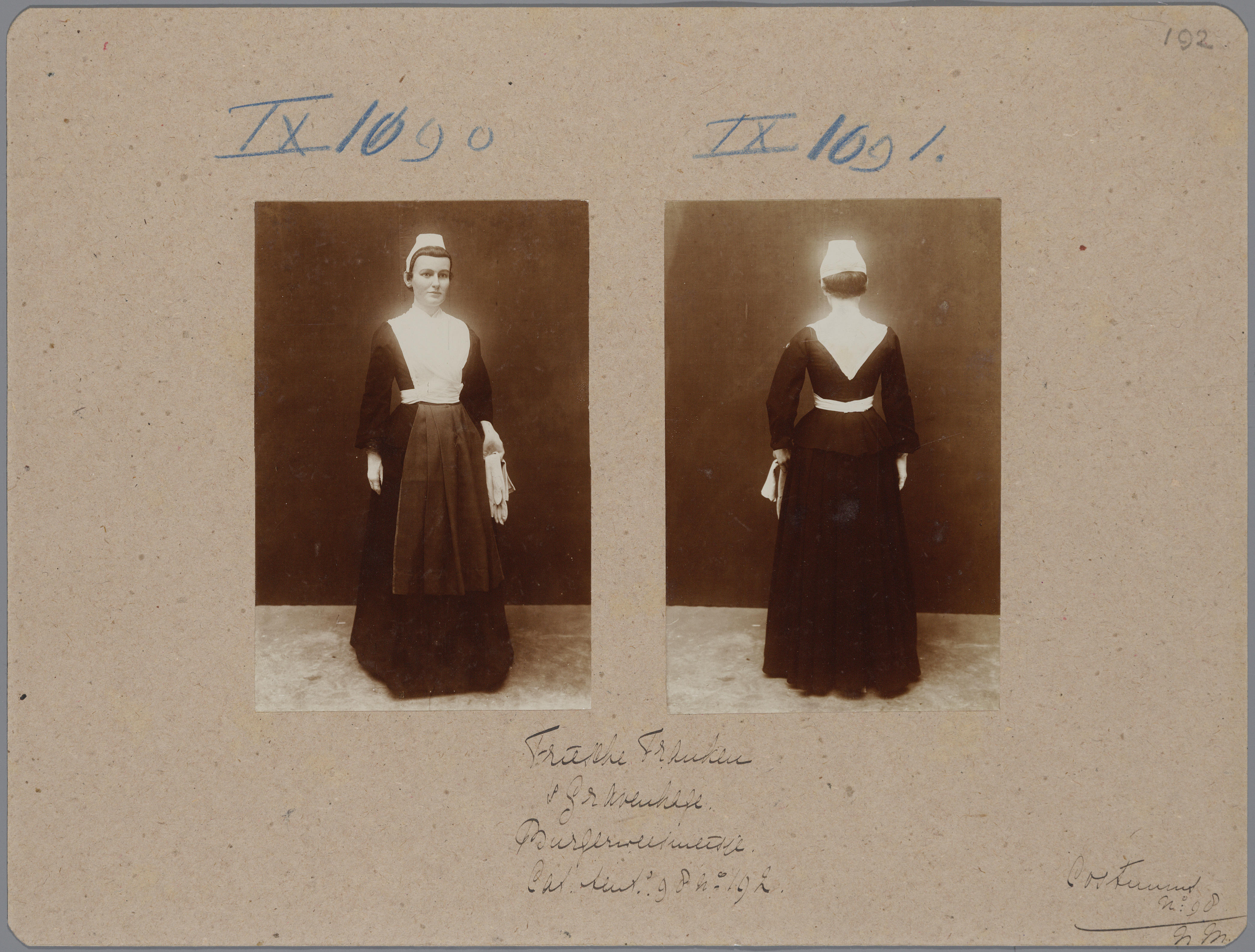 Karton met daarop twee foto's van een pop in het kostuum van een burgerweesmeisje uit 's-Gravenhage, die op de tentoonstelling Nationale Kleederdrachten van Harer Majesteits onderdanen in 1898 in Amsterdam werd getoond en aantekeningen die verwijzen naar de catalogus. De bijbehorende catalogustekst luidt: ‘Het oorijzer, zooals dit nog thans door de Haagsche Burgerweesmeisjes gedragen wordt, ...
