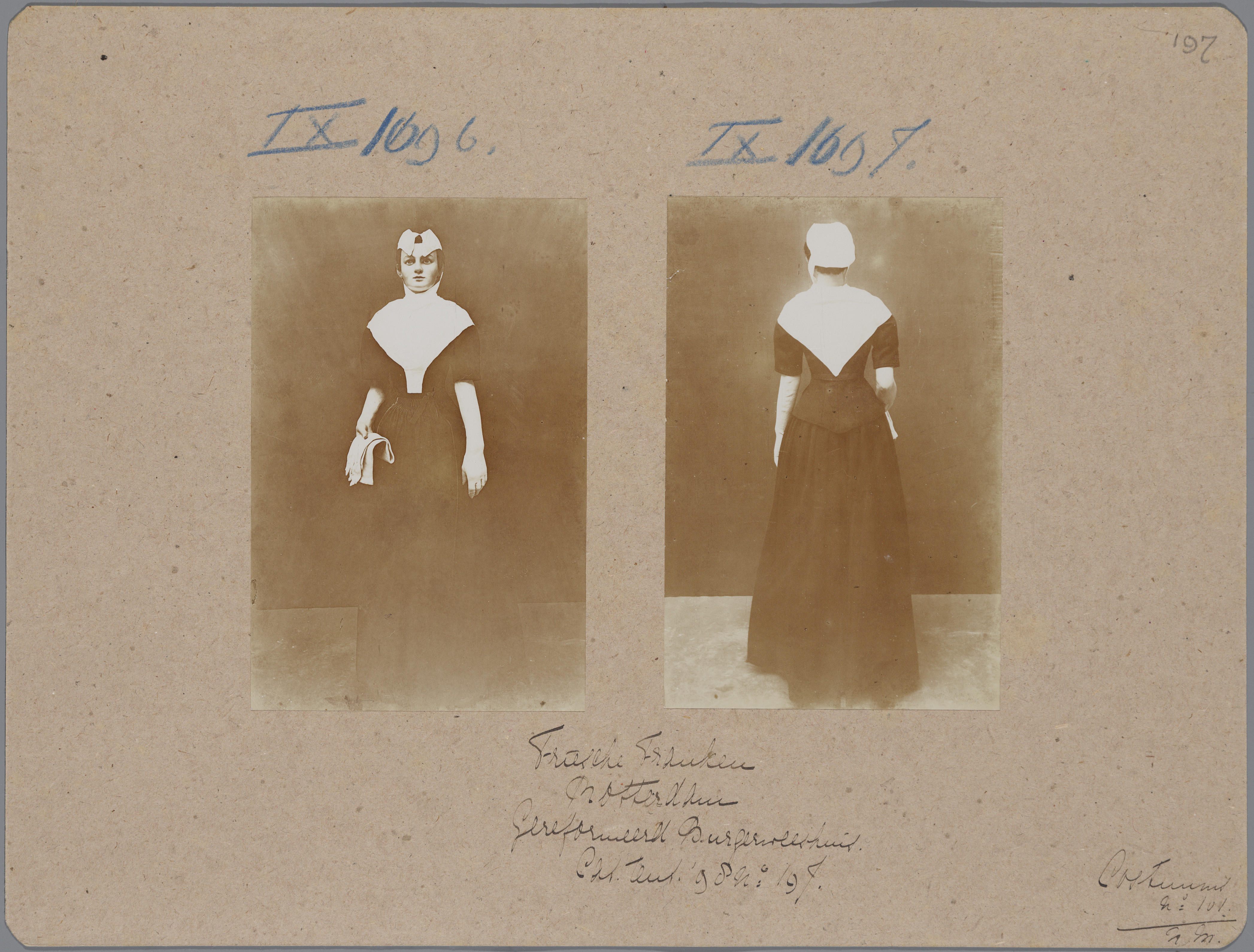 Karton met daarop twee foto's van een pop in het kostuum van een weesmeisje het Burgerweeshuis in Rotterdam, die op de tentoonstelling Nationale Kleederdrachten van Harer Majesteits onderdanen in 1898 in Amsterdam werd getoond en aantekeningen die verwijzen naar de catalogus.