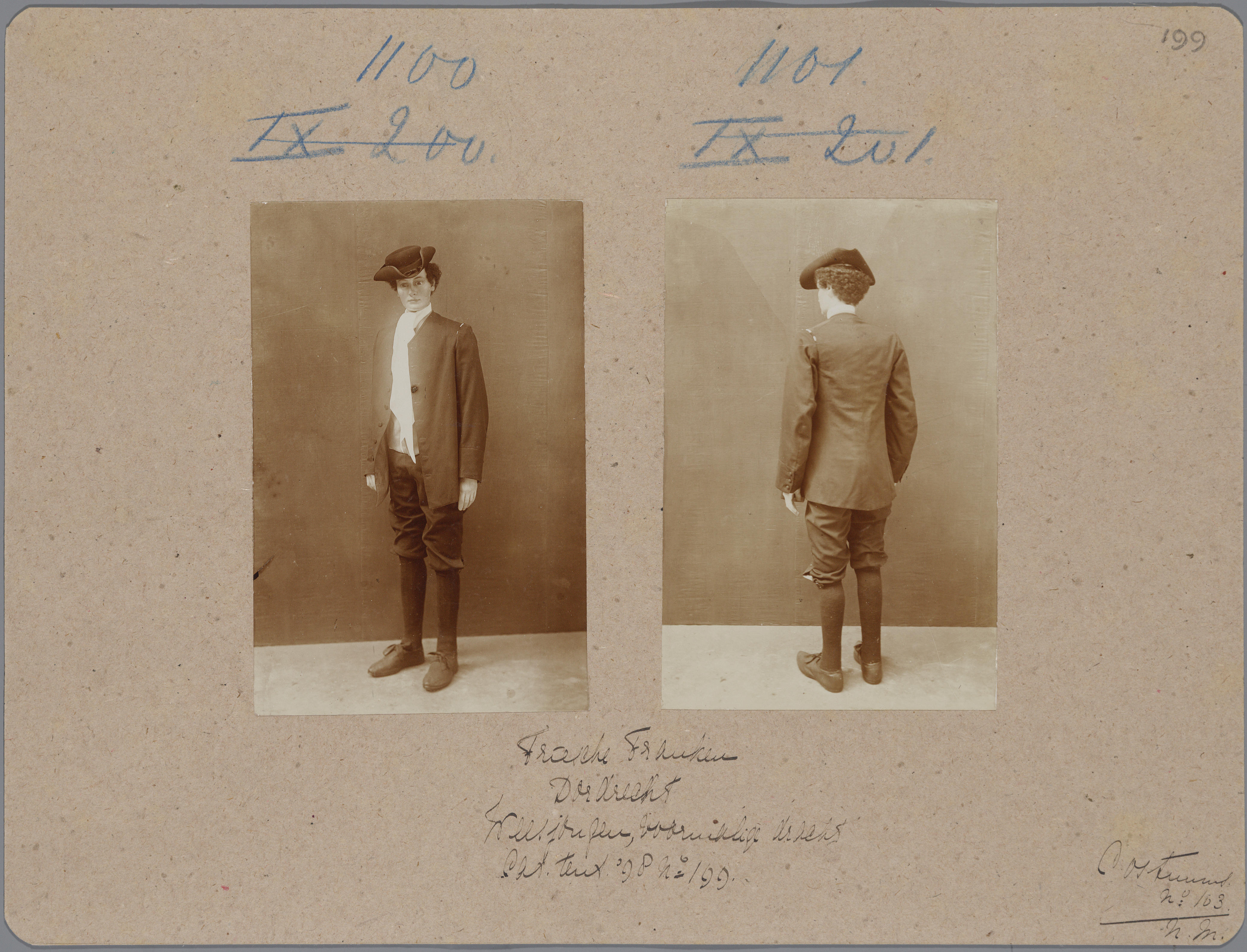 Karton met daarop twee foto's van een pop in het kostuum van een weesjongen uit Dordrecht, die op de tentoonstelling Nationale Kleederdrachten van Harer Majesteits onderdanen in 1898 in Amsterdam werd getoond en aantekeningen die verwijzen naar de catalogus. De bijbehorende catalogustekst luidt: ‘Op het oogenblik zijn de Dordsche weeskinderen zoogenaamd "gewoon" gekleed, wat niet ...
