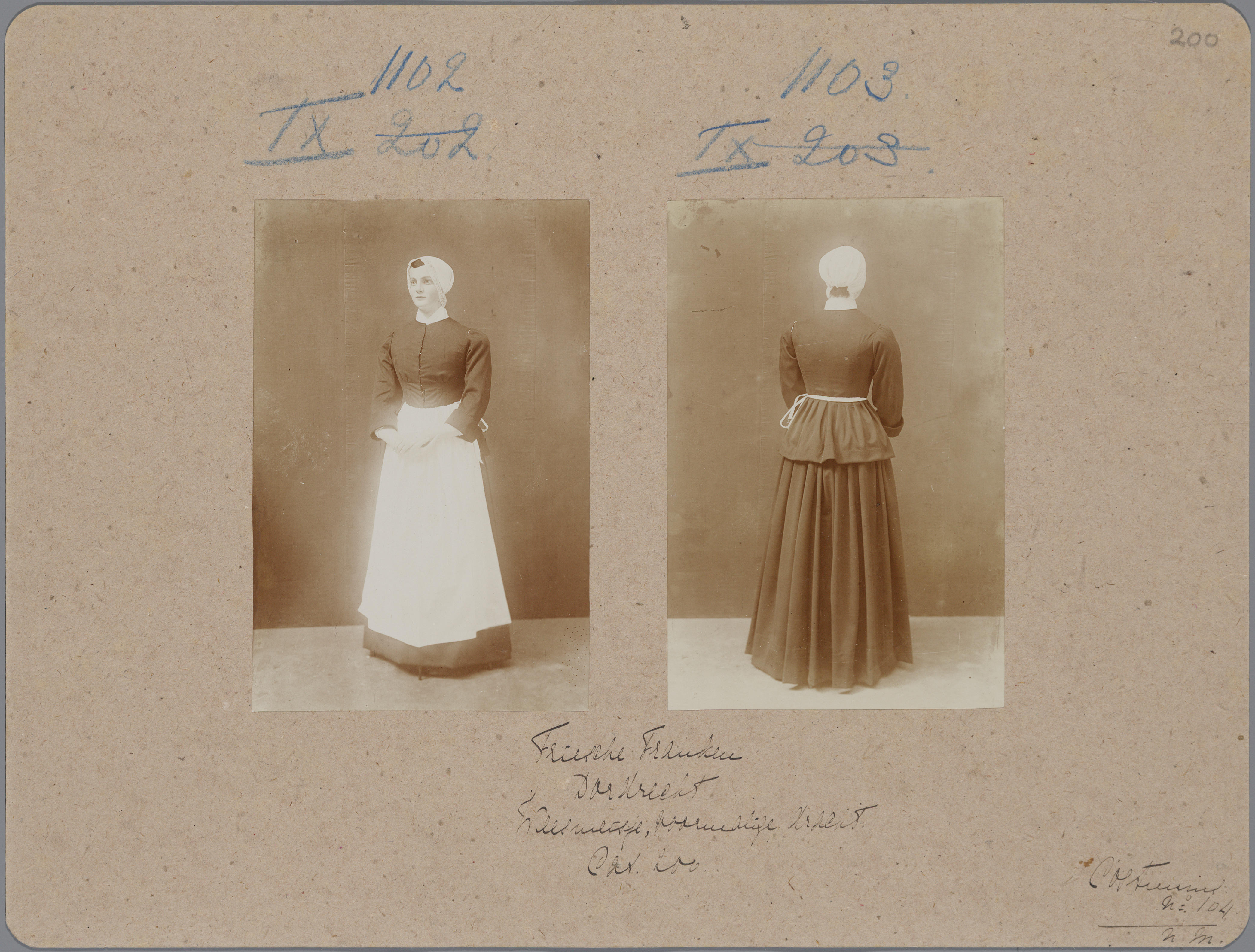 Karton met daarop twee foto's van een pop in het kostuum van een weesmeisje uit Dordrecht, die op de tentoonstelling Nationale Kleederdrachten van Harer Majesteits onderdanen in 1898 in Amsterdam werd getoond en aantekeningen die verwijzen naar de catalogus. De bijbehorende catalogustekst luidt: ‘Op het oogenblik zijn de Dordsche weeskinderen zoogenaamd "gewoon" gekleed, wat niet ...