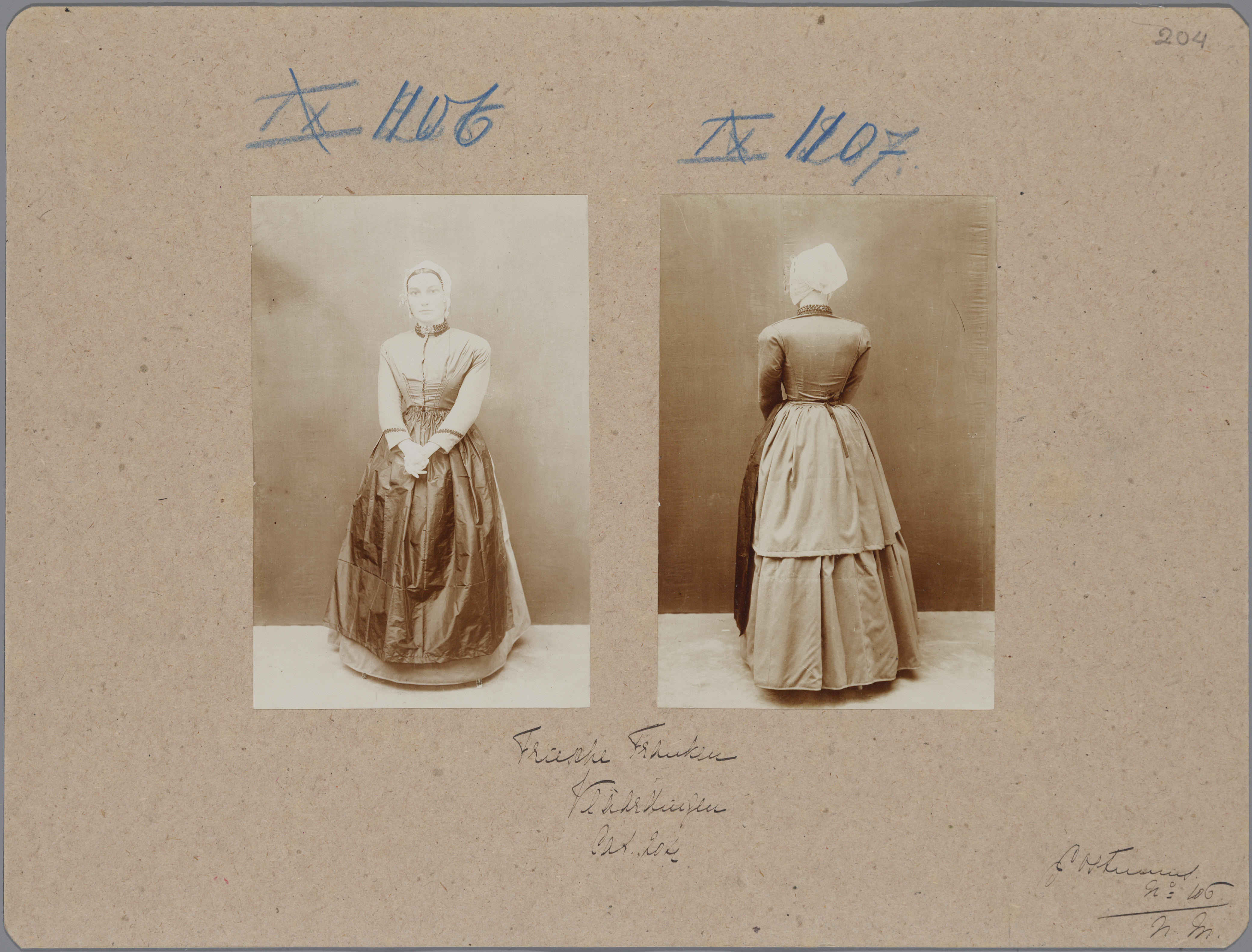 Karton met daarop twee foto's van een pop in het kostuum van een burgervrouw uit het Vlaardingen, die op de tentoonstelling Nationale Kleederdrachten van Harer Majesteits onderdanen in 1898 in Amsterdam werd getoond en aantekeningen die verwijzen naar de catalogus.