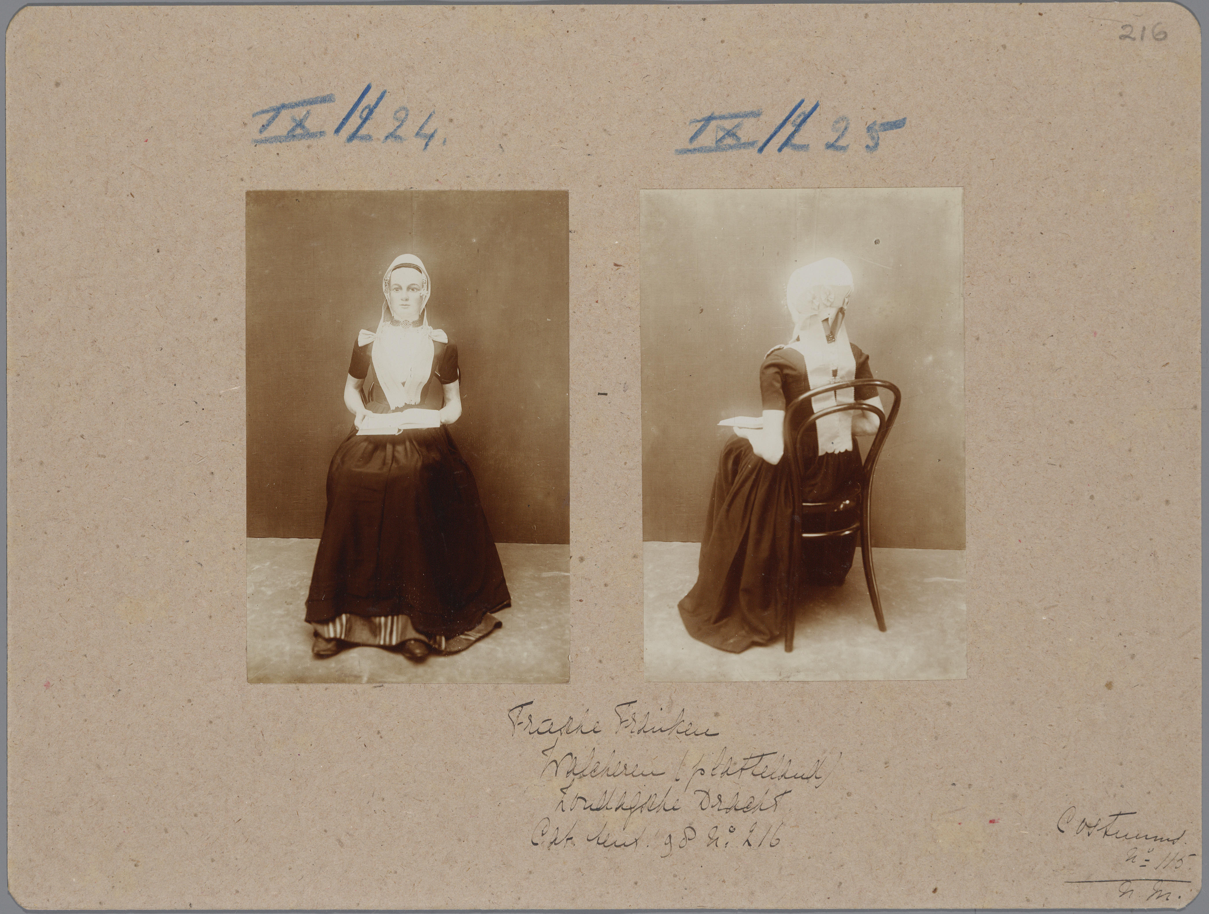 Karton met daarop twee foto's van een pop in het kostuum van een Walcherse boerin, die op de tentoonstelling Nationale Kleederdrachten van Harer Majesteits onderdanen in 1898 in Amsterdam werd getoond en aantekeningen die verwijzen naar de catalogus. De bijbehorende catalogustekst luidt: ‘De kaphoed geraakt uit de mode en wordt bijna alleen nog maar bij ...