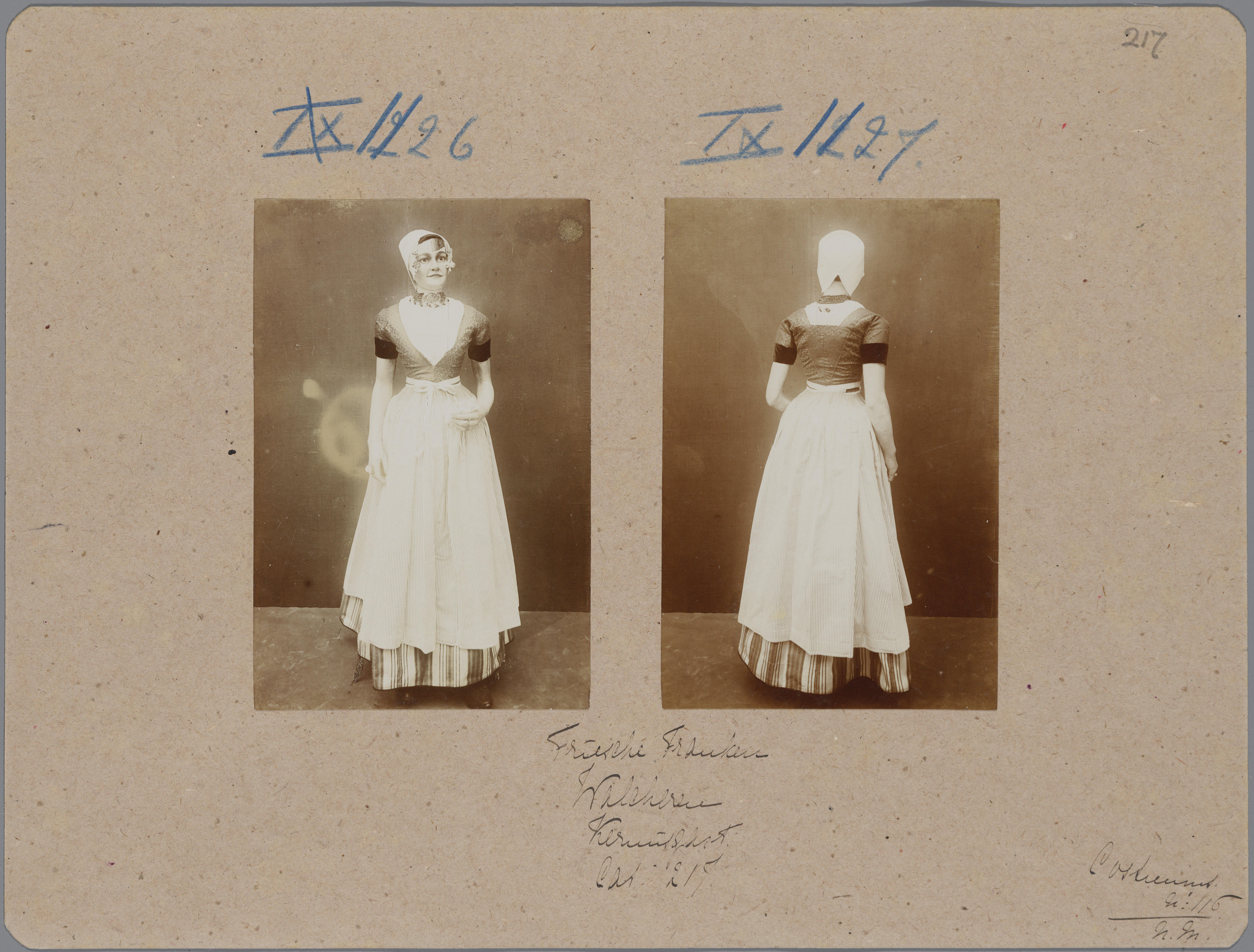 Karton met daarop twee foto's van een pop in het kostuum van een Walcherse kermisgangster, die op de tentoonstelling Nationale Kleederdrachten van Harer Majesteits onderdanen in 1898 in Amsterdam werd getoond en aantekeningen die verwijzen naar de catalogus. De bijbehorende catalogustekst luidt: ‘Bij gelegenheid van de kermis, maken de ongehuwden een rijpartij over het eiland, ...