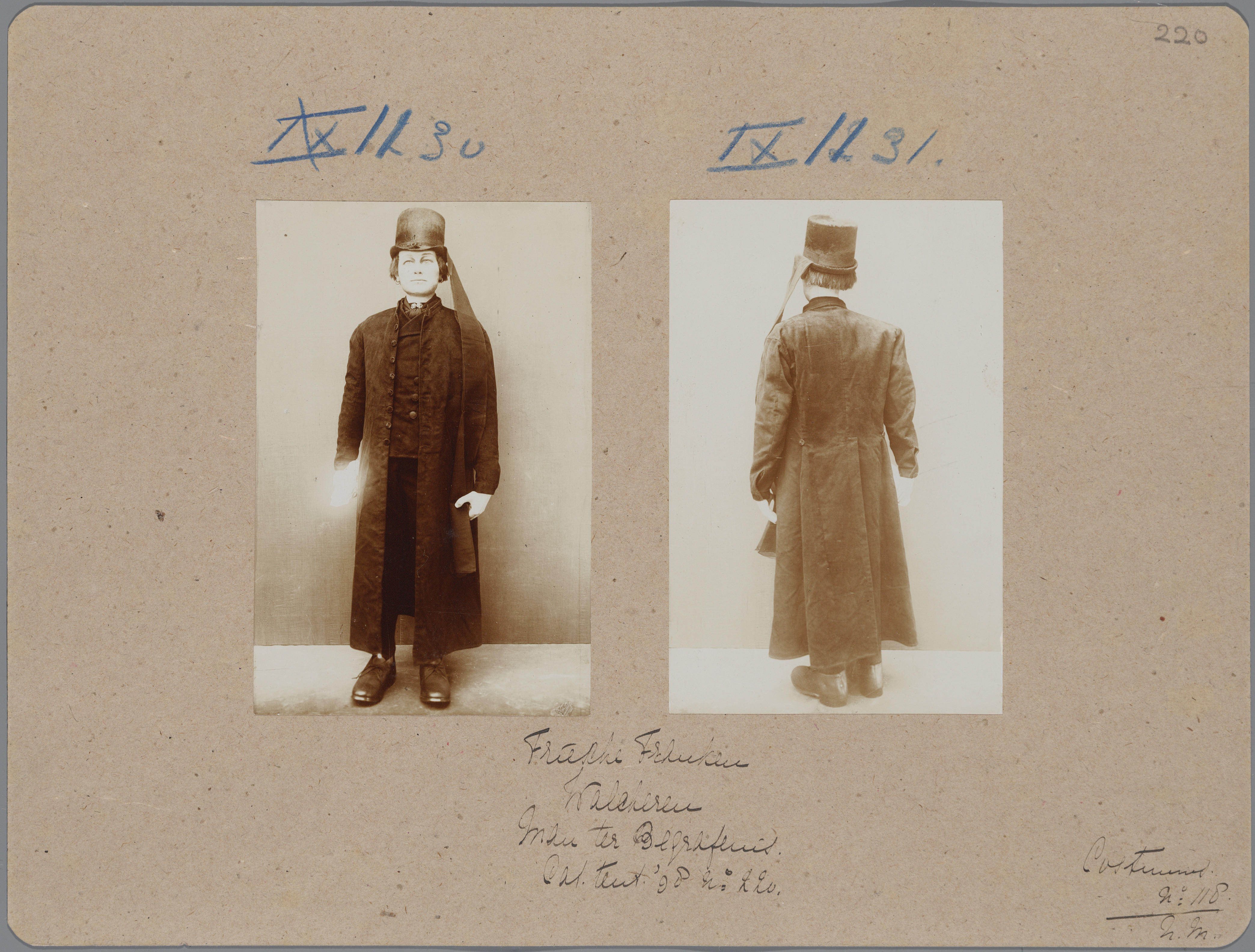 Karton met daarop twee foto's van een pop in het kostuum van een Walcherse man in begrafeniskostuum, die op de tentoonstelling Nationale Kleederdrachten van Harer Majesteits onderdanen in 1898 in Amsterdam werd getoond en aantekeningen die verwijzen naar de catalogus. De bijbehorende catalogustekst luidt: ‘'s Mans lange jas heet hier "kappe". De korte broek was ...