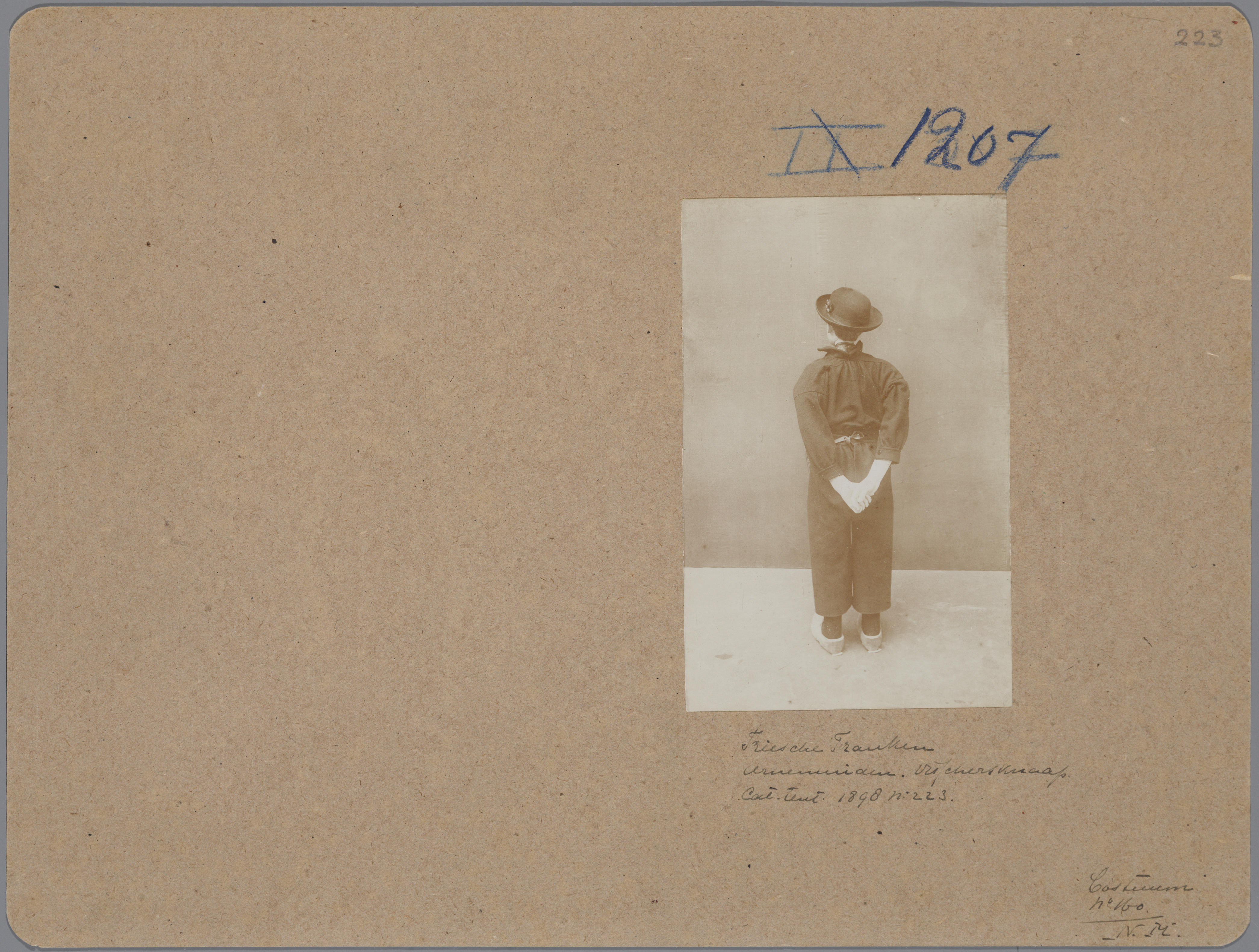 Karton met daarop een foto van een pop in het kostuum van een Arnemuider vissersjongen, die op de tentoonstelling Nationale Kleederdrachten van Harer Majesteits onderdanen in 1898 in Amsterdam werd getoond en aantekeningen die verwijzen naar de catalogus.