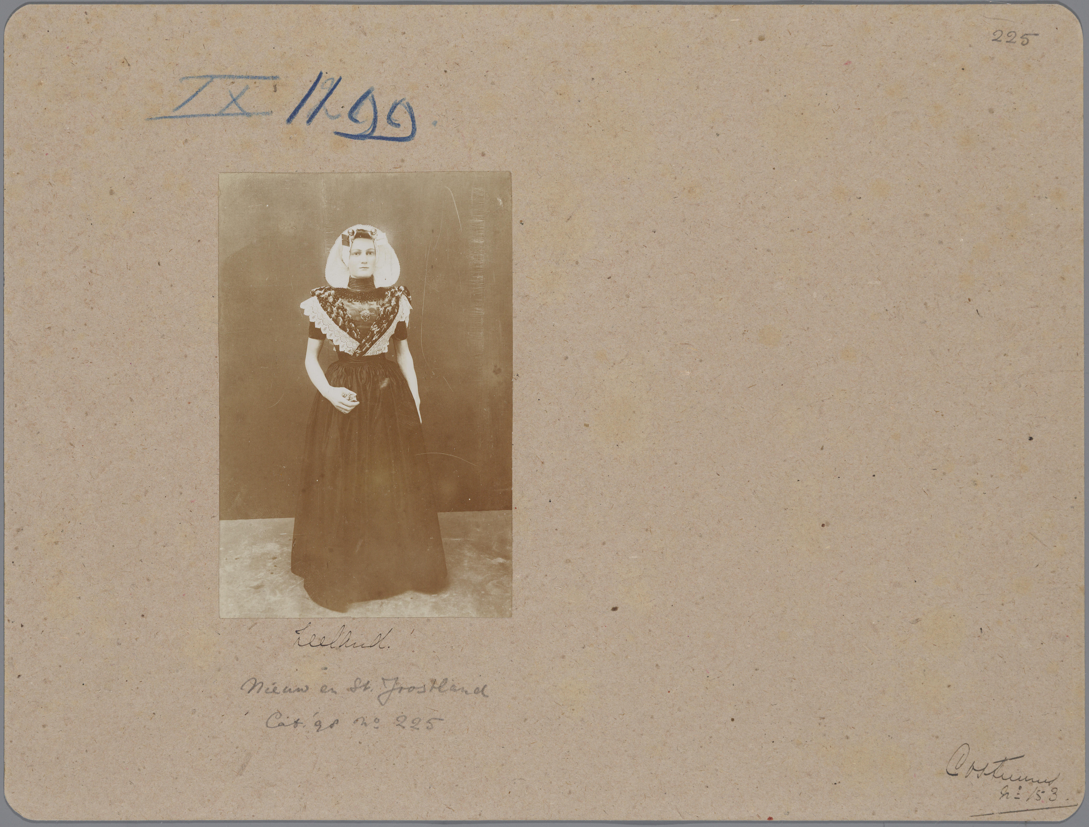 Karton met daarop een foto van een pop in het kostuum van een Nieuw- en St. Joostlandse boerendochter, die op de tentoonstelling Nationale Kleederdrachten van Harer Majesteits onderdanen in 1898 in Amsterdam werd getoond en aantekeningen die verwijzen naar de catalogus. De bijbehorende catalogustekst luidt: ‘Eertijds een afzonderlijk eiland, tusschen Walcheren en Zuid-Beveland gelegen, wordt ...