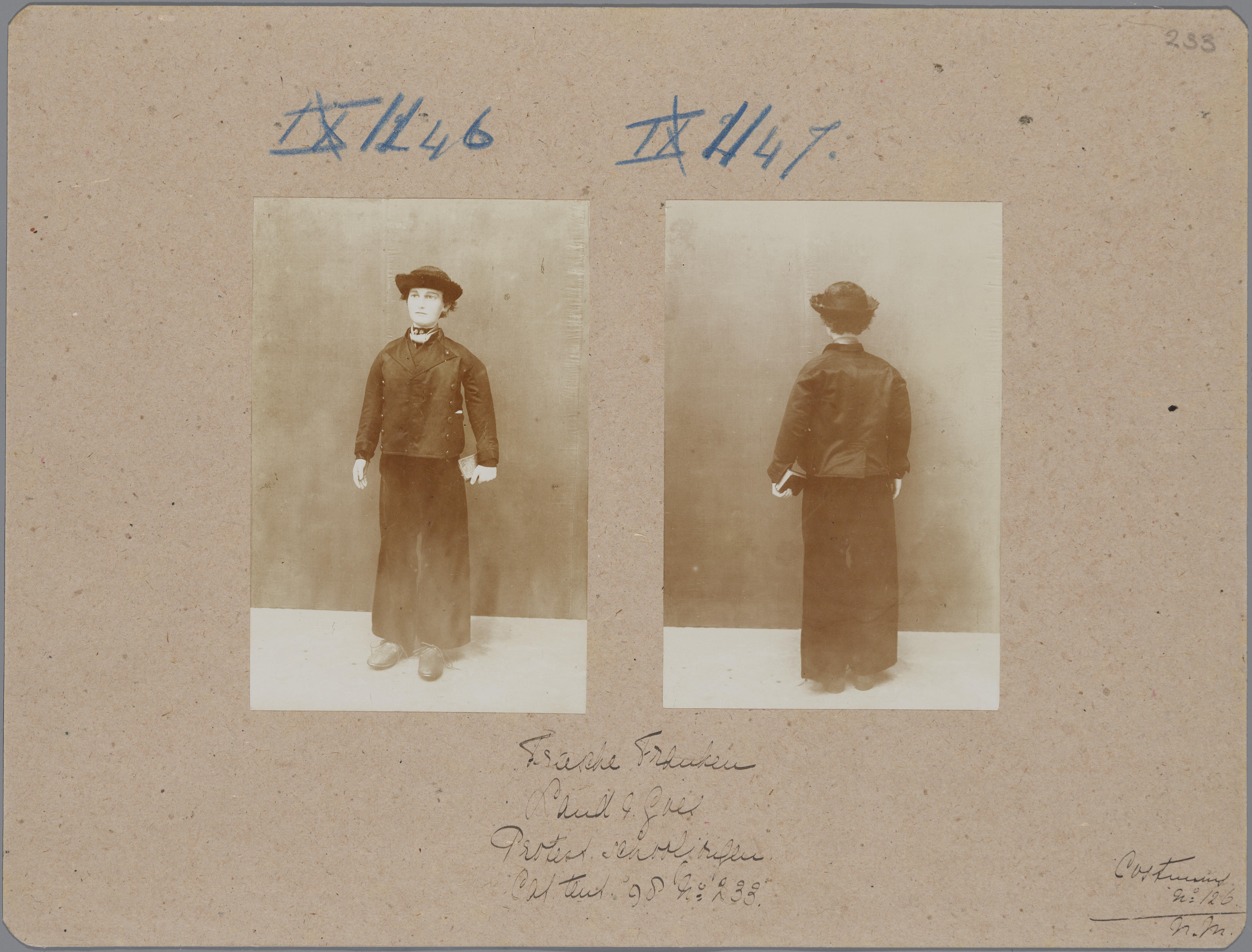 Karton met daarop twee foto's van een pop in het kostuum van een protestantse schooljongen uit het land van Goes, die op de tentoonstelling Nationale Kleederdrachten van Harer Majesteits onderdanen in 1898 in Amsterdam werd getoond en aantekeningen die verwijzen naar de catalogus.