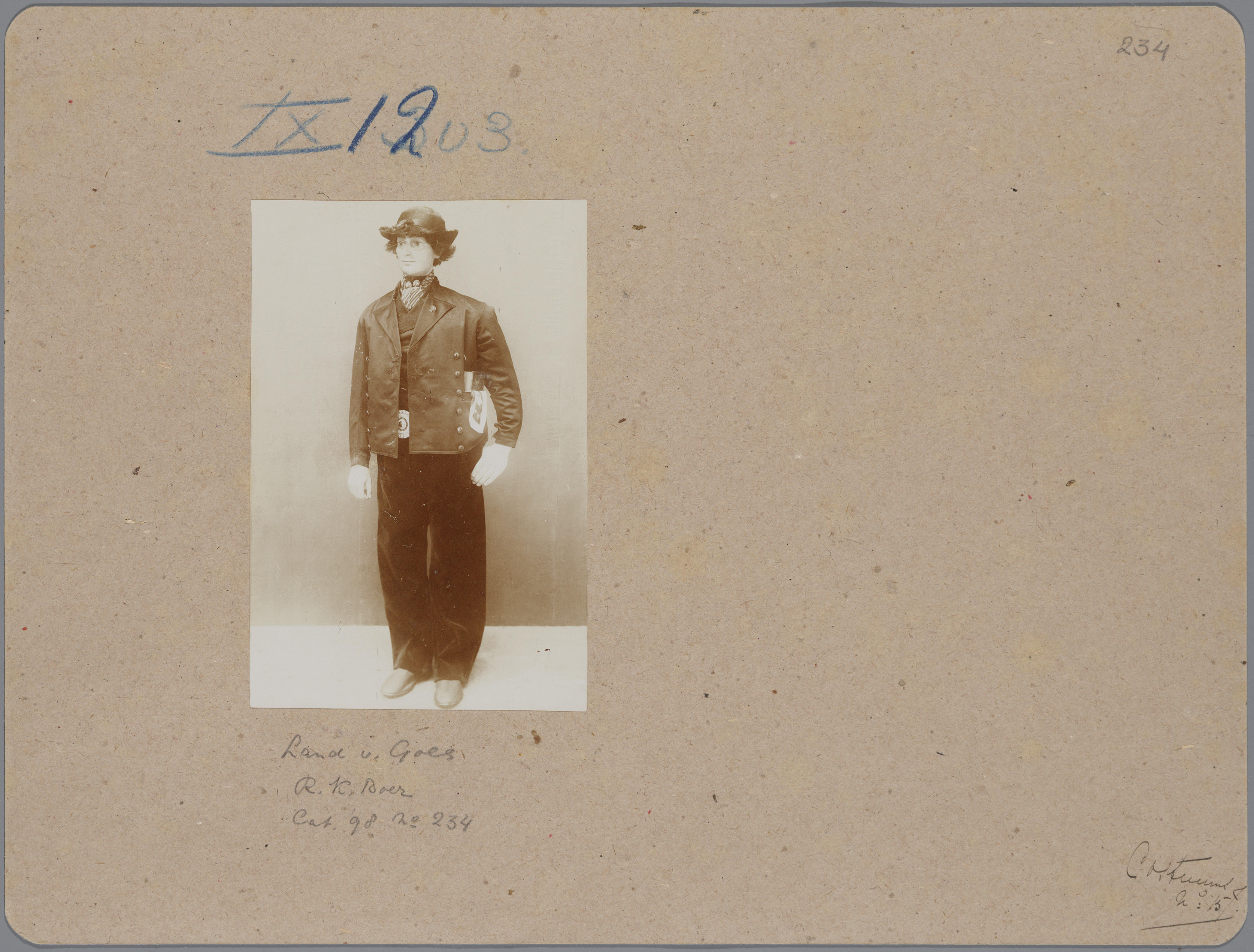 Karton met daarop een foto van een pop in het kostuum van een rooms-katholieke boer uit het land van Goes, die op de tentoonstelling Nationale Kleederdrachten van Harer Majesteits onderdanen in 1898 in Amsterdam werd getoond en aantekeningen die verwijzen naar de catalogus. De bijbehorende catalogustekst luidt: ‘In tegenstelling met Walcheren, komen in het Goesche ...