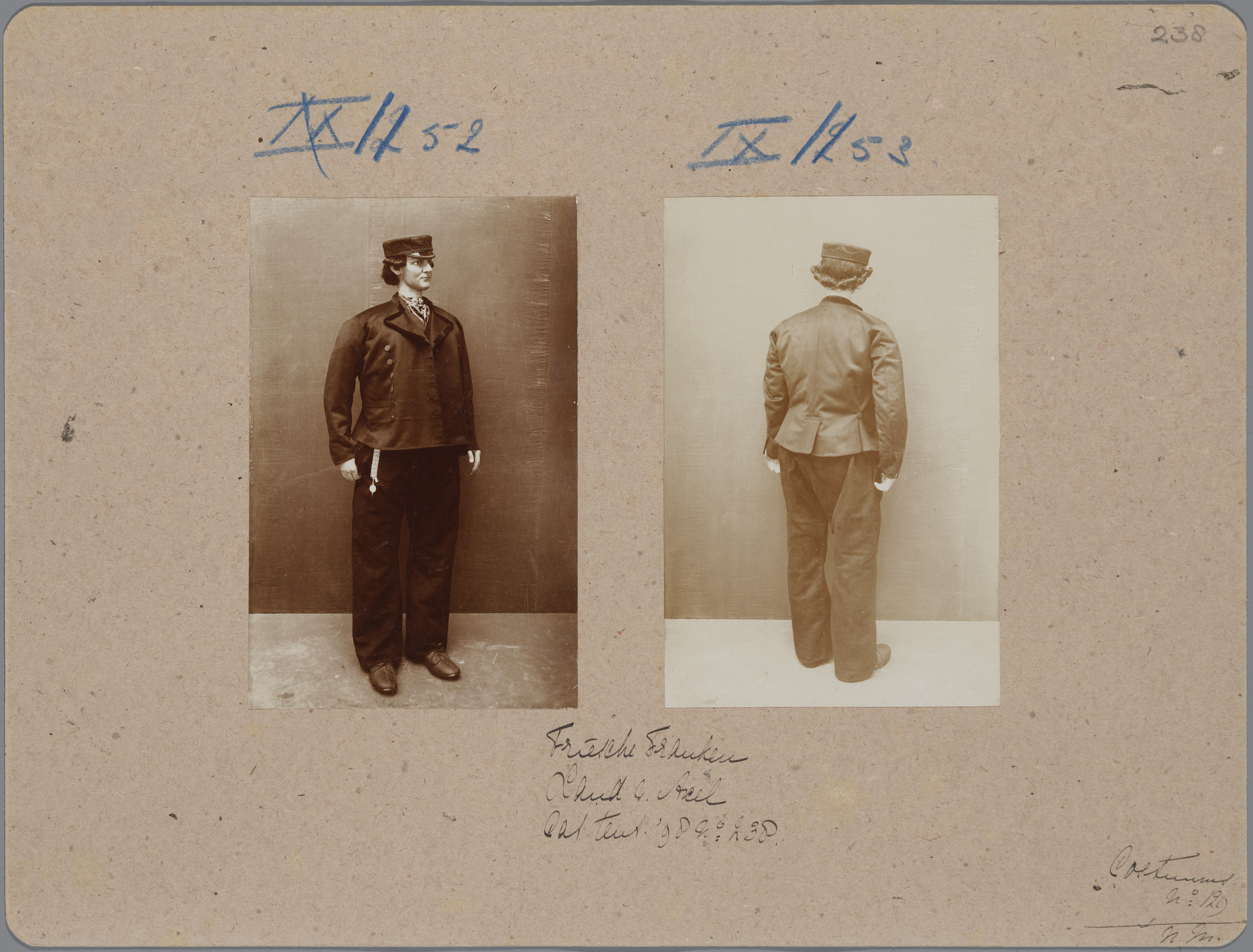 Karton met daarop twee foto's van een pop in het kostuum van een boer uit het land van Axel, die op de tentoonstelling Nationale Kleederdrachten van Harer Majesteits onderdanen in 1898 in Amsterdam werd getoond en aantekeningen die verwijzen naar de catalogus. De bijbehorende catalogustekst luidt: ‘De bevolking van het land van Axel komt grootendeels ...