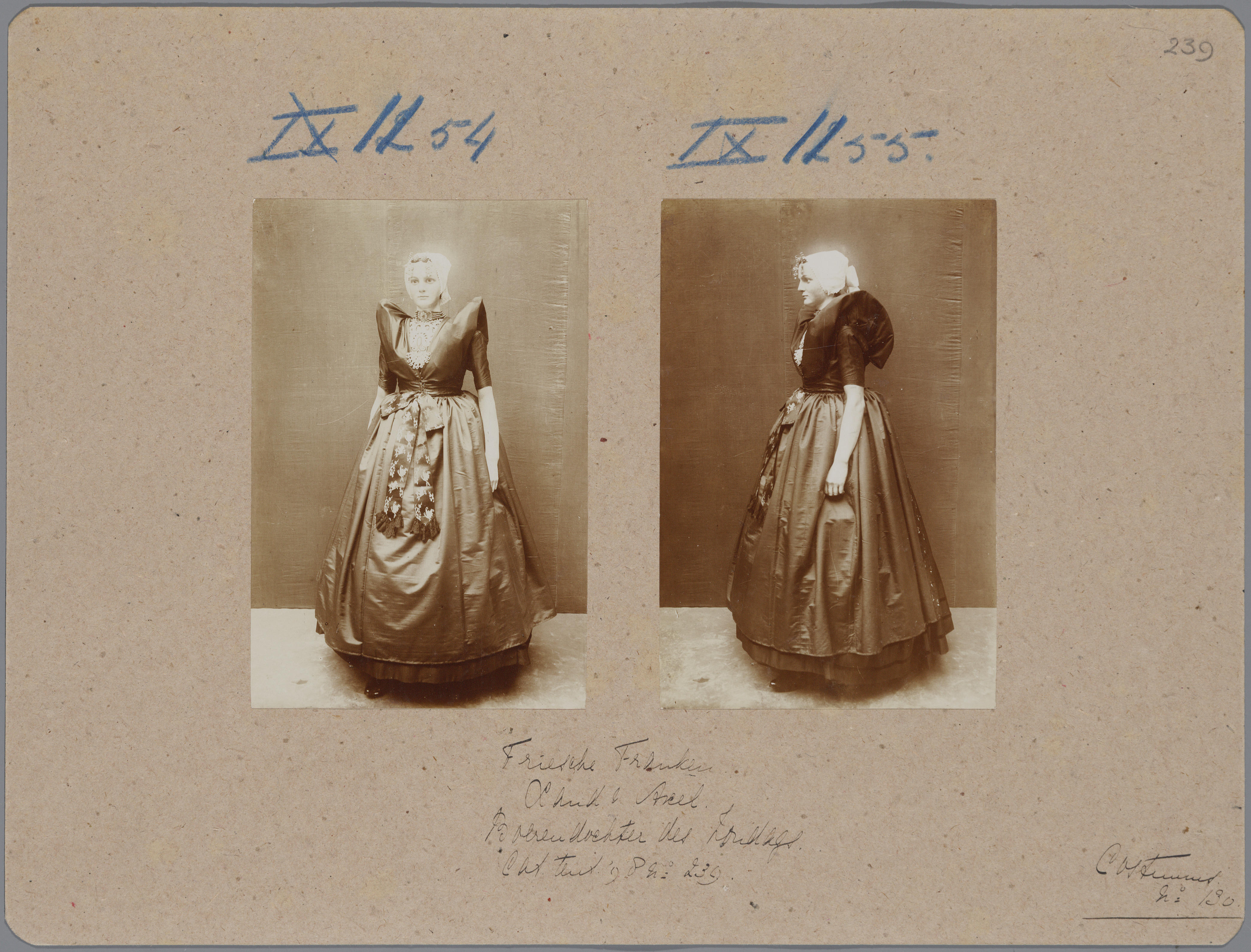 Karton met daarop twee foto's van een pop in het kostuum van een boerendochter uit het land van Axel, die op de tentoonstelling Nationale Kleederdrachten van Harer Majesteits onderdanen in 1898 in Amsterdam werd getoond en aantekeningen die verwijzen naar de catalogus. De bijbehorende catalogustekst luidt: ‘Een zwaar gesteven lap houdt den doek omhoog. De ...