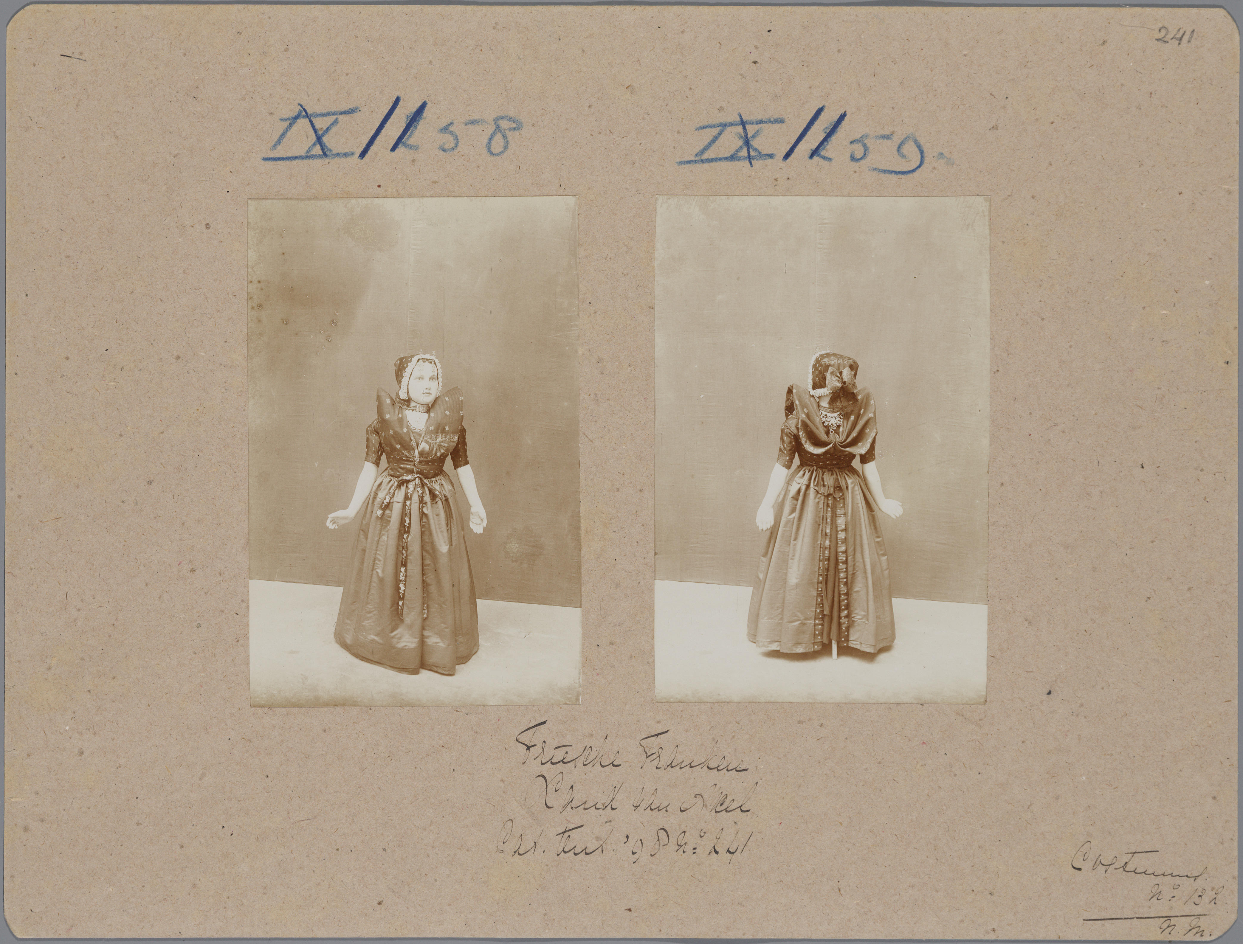Karton met daarop twee foto's van een pop in het kostuum van een meisje uit het land van Axel, die op de tentoonstelling Nationale Kleederdrachten van Harer Majesteits onderdanen in 1898 in Amsterdam werd getoond en aantekeningen die verwijzen naar de catalogus. De bijbehorende catalogustekst luidt: ‘Een zwaar gesteven lap houdt den doek omhoog. De ...