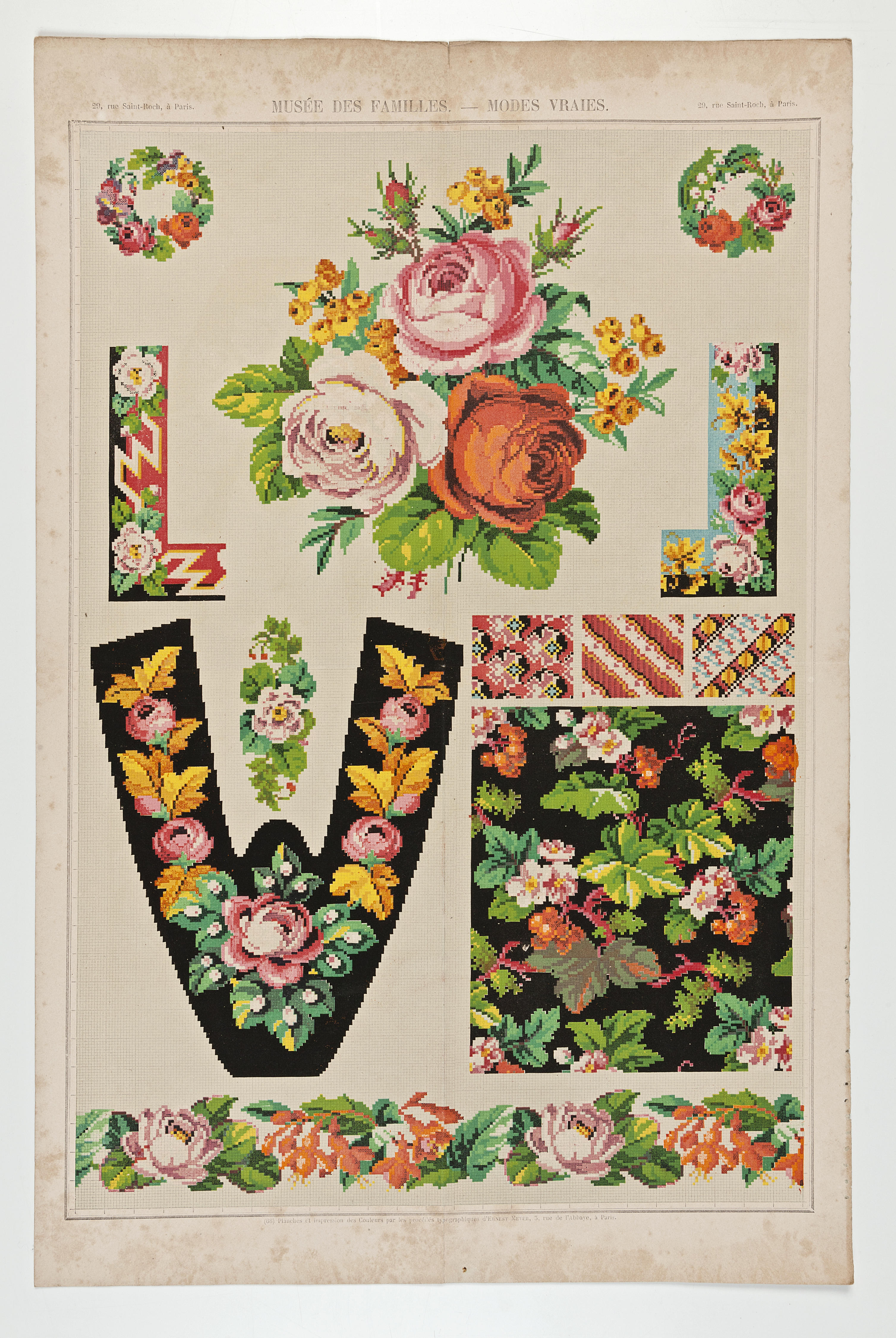 Borduurpatroon met twaalf verschillende voorbeelden. Deze voorbeelden zijn een bloemenrand, een vierkant met bloempatroon, drie keer een vierkant met geometrische indeling, een pantoffel, twee keer een bloemstrooimotief, twee keer een bloemenkrans en twee keer een rechte bloemenrand. Aan de bovenkant staat de uitgever van het patroon vermeld, het tijdschrift "Musée des familles. --- modes vraies." ...