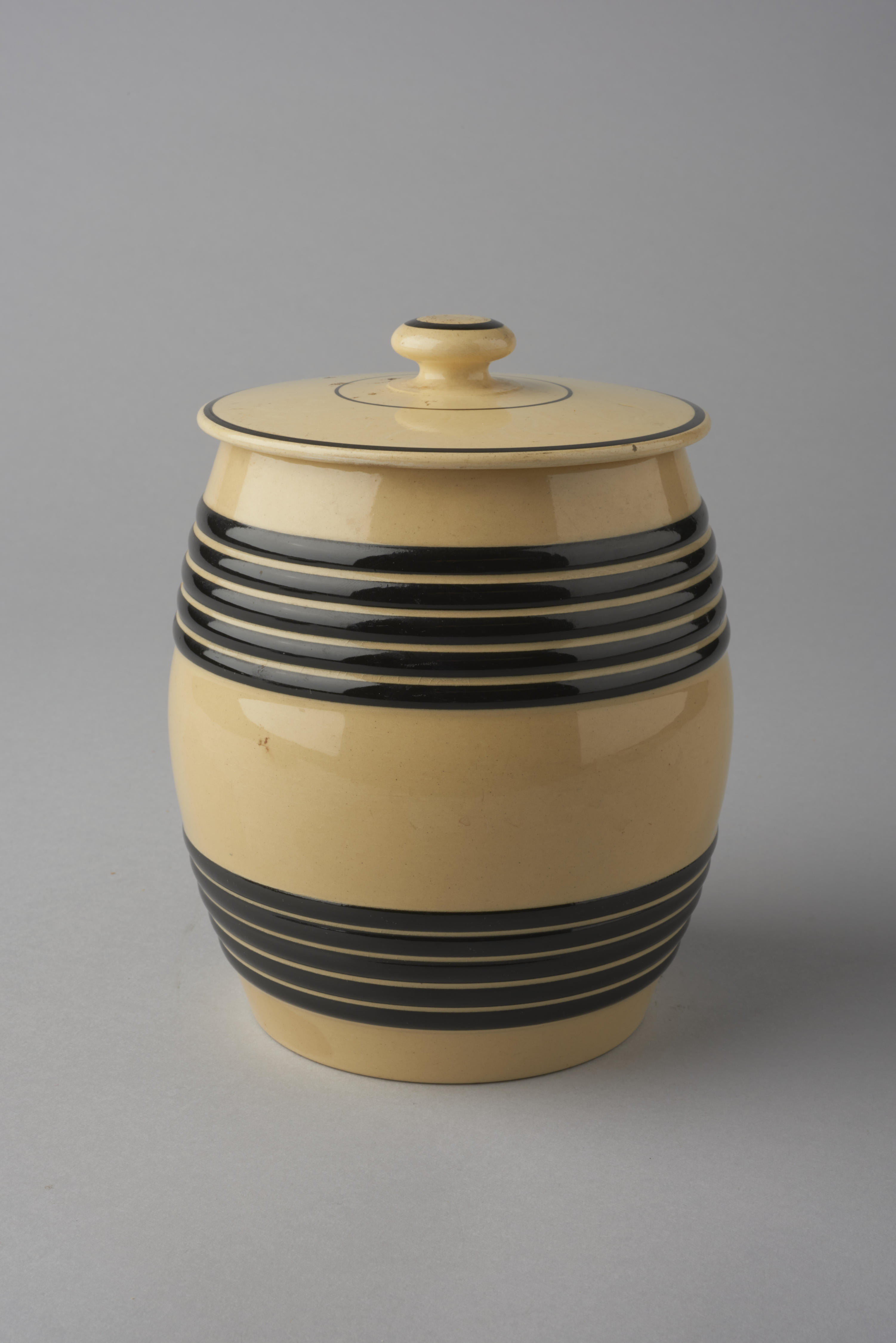 Gele voorraadpot in de vorm van een ton met deksel. De pot is verfraaid met zwarte horizontale banden. Hij is rond 1900 gemaakt door Petrus Regout in Maastricht.