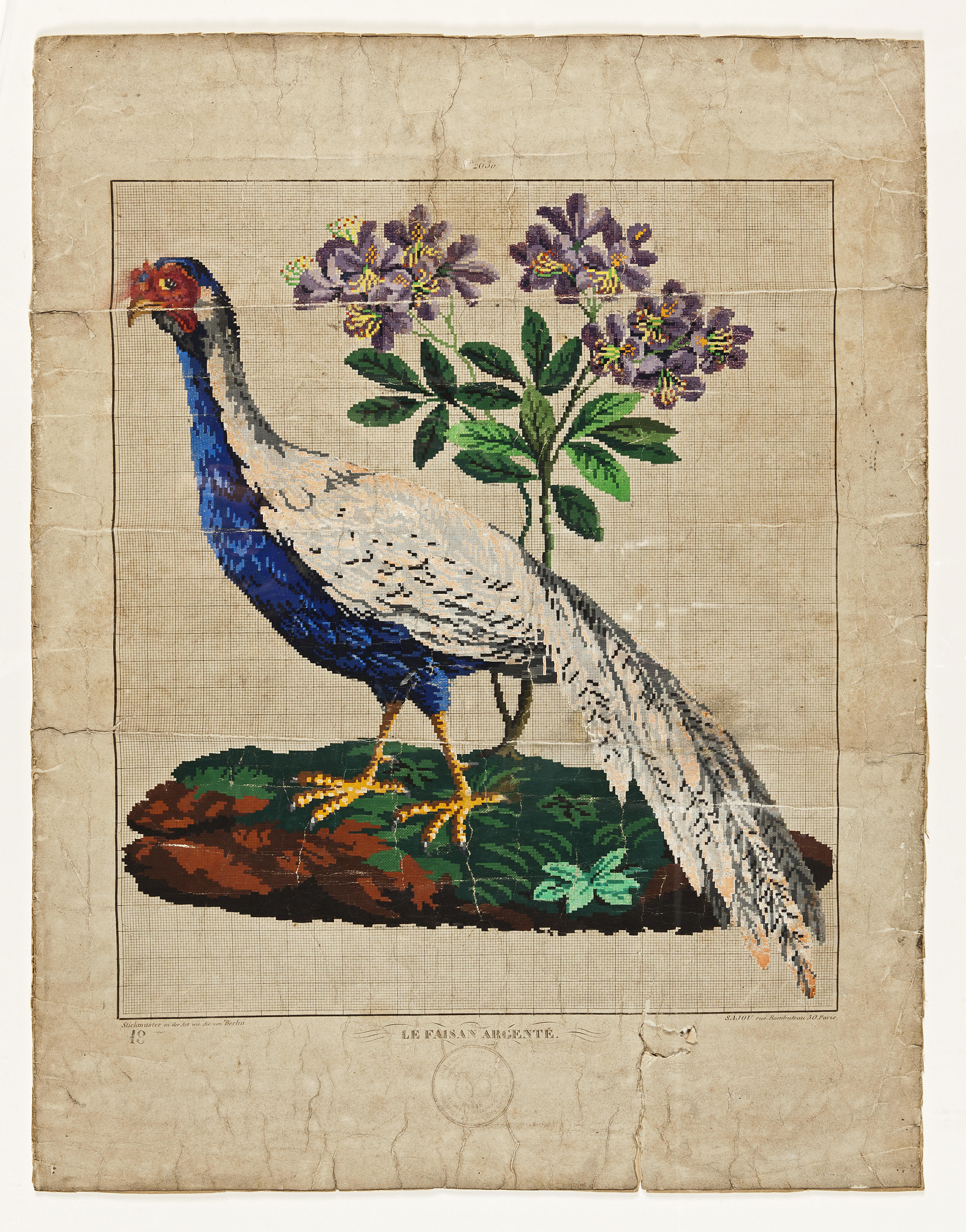 Ingekleurd borduurpatroon met de titel: 'Le faisan argenté'. Het patroon is uitgegeven door Sajou in Parijs, Frankrijk. Onderaan staan een medaille en een Duitse tekst weergegeven. Het patroon heeft nummer 18.