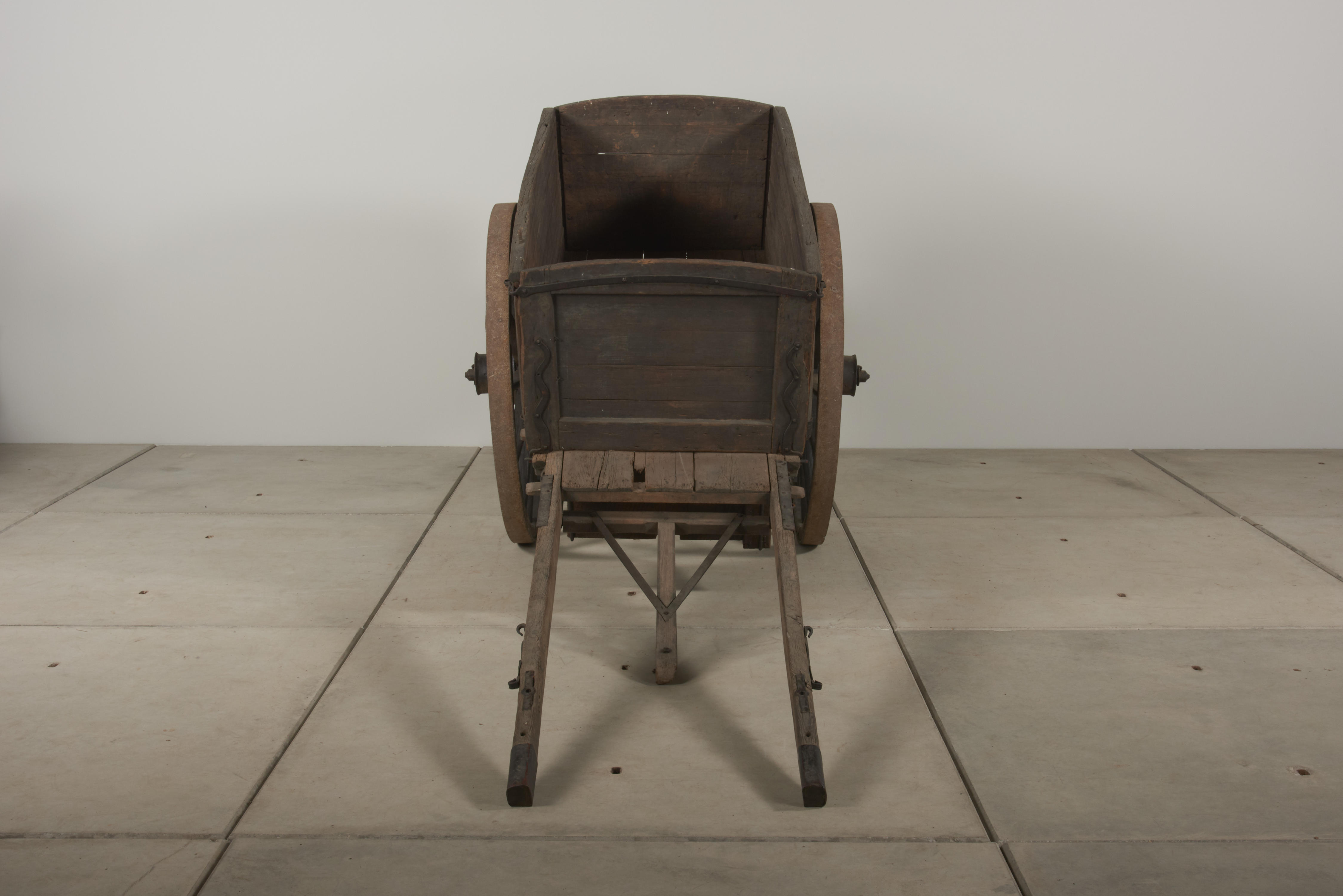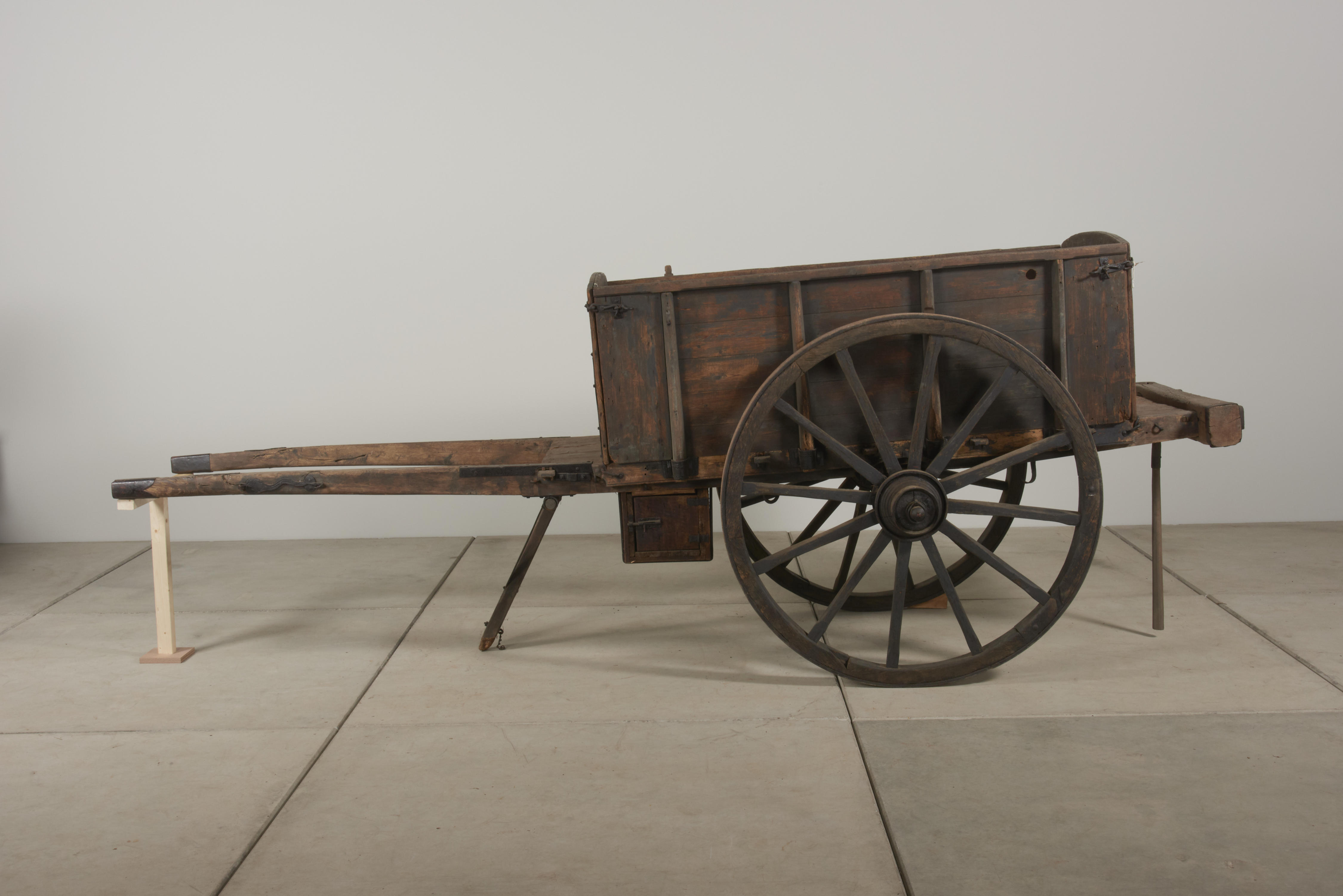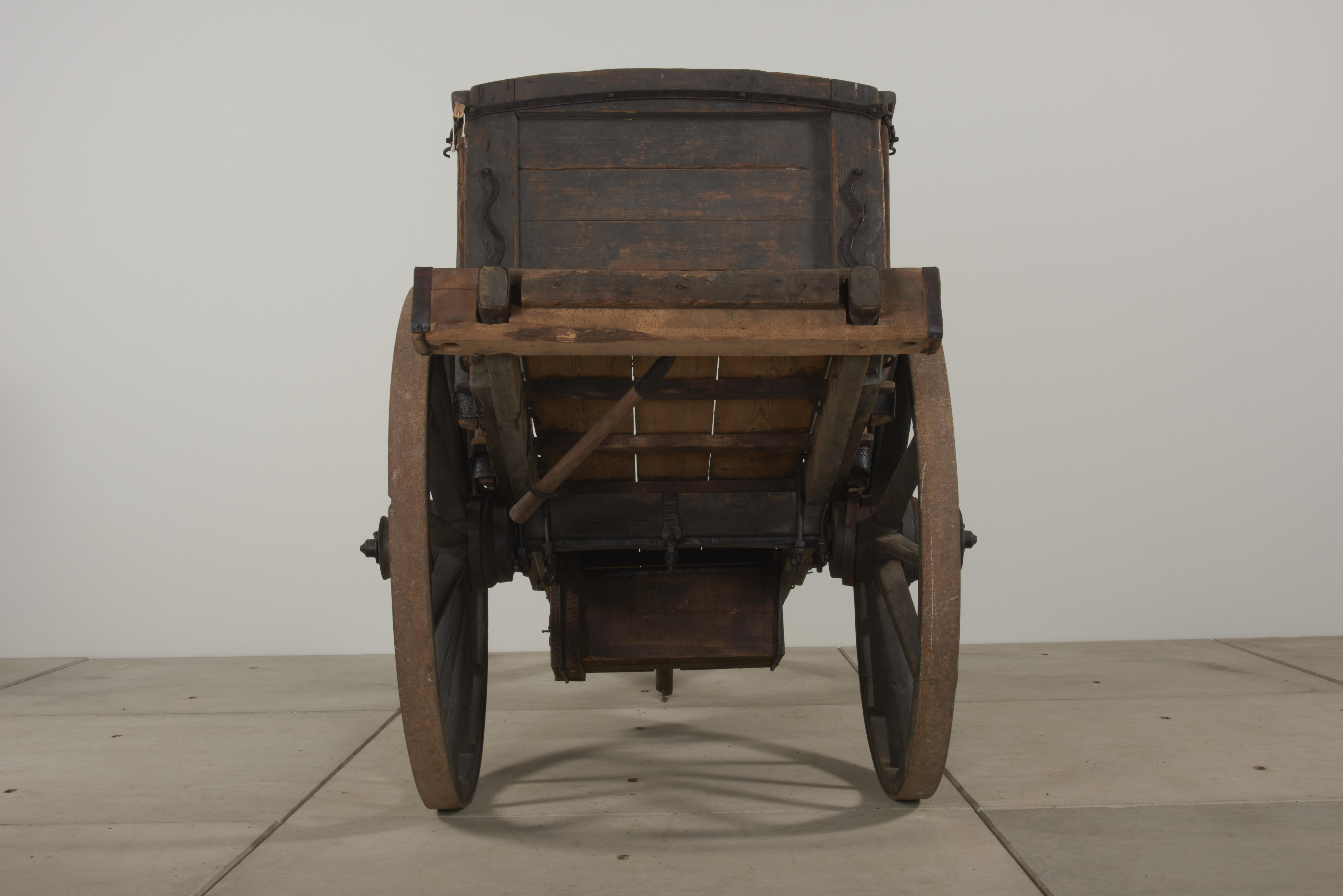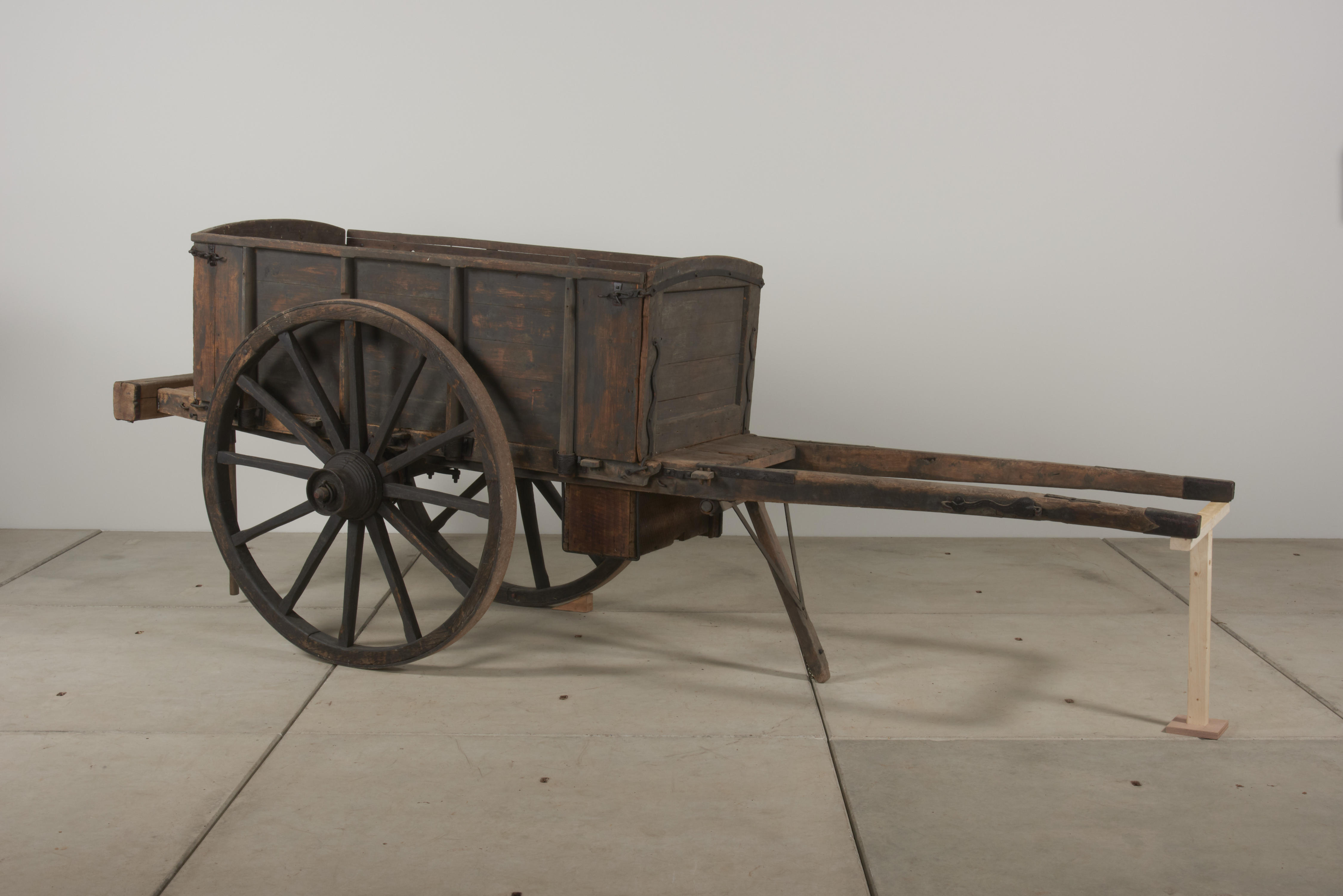 Deze kar werd door een paard getrokken en was in gebruik voor alle agrarische transport: hooi, rogge, aardappelen, mangelwortels en melkbussen. De voerman liep naast de beladen kar of reed mee op het voordek. Er is versiering in de vorm van gevlamd siersmeedwerk aangebracht aan het voor- en achterschot en op de buitenkant van de ...