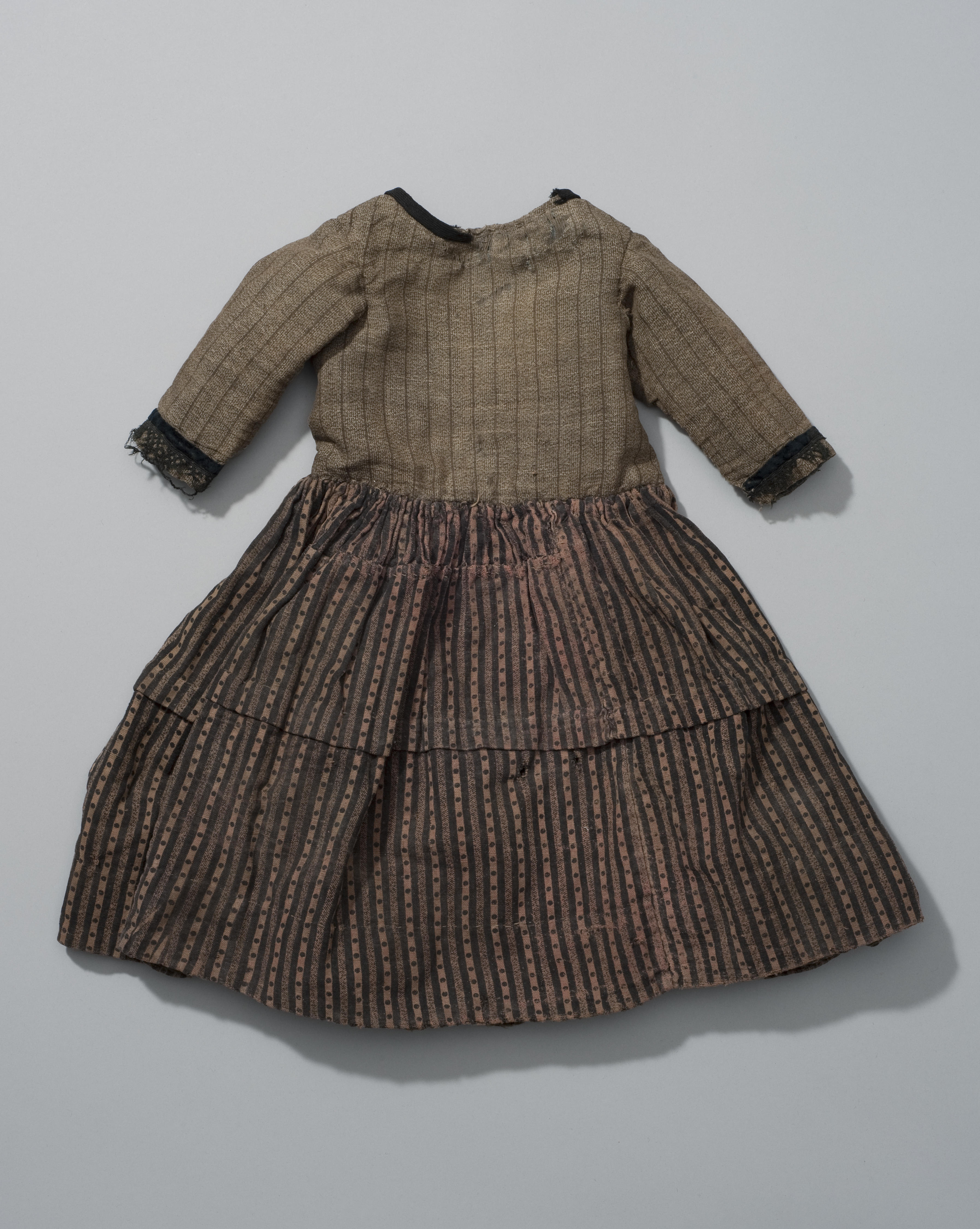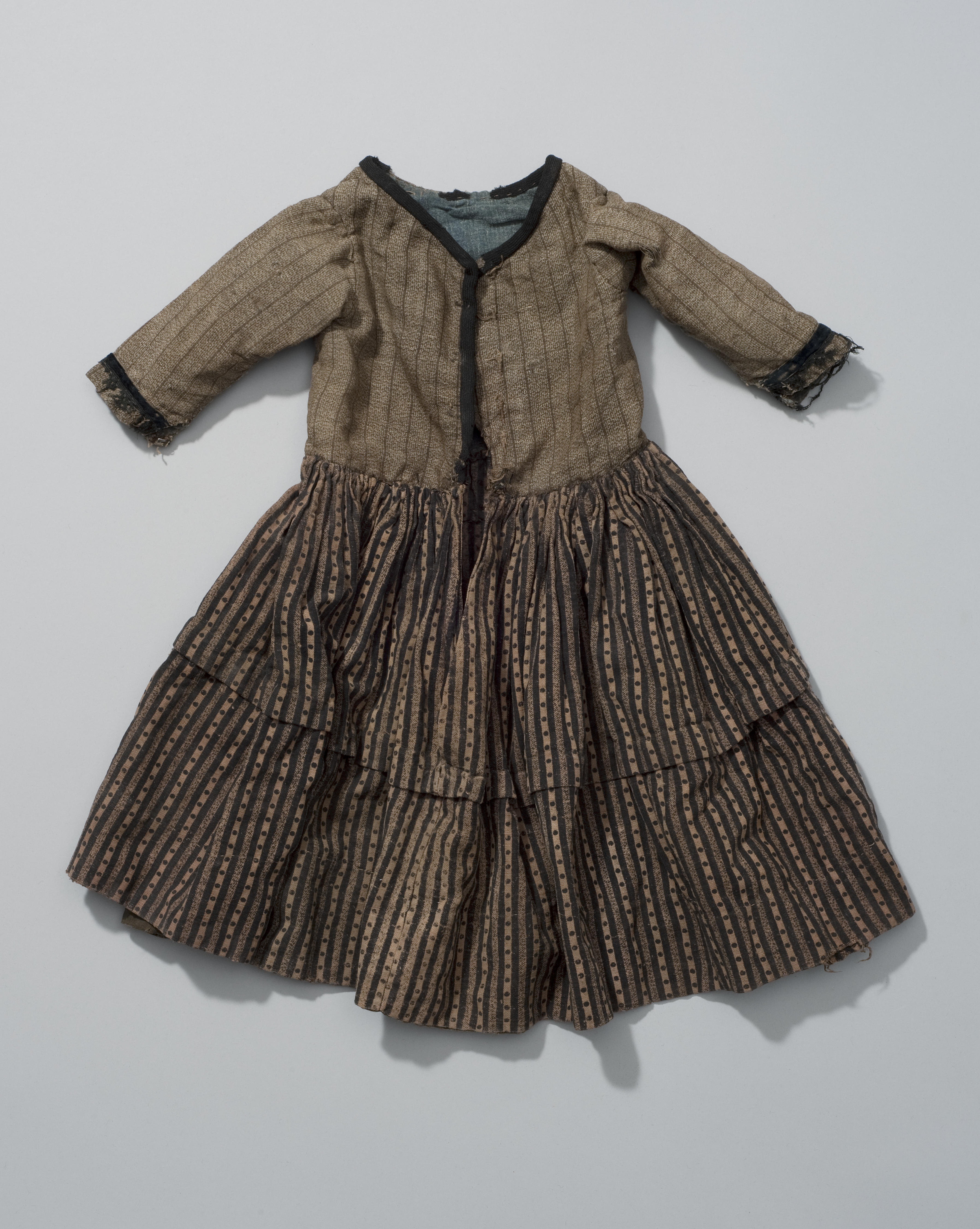 Welk meisje dit katoenen jurkje gedragen heeft en waar precies is helaas niet bekend. Het jurkje is samengesteld uit verschillende stoffen en flink afgedragen.