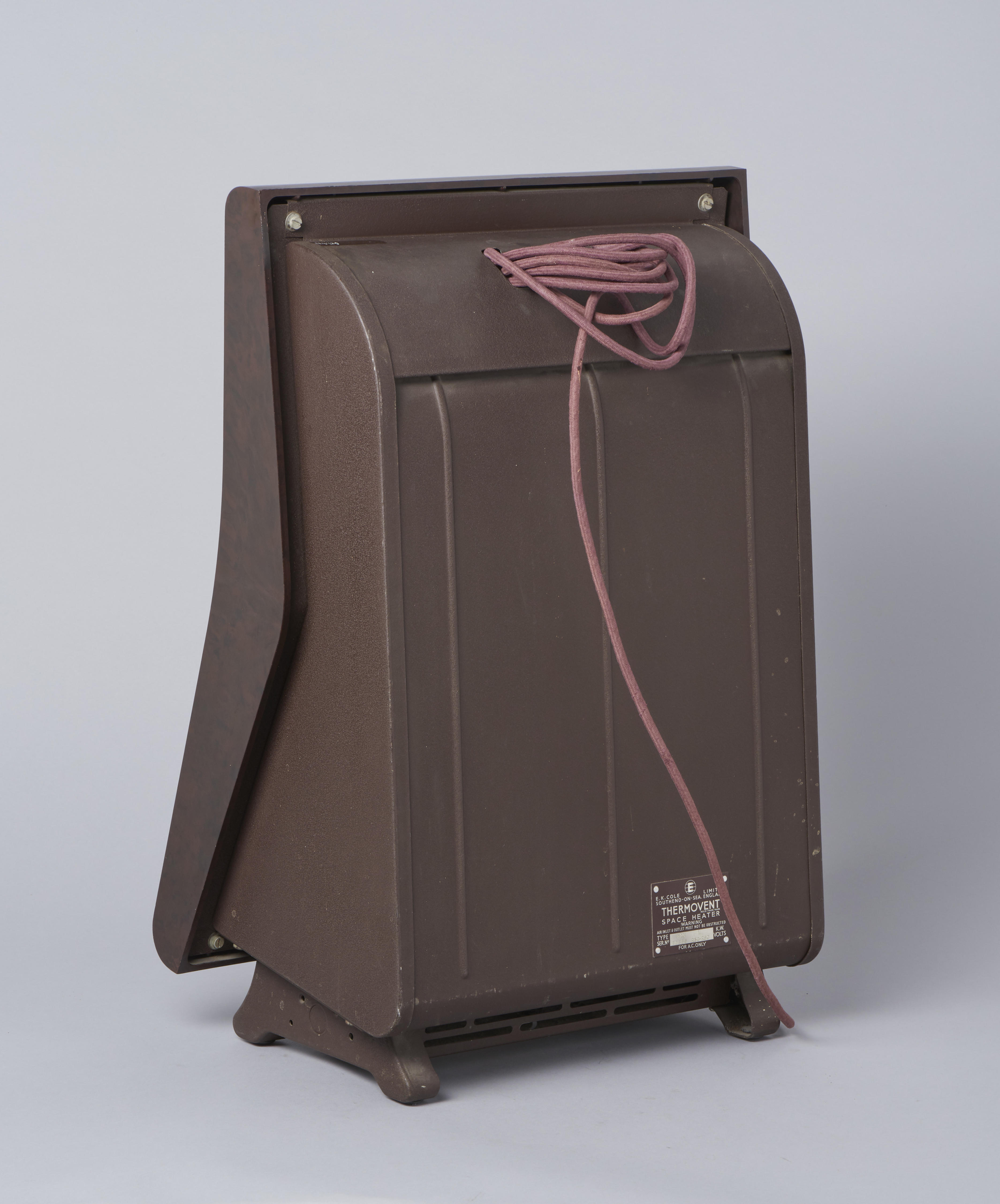 Elektrische bakelieten kachel met ingebouwde ventilator van het type Thermovent, gemaakt door EK Cole in Southend-on-Sea, Engeland. Het ontwerp van de mantel uit 1937 is van de ontwerper Wells Coates, die voor EK Cole ook radio’s ontwierp.