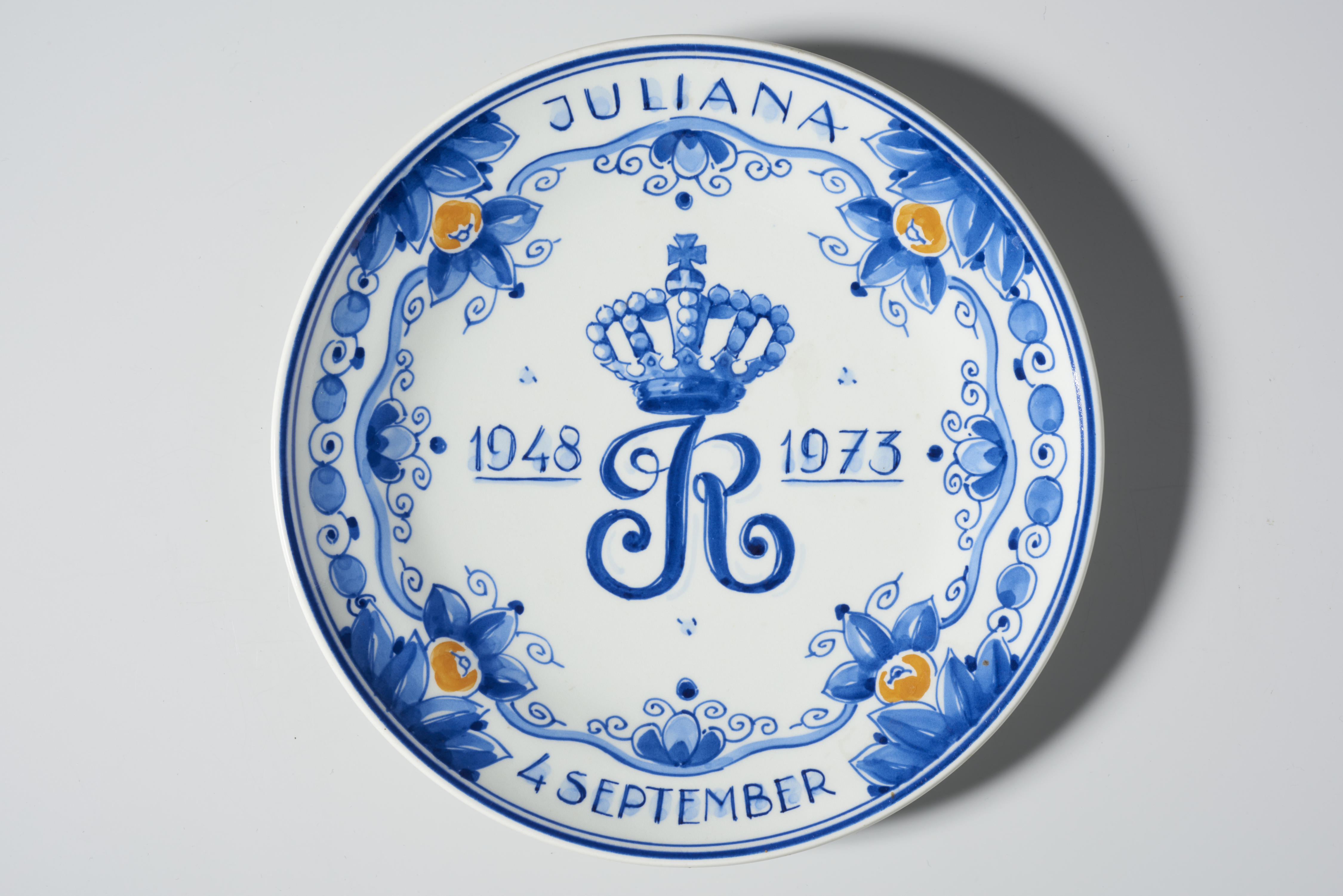 Gedenkbord ter herinnering aan het 25-jarig regeringsjubileum van koningin Juliana in 1973. In het midden van het bord is een gekroonde ‘R’ afgebeeld, met links het jaartal ‘1948’ en rechts ‘1973’. De rand van het bord is versierd met vier oranjeappels. Het opschrift luidt: ‘Juliana 4 september’.