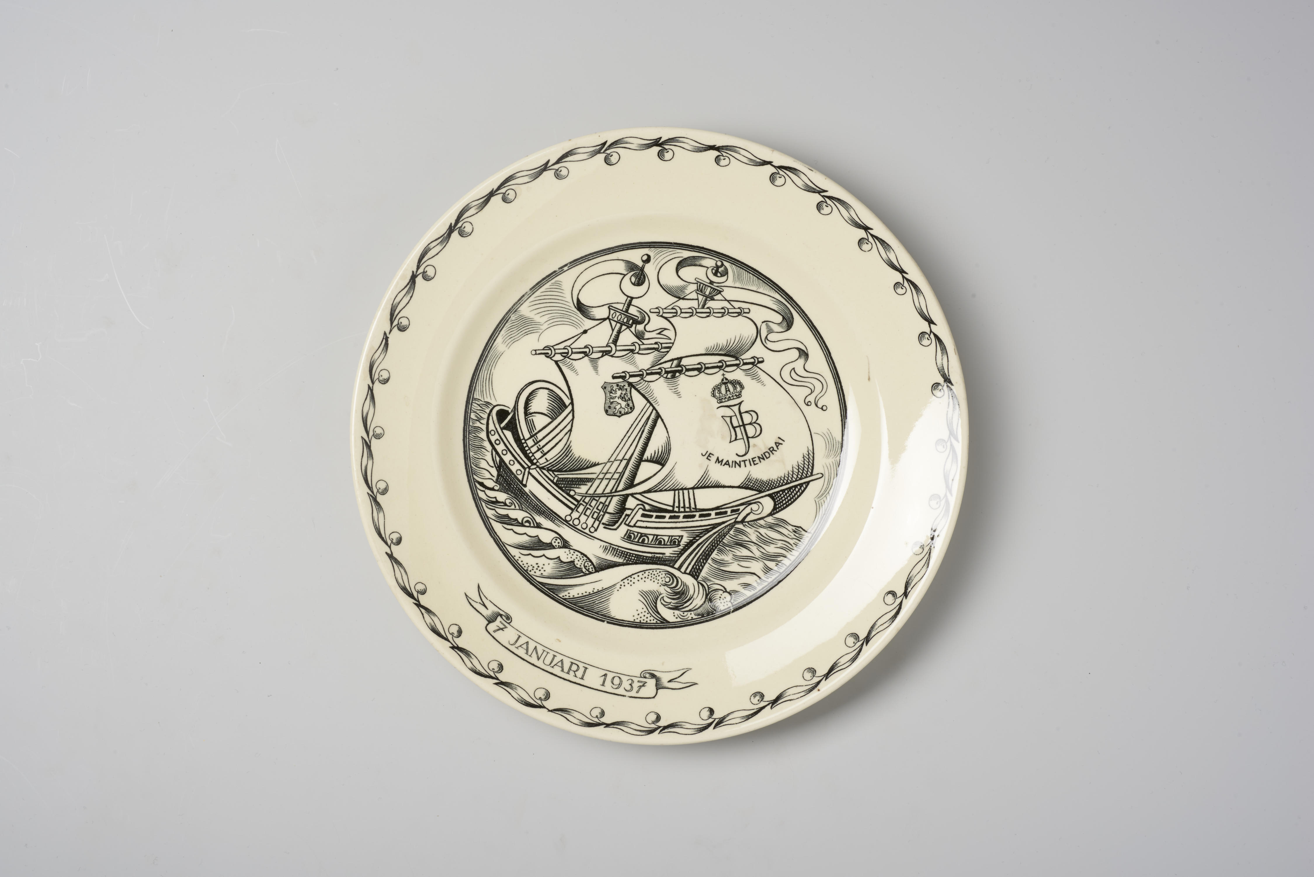 Gedenkbord, vervaardigd ter gelegenheid van het huwelijk tussen prinses Juliana en prins Bernhard in 1937. Op het bord is een zeilschip afgebeeld met de monogrammen ‘J’ en ‘B’ onder een kroon op het voorste zeil. Daaronder staat de tekst: ‘Je maintiendrai’. Op het tweede zeil staat het Nederlandse wapen afgebeeld. De rand van het bord ...