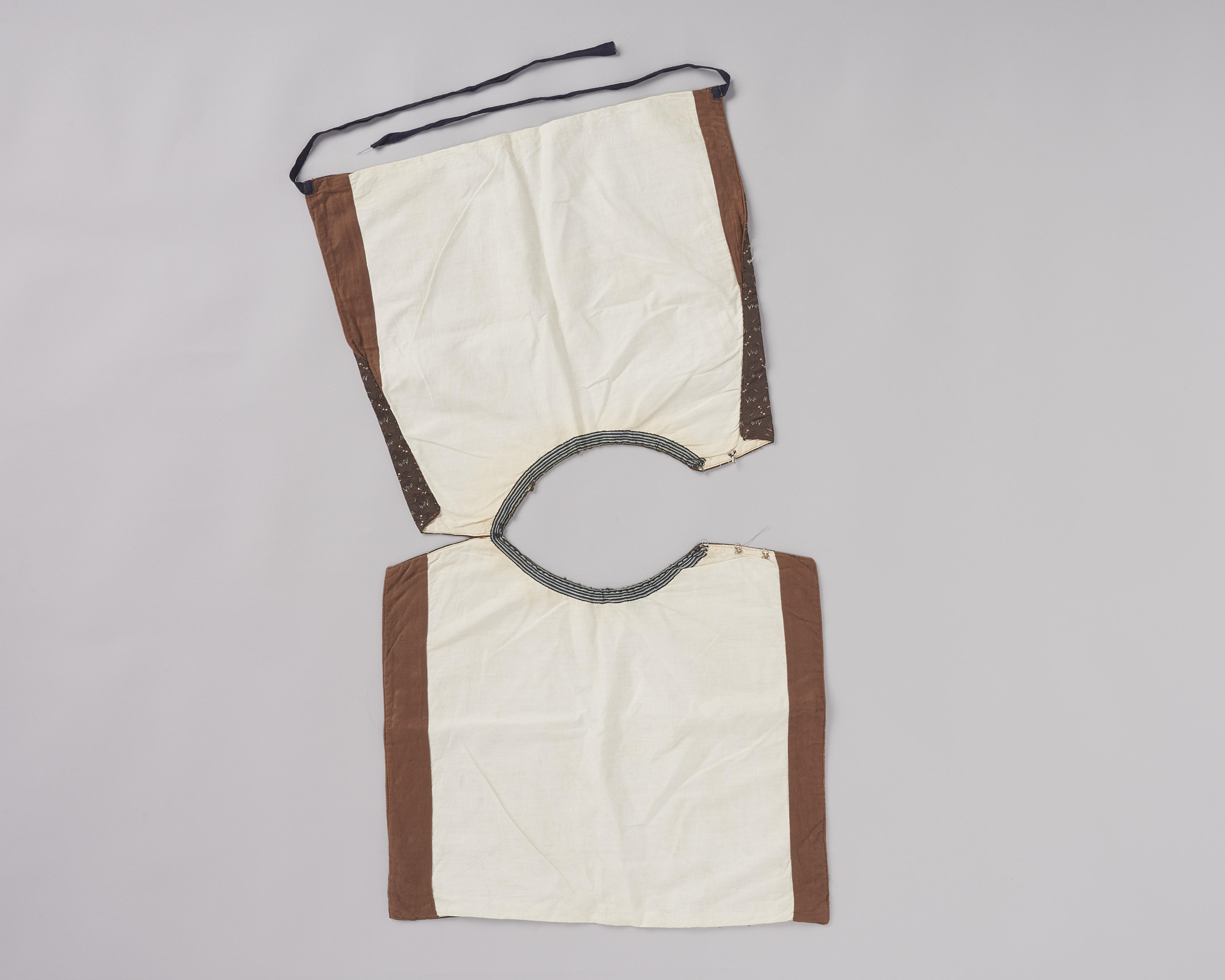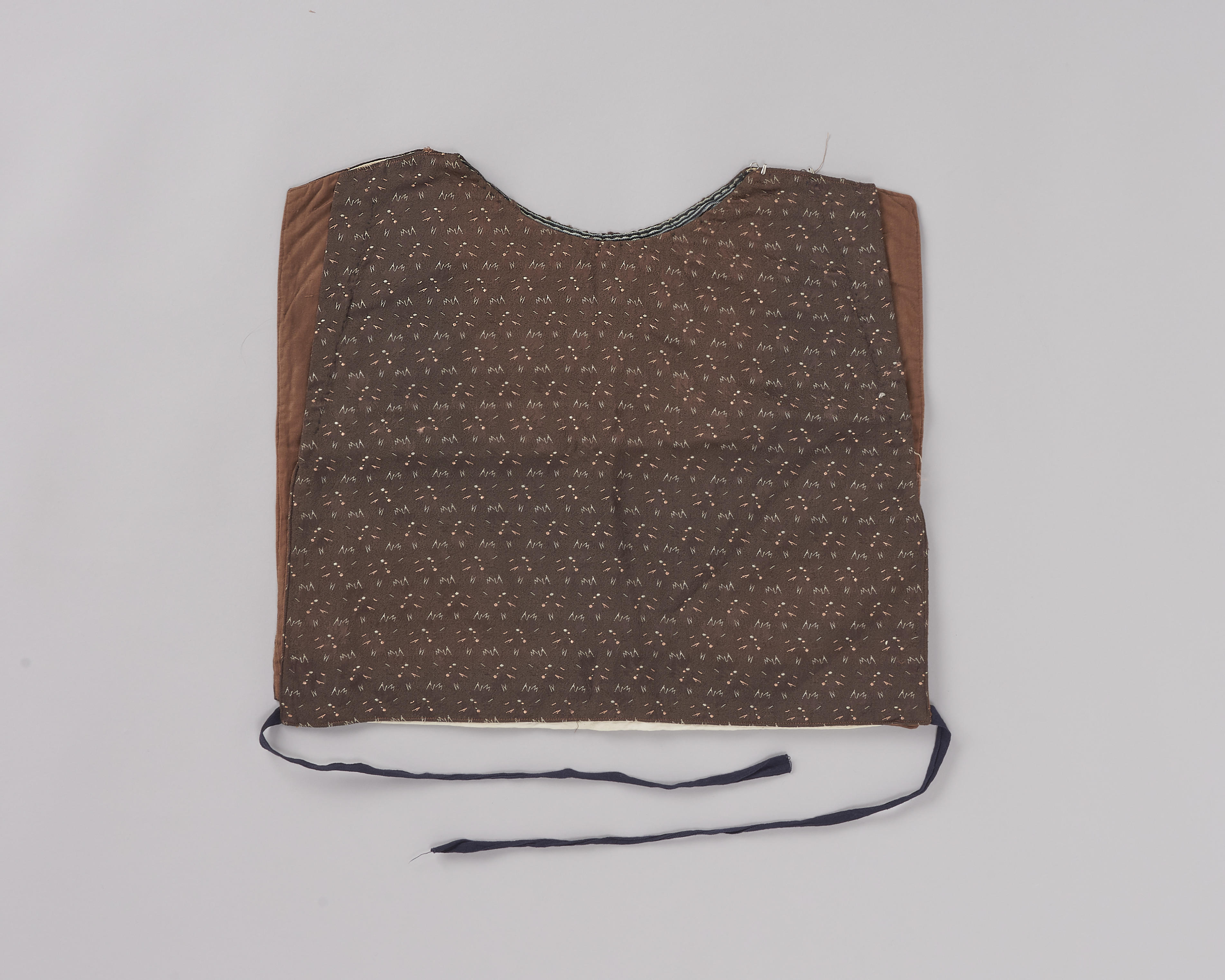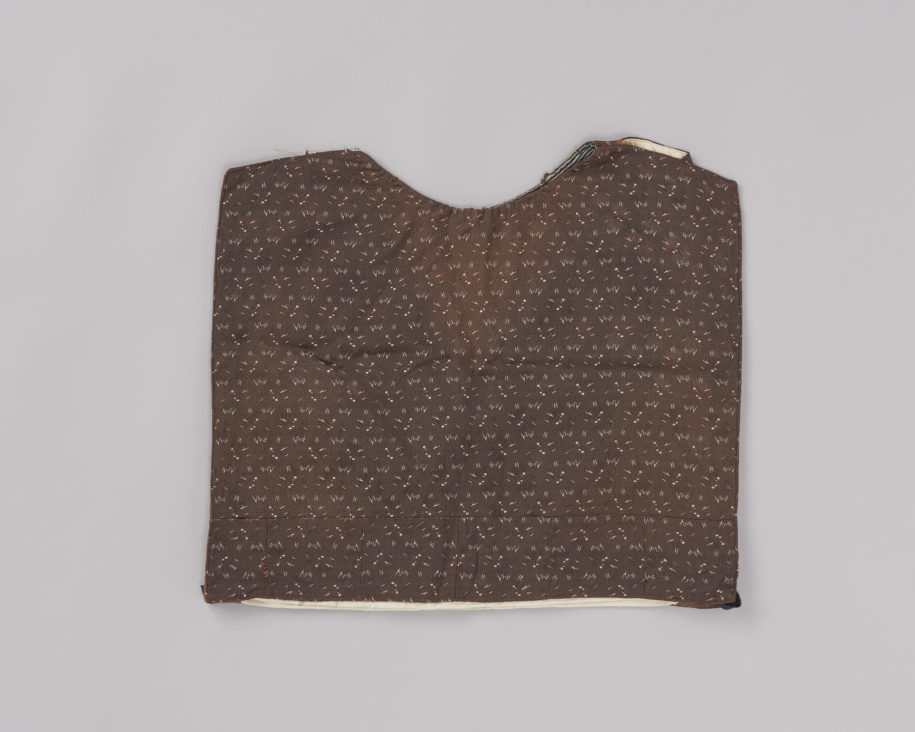 Machinaal genaaide bruine beuk met ingeweven abstract dessin. Het voorpand bestaat uit meerdere stukken. Het achterpand bestaat uit een stuk stof. Beide panden zijn gevoerd met een crèmekleurige katoen, afgezet met een strook bruine stof aan de zijkanten van de panden. De hals is aan de binnenzijde afgewerkt met zwart-wit-blauw gestreept band. De beuk sluit ...