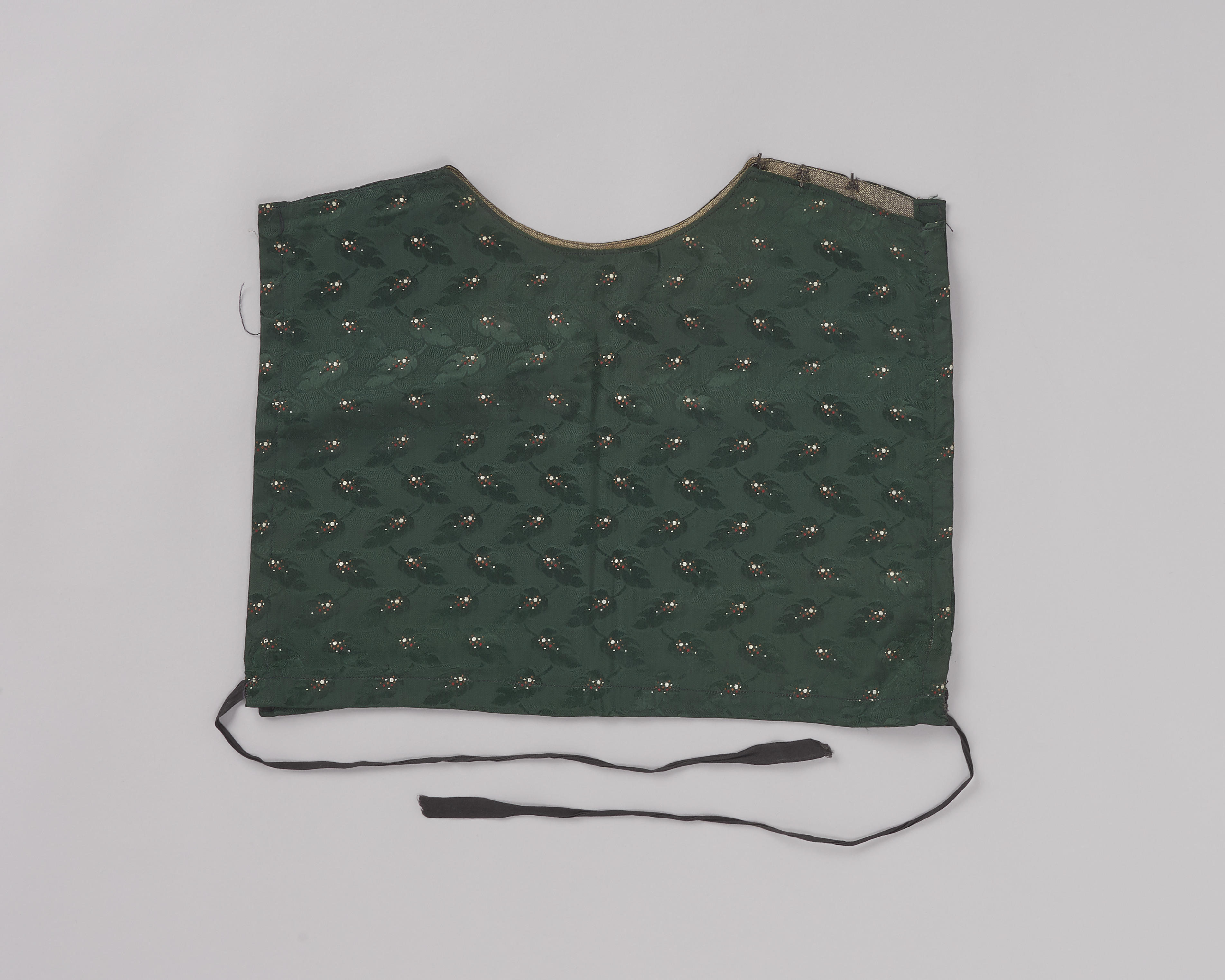 Machinaal genaaide groene beuk met een ingeweven slingermotief van bladeren, ingewerkt met enkele kleurige stipjes. Het voor- en achterpand zijn gevoerd met een bruin gemêleerde wollen stof. De beuk sluit op de rechterschouder met drie haken en ogen. Op de onderzoom van het achterpand zijn in de hoeken zwart katoenen banden horizontaal aangezet. Op het ...