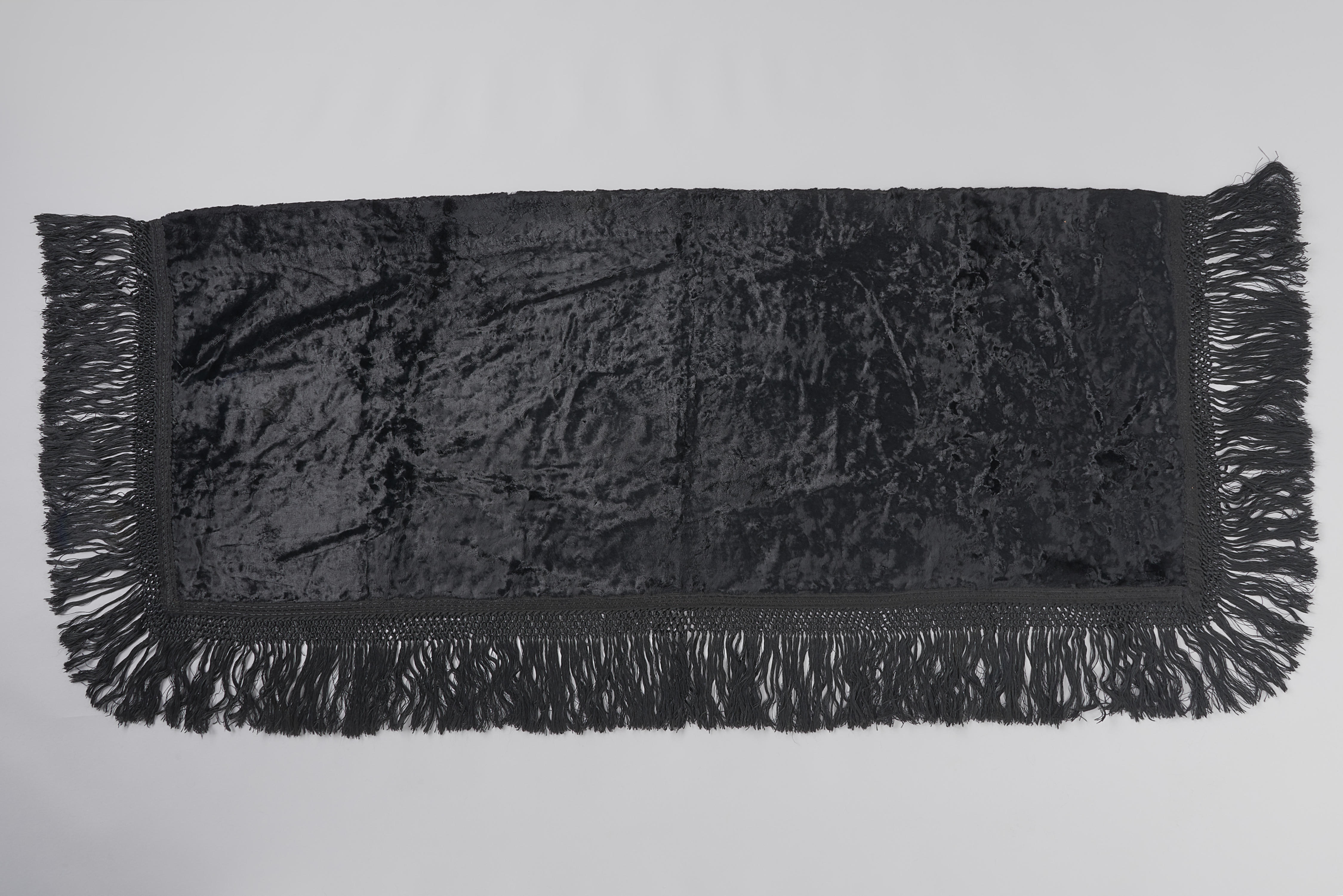 Rechthoekige omslagdoek van zwarte pluche, gedragen als bescherming tegen de kou door Wilhelmina Dina van de Linde (1886-1973) uit Wolphaartsdijk bij de protestantse Zuid-Bevelandse streekdracht. De pluche stof heeft een grijszwart katoenen basisweefsel. De doek is gevoerd met grijszwarte katoen, geweven in satijnbinding. De voering is aan drie zijden met de hand tegen de doek ...