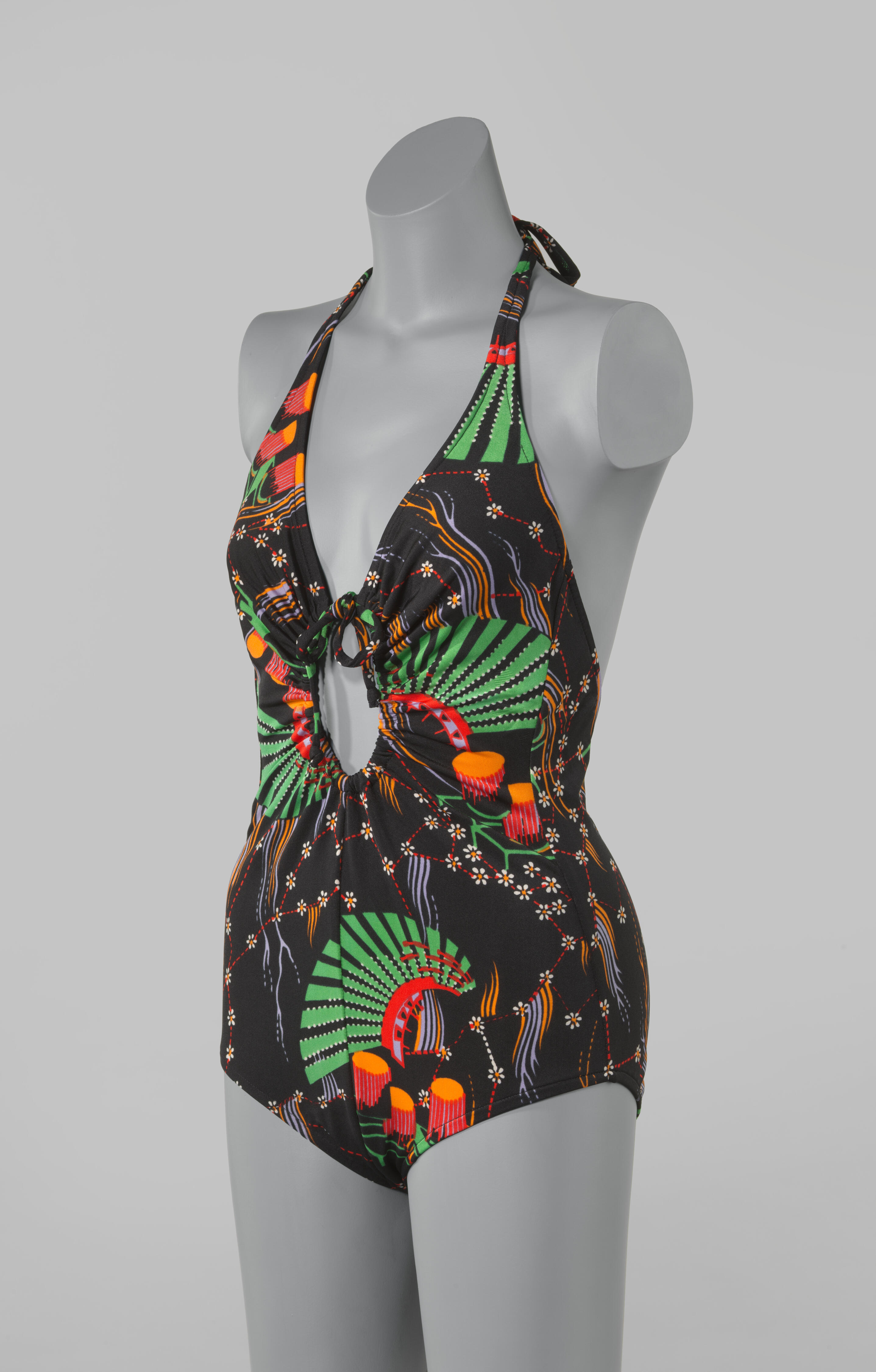 Badpak van synthetische stof, bedrukt met groene straalmotieven, witte bloemen en cilindermotieven in oranje en rood op een zwart fond. Het badpak is een hoog opgesneden model met middenvoor een ronde uitsparing met een aantrekbaar lintje tussen de boezem. Het badpak sluit met twee smalle strikbanden achter in de nek. De rug heeft een lage, ...