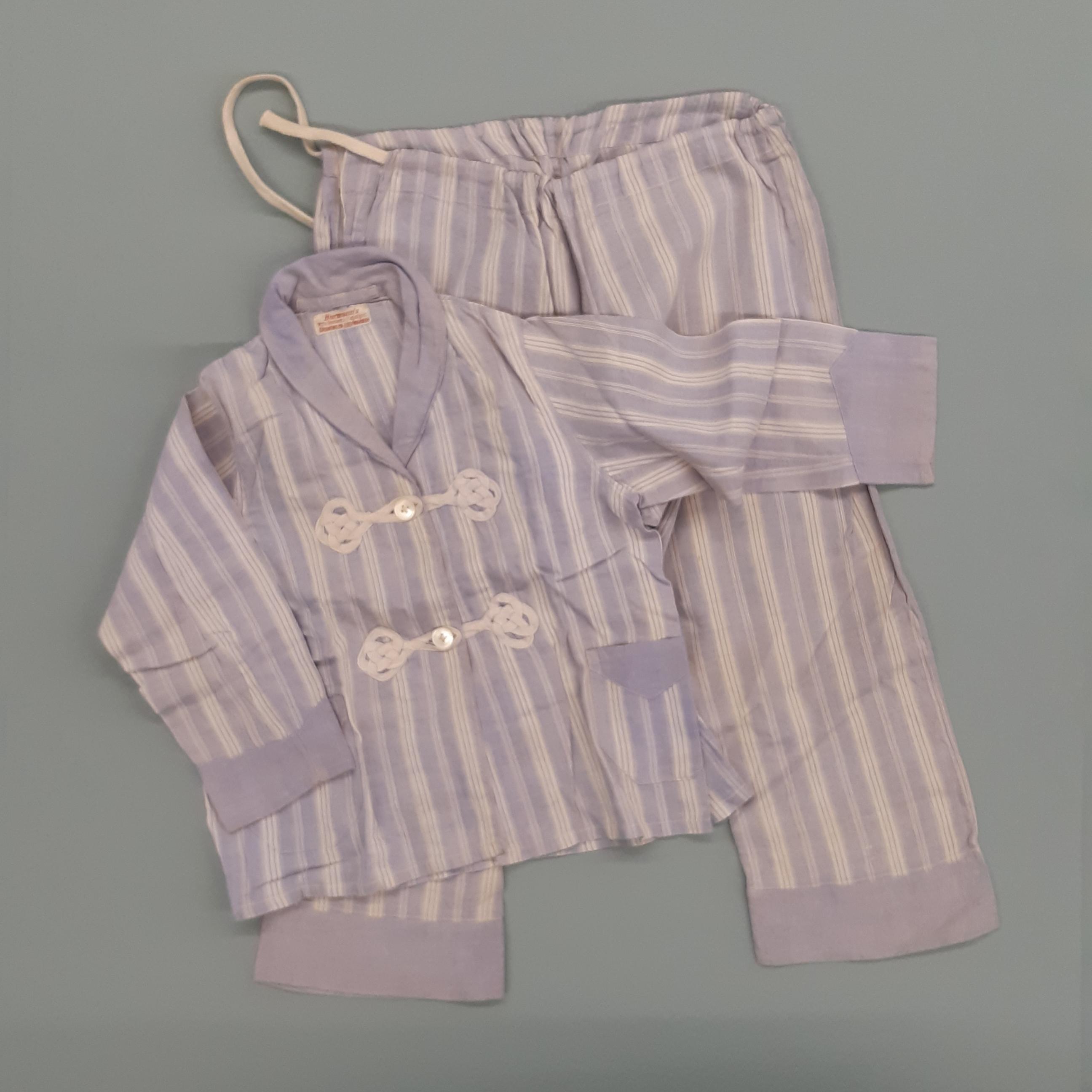Pyjama van blauw-wit gestreepte katoenen stof, bestaande uit een jasje en een lange broek, gedragen door een meisje. De pyjama is gekocht bij de firma Burmann, die nacht- en ondergoed in het assortiment had. De onderneming had winkels in Leeuwarden en Groningen. Het label van deze onderneming bevindt zich in het jasje van de pyjama.