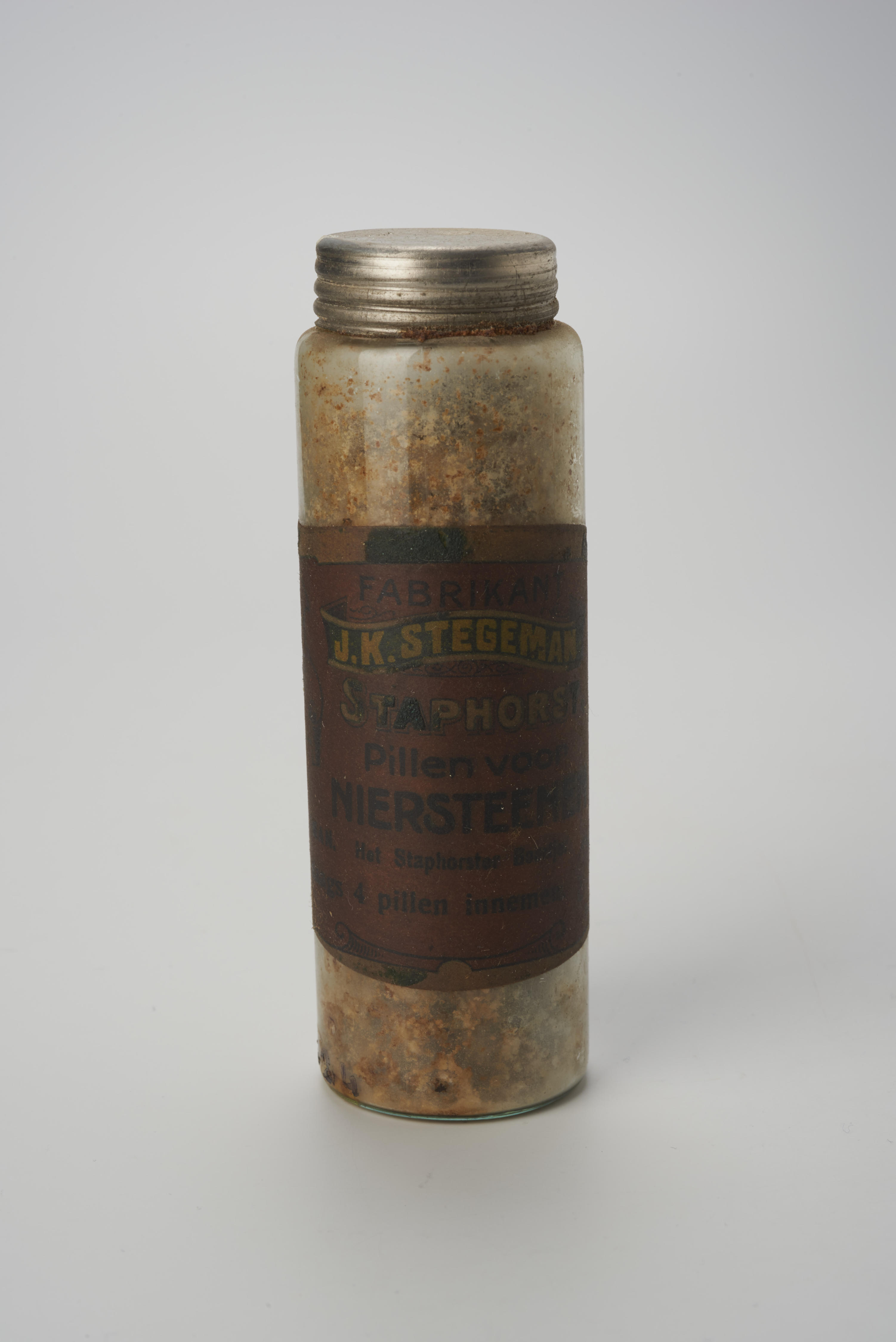 Flesje met pillen tegen nierstenen van fabrikant J.K. Stegeman uit Staphorst.