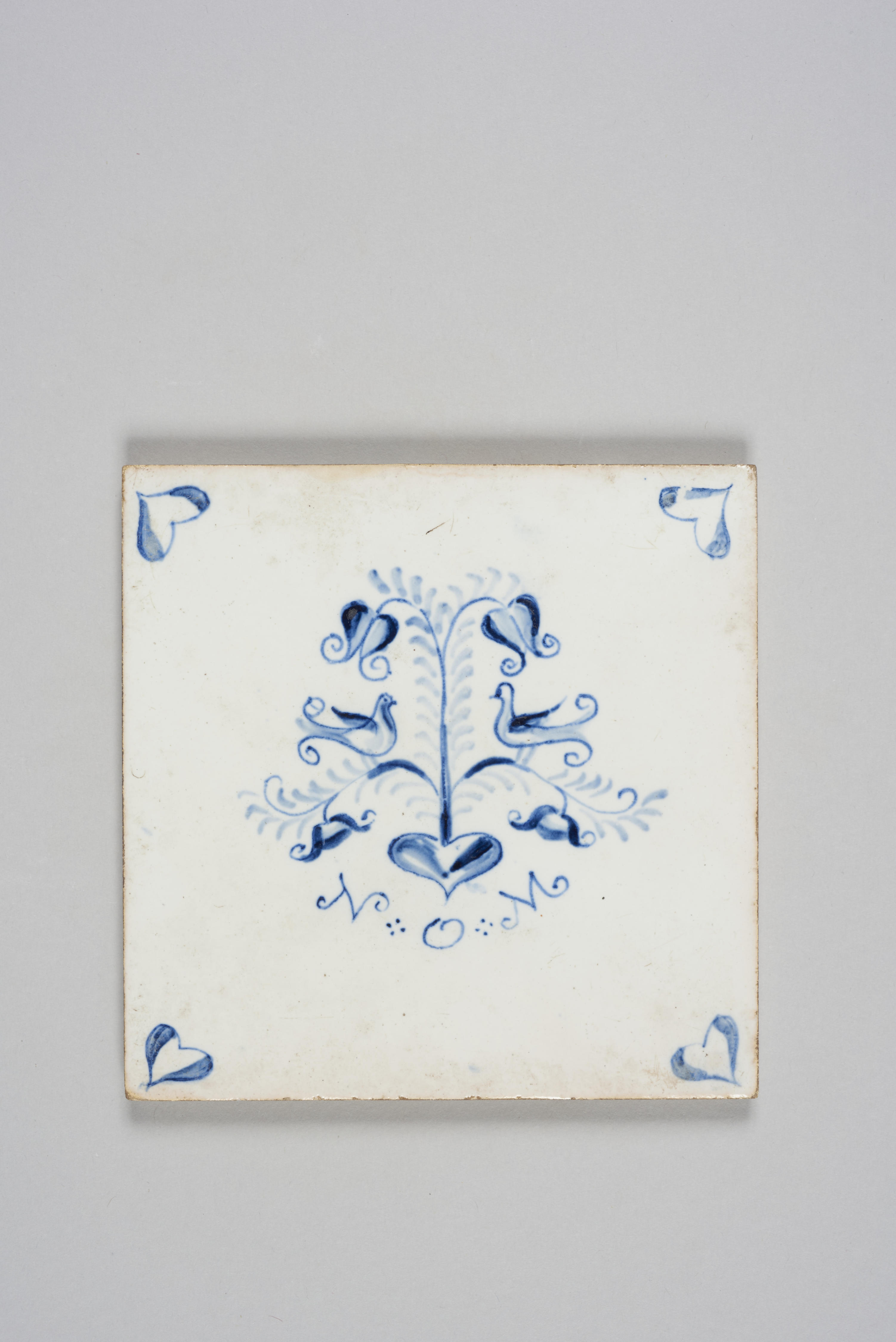 Wandtegel met een afbeelding van een hart waaruit een bloem met twee vogels ontspruit en onderaan het opschrift: 'N.O.M'; blauw; hoekmotief: hart. De tegel is in 1947 gemaakt als monster voor het museum om als souvenir te verkopen.