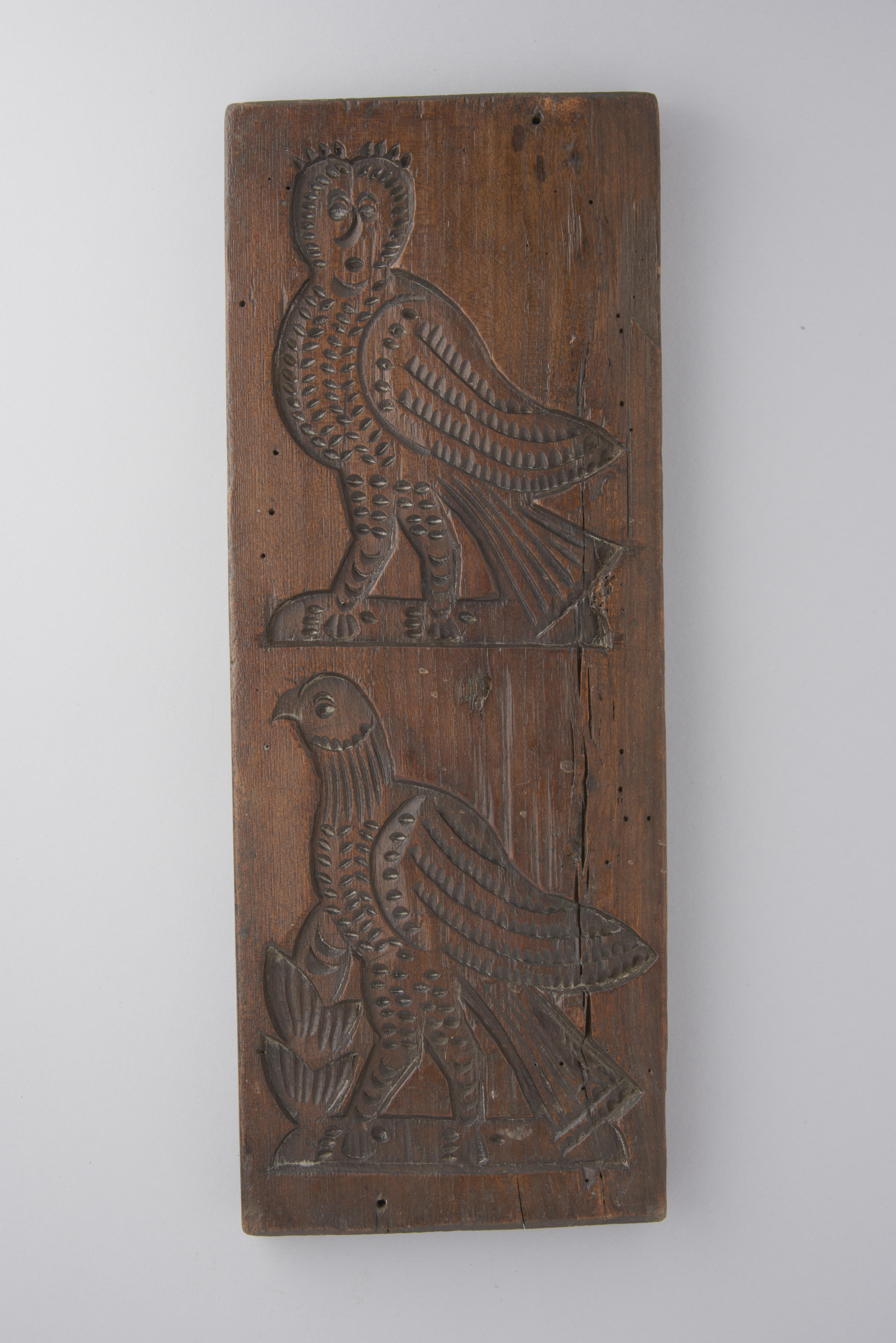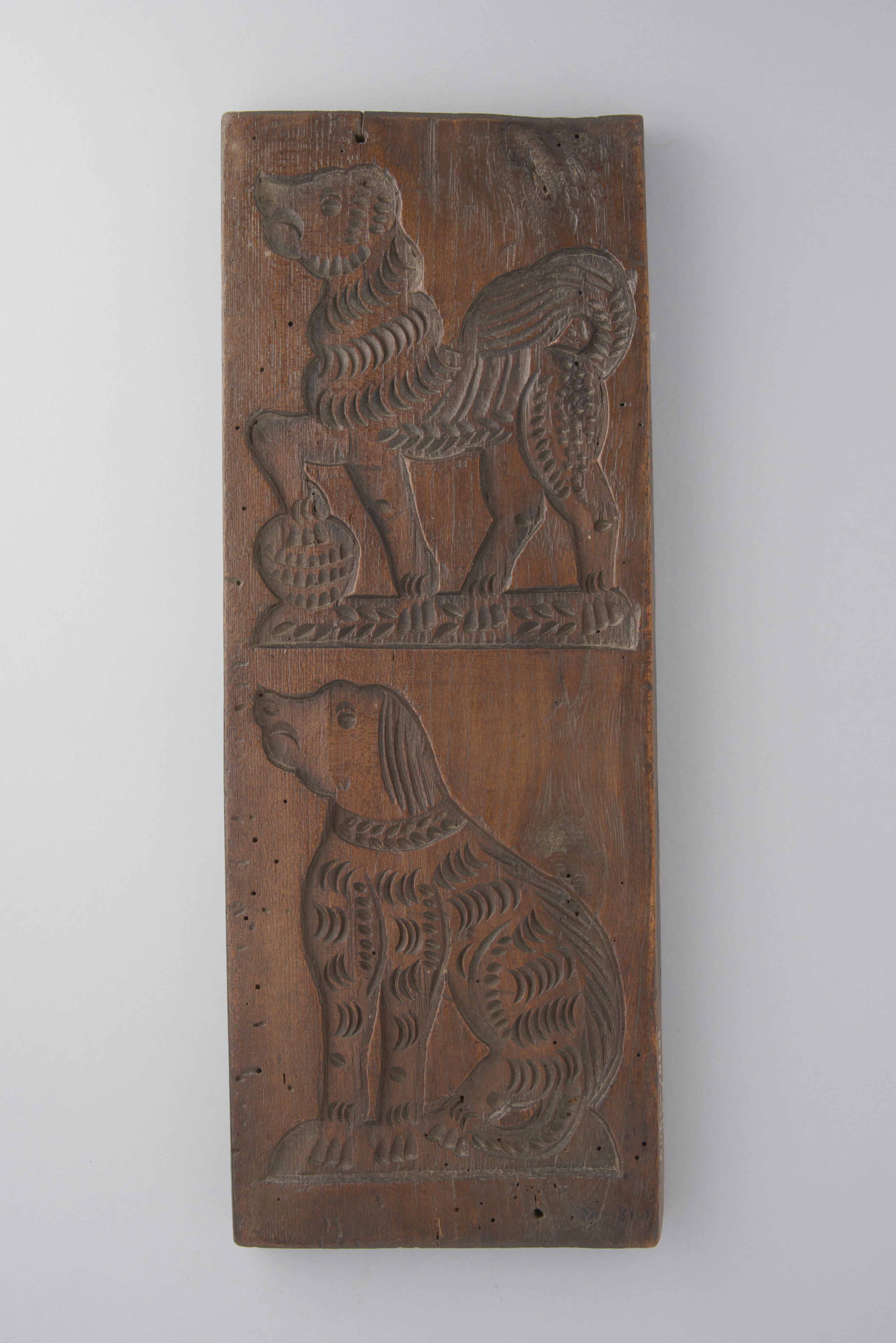 Essenhouten koekplank. De plank is aan één zijde besneden met twee hondenfiguren, waarvan één met een bal onder zijn poot. De andere zijde van de plank is besneden met twee vogelfiguren.