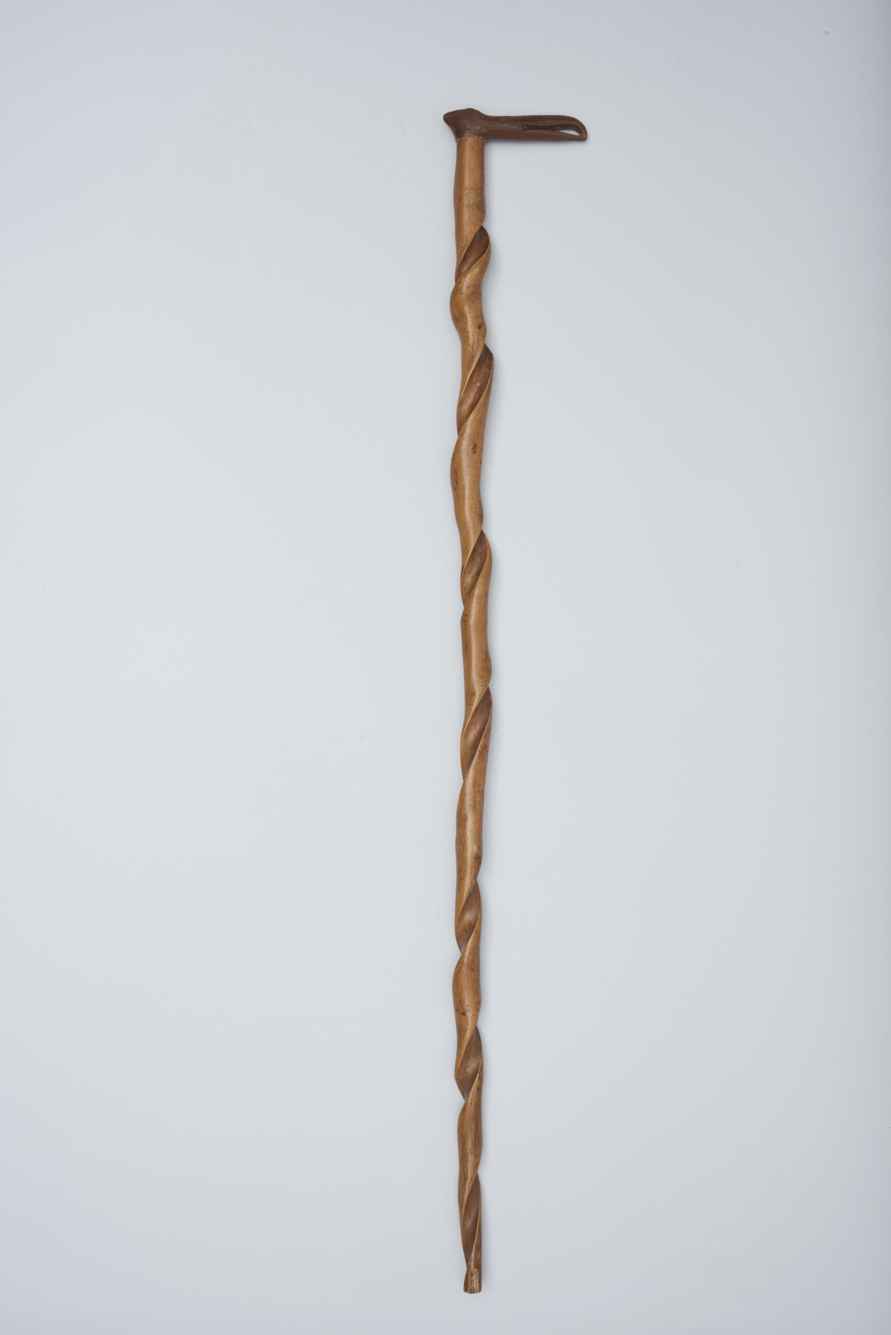 Getorste houten wandelstok met een handvat in de vorm van een vogelbek.