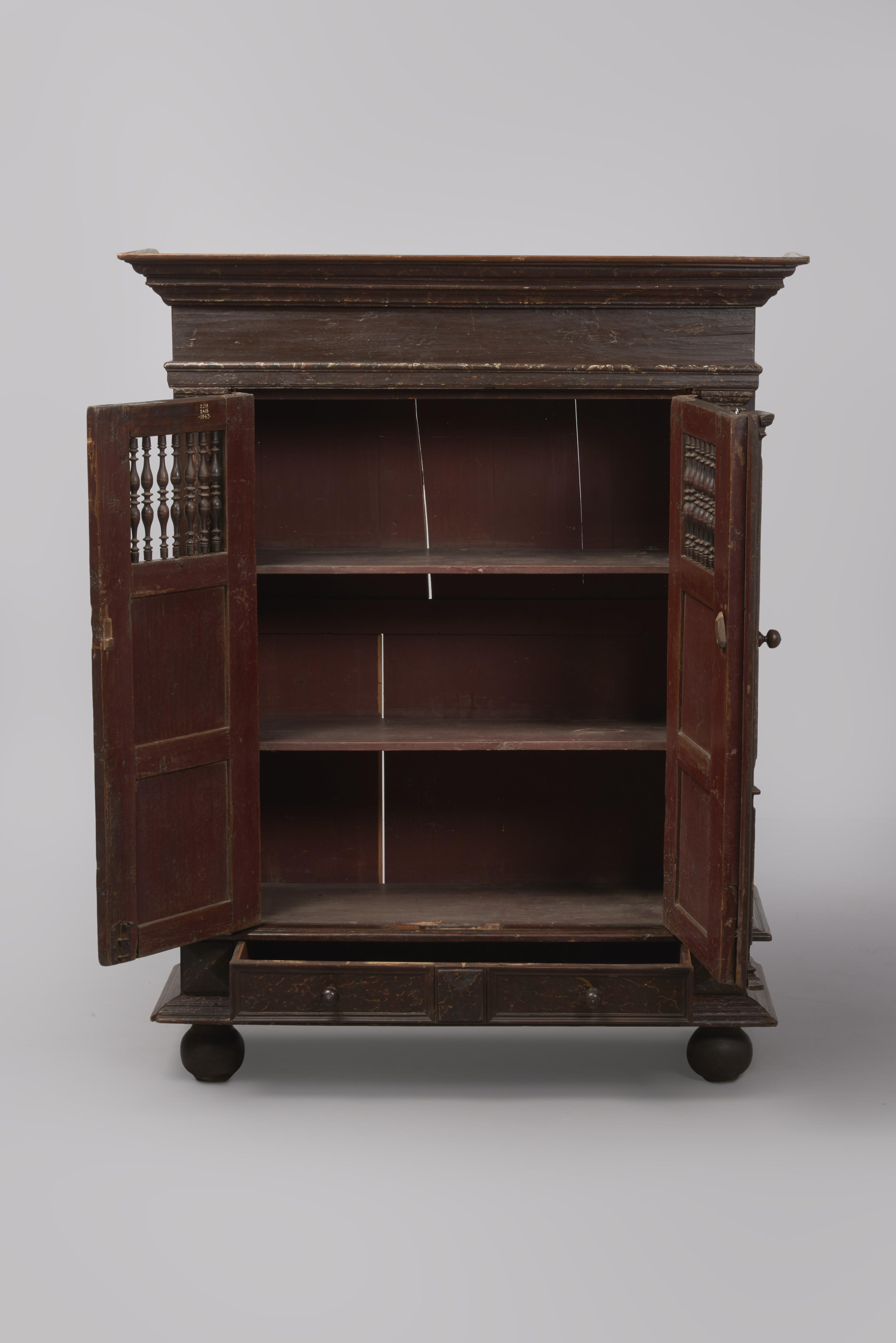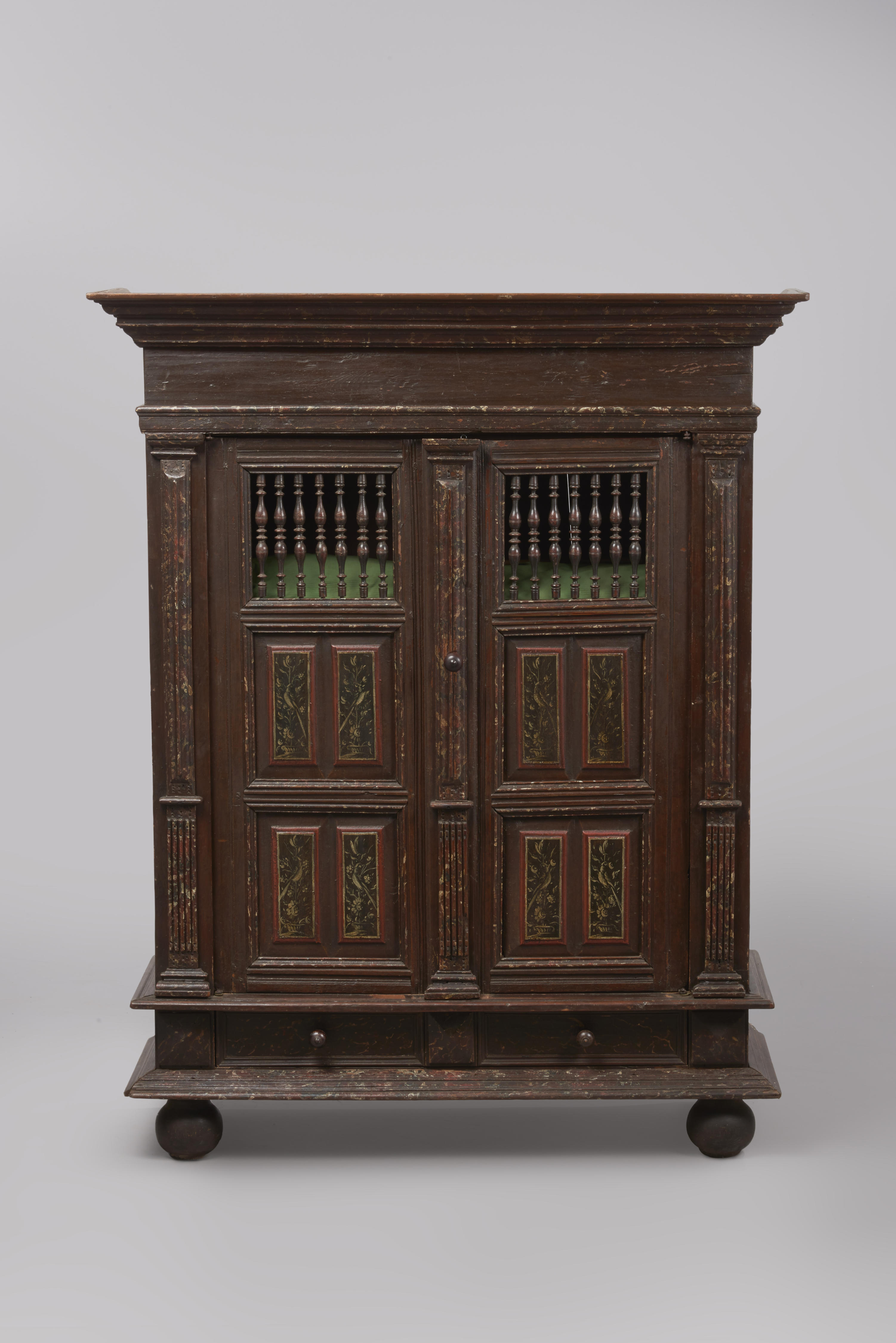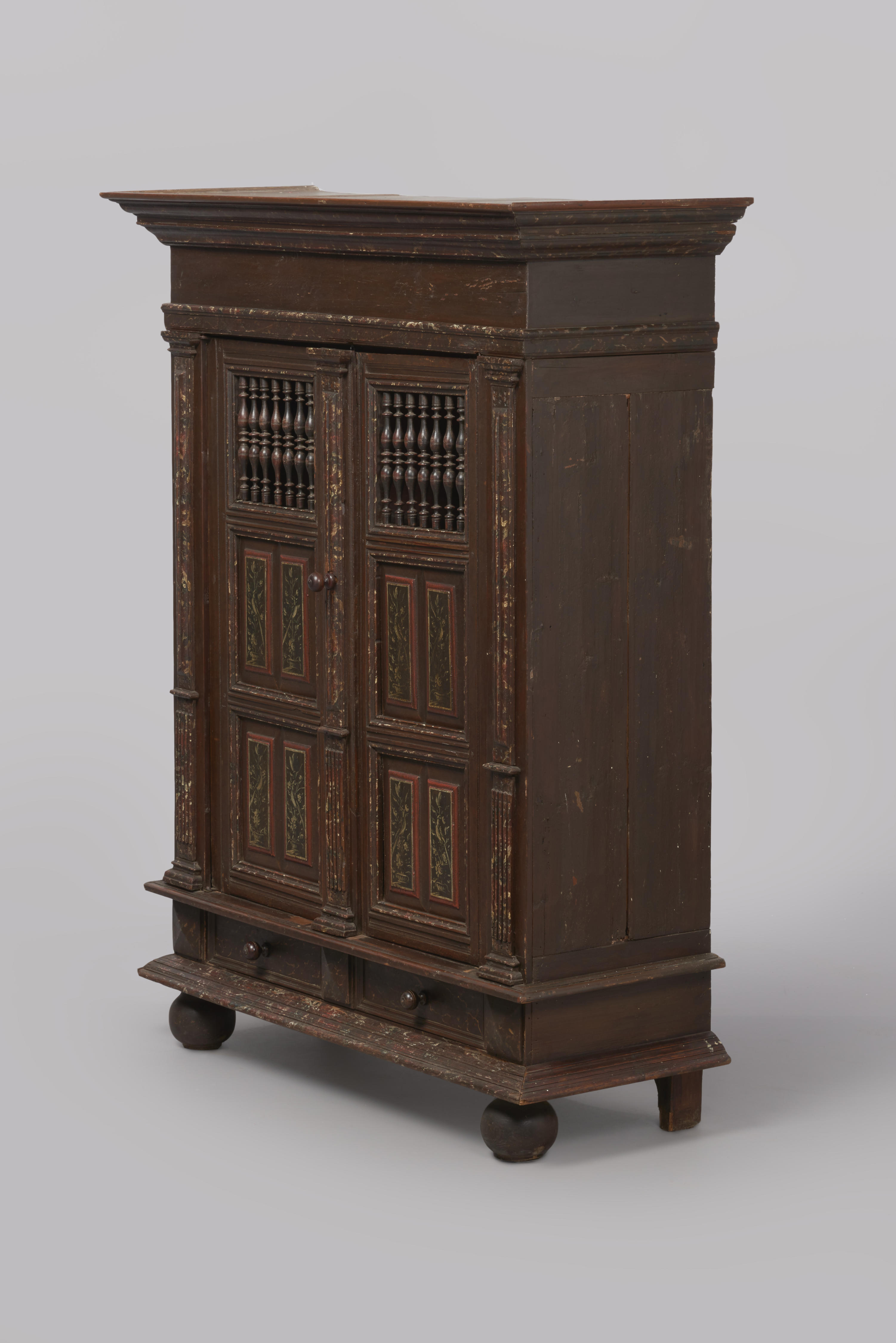 Naaldhouten spijlenkast. De voorzijde van de kast bestaat uit acht oudere onderdelen: de plint, de twee deuren, de deklijst boven de deuren, de kroonlijst, de twee pilasters links en rechts naast de deuren en de slaglijst. De gehele linker-, rechter-, boven- en onderzijde en de achterwand zijn er later omheen getimmerd om van de oude ...